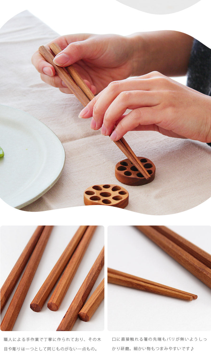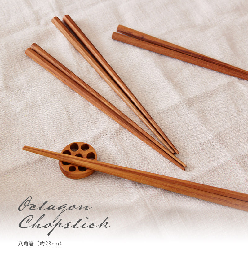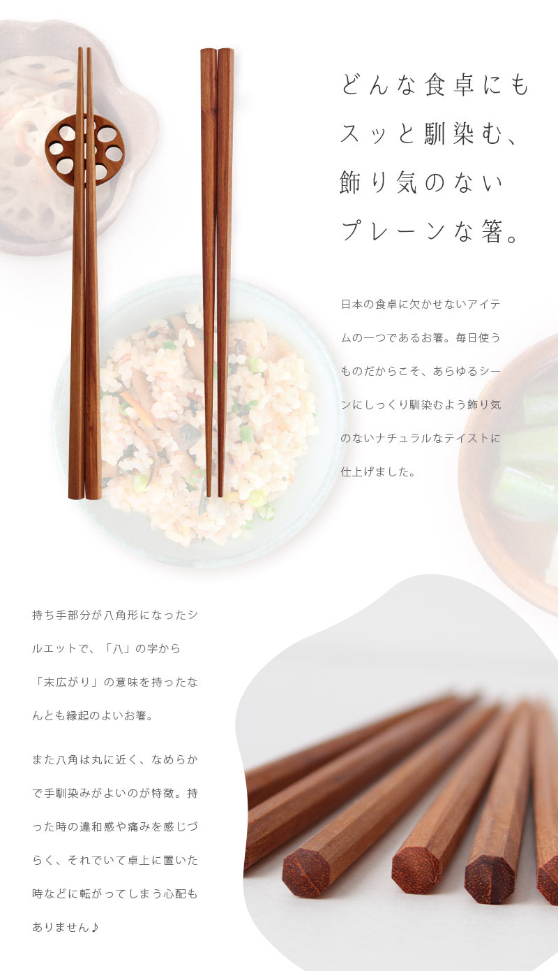 持ち手部分が八角形になったシルエットで、「八」の字から「末広がり」の意味を持ったなんとも縁起のよいお箸。また八角は丸に近く、なめらかで手馴染みがよいのが特徴。持った時の違和感や痛みを感じづらく、それでいて卓上に置いた時などに転がってしまう心配もありません♪箸先までゆるやかな八角形なので、ご飯はもちろん麺がつかみやすく食べやすい◎毎日使うものだからこそ、あらゆるシーンにしっくり馴染むよう飾り気のないナチュラルなテイストに仕上げました。