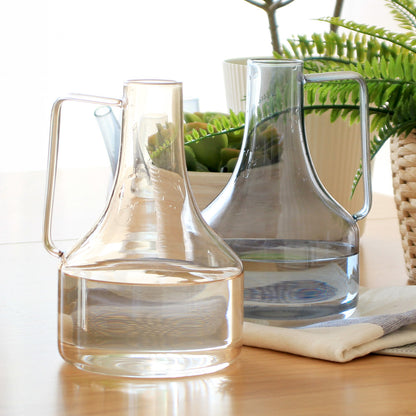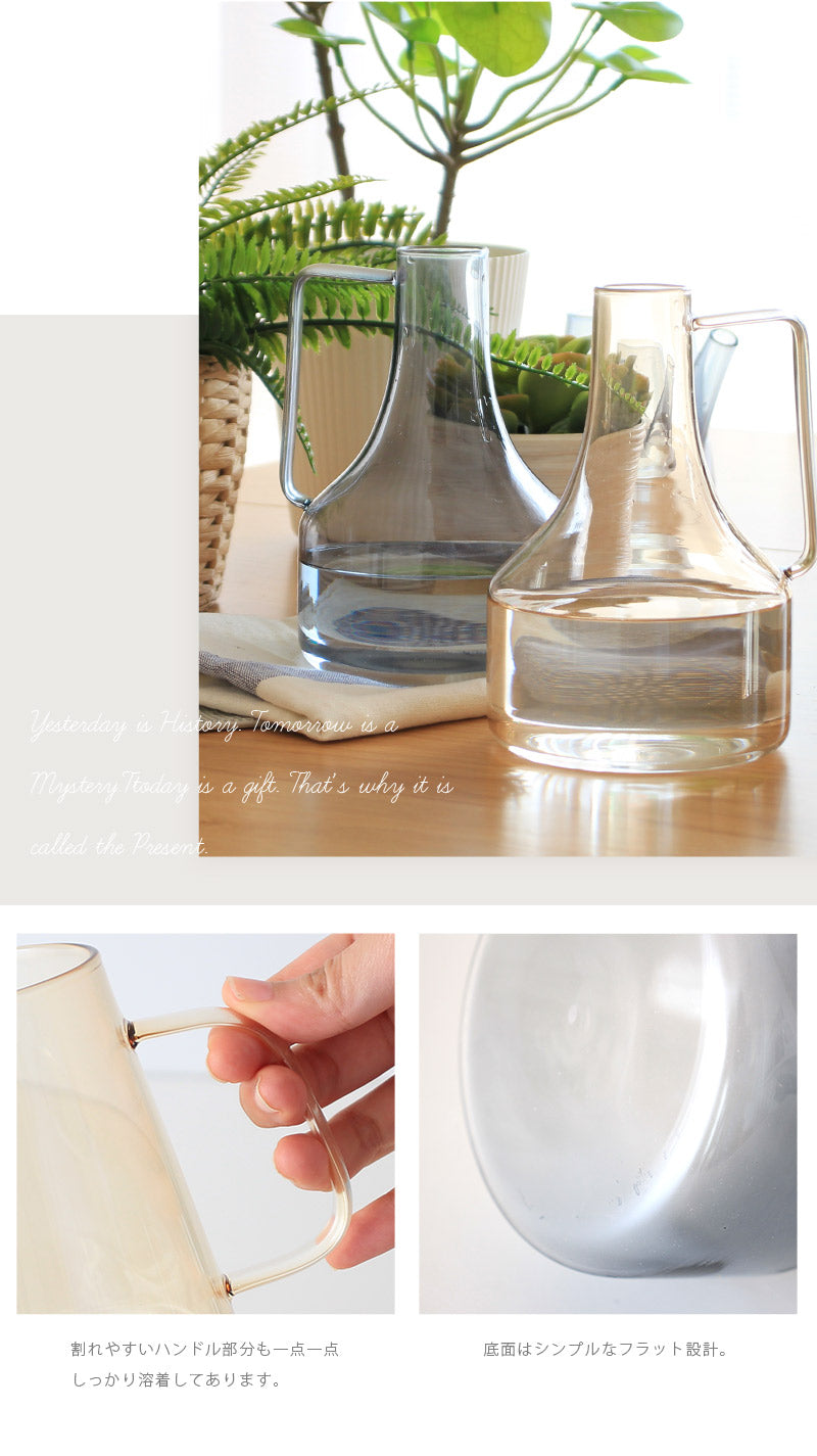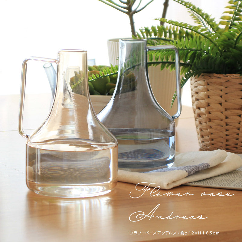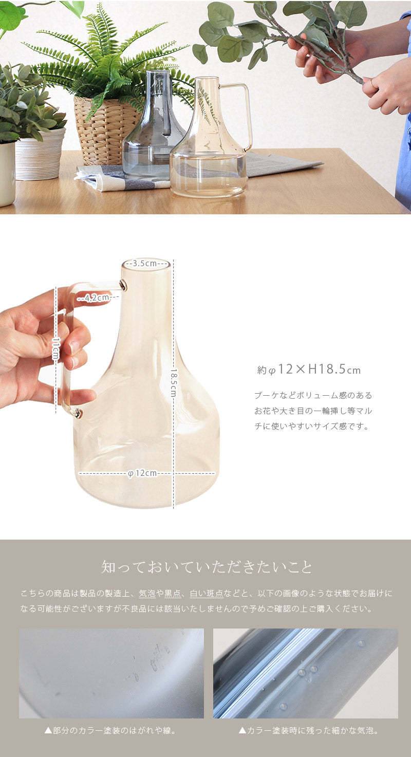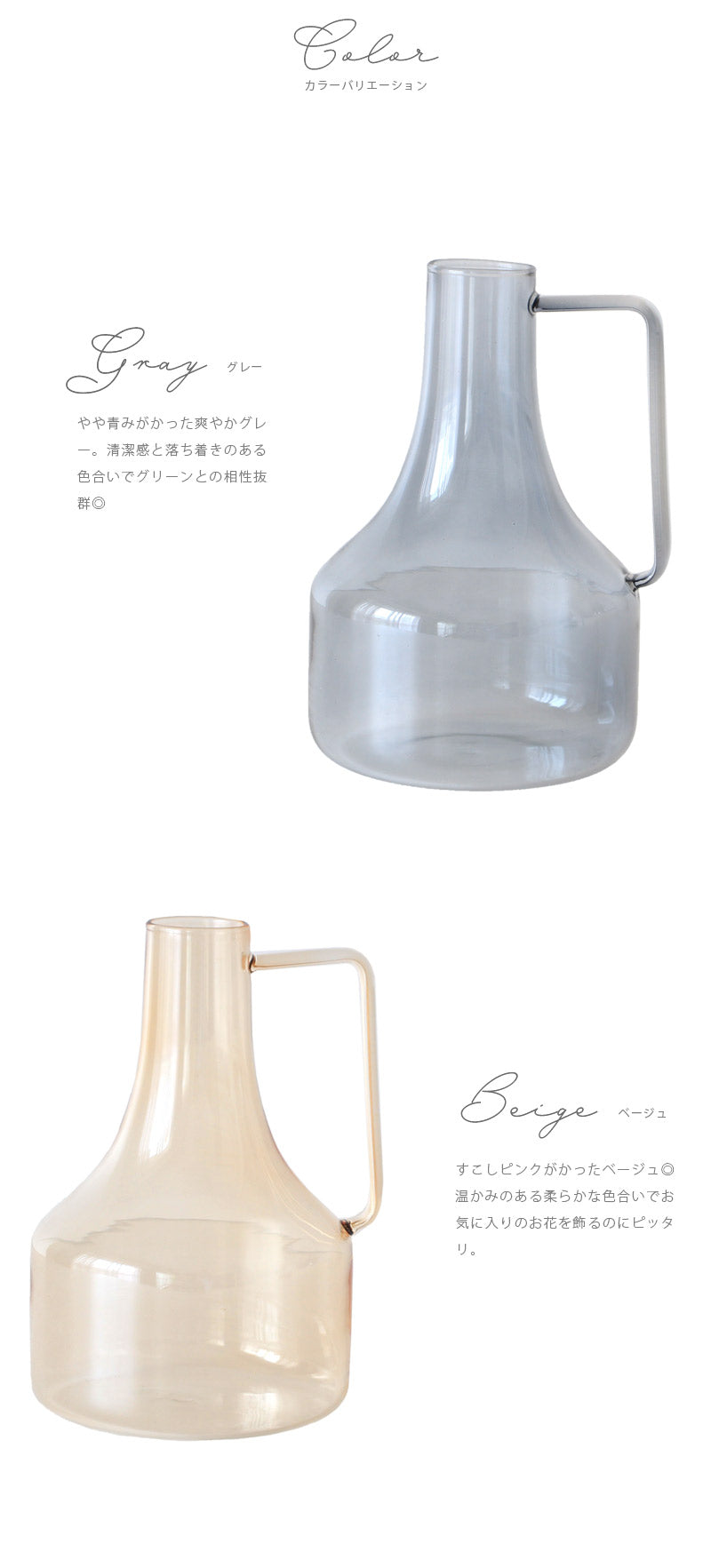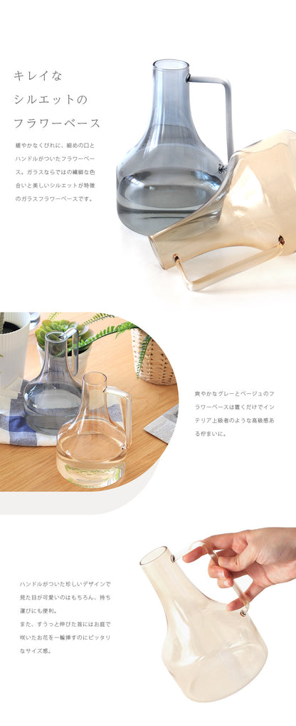 緩やかなくびれに、細めの口とハンドルがついたフラワーベース。ガラスならではの繊細な色合いと美しいシルエットが特徴のガラスフラワーベースです。爽やかなグレーとベージュのフラワーベースは置くだけでインテリア上級者のような高級感のある佇まいに。ハンドルがついた珍しいデザインで見た目が可愛いのはもちろん、持ち運びにも便利。すうっと伸びた首びはお庭で咲いたお花を挿すのにピッタリなサイズ感です。
