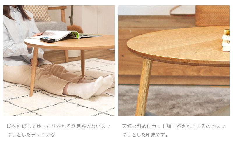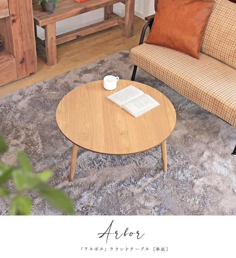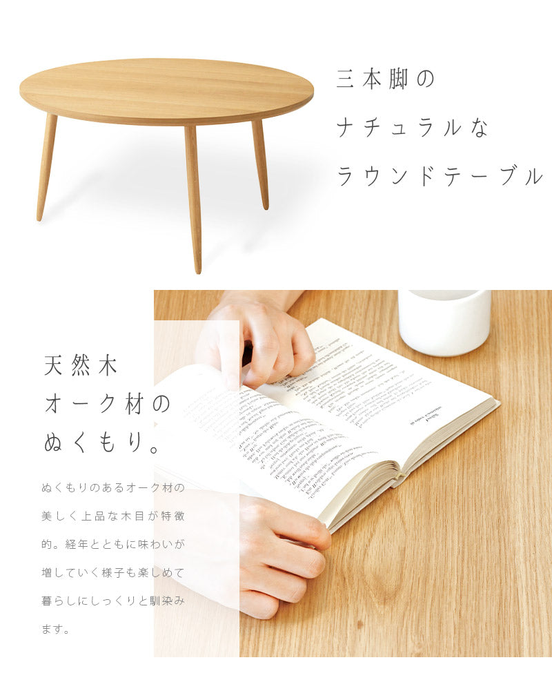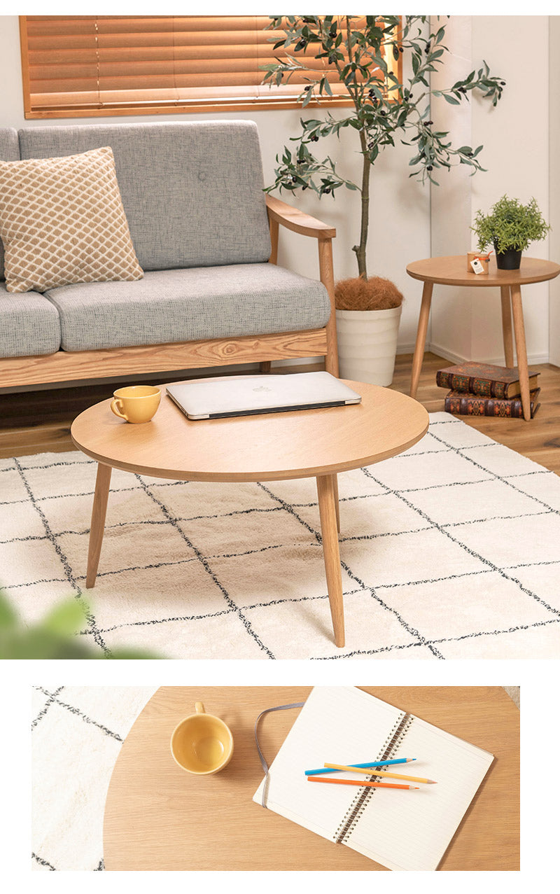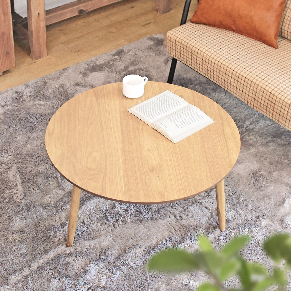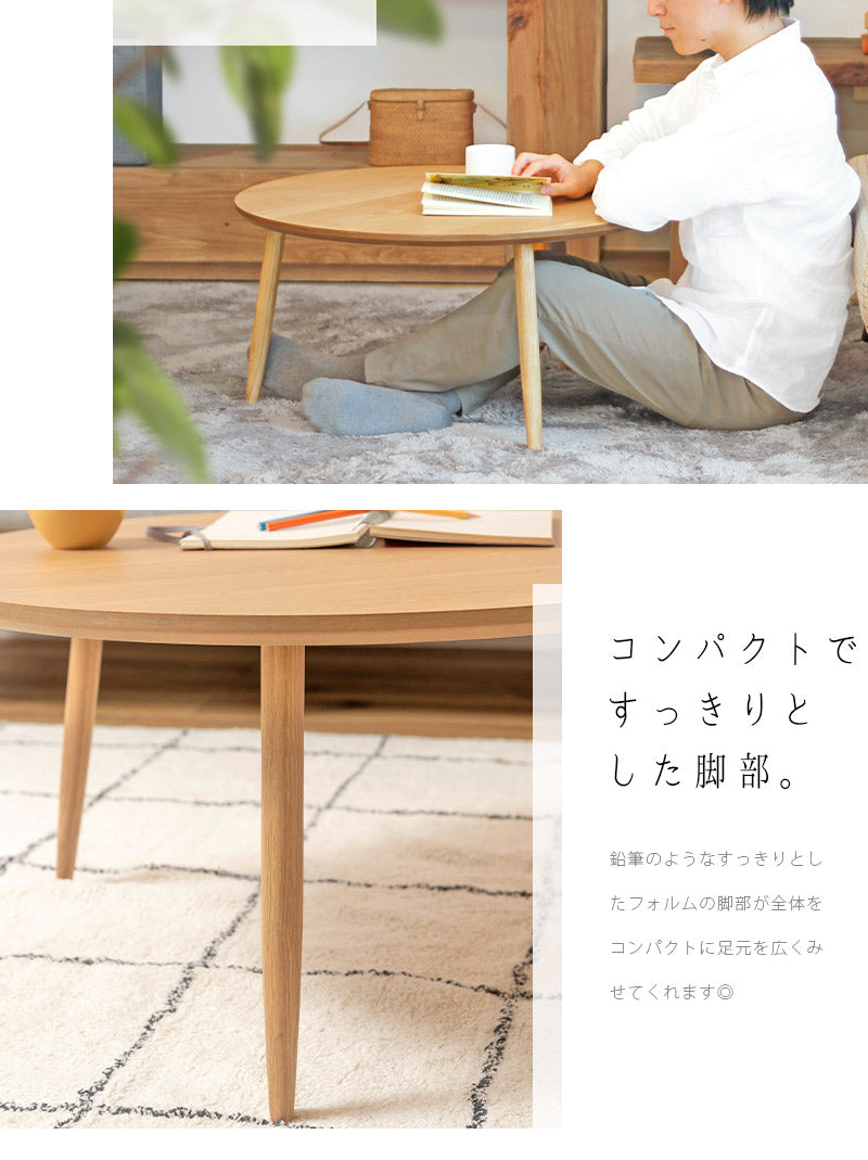 すっきりとした三本脚。ナチュラルなラウンドテーブル