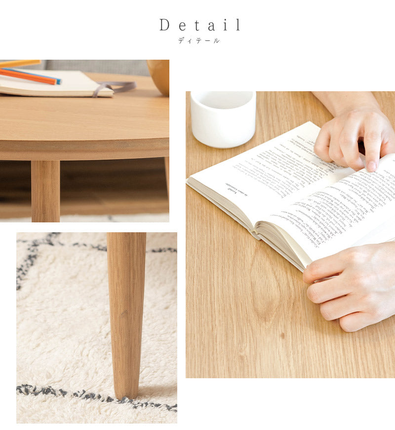 | 注意事項 | ●平坦な場所に安定させた状態で使用してください。 ●立ち座りの際に天板に手を付いたり、重量のある物を偏って置いたりする等の偏荷重を掛けた場合、テーブルが傾いたり転倒する場合がございます ※天然木の特性によりキズや擦れなど個体差があります。風合いとしてお楽しみください。 |