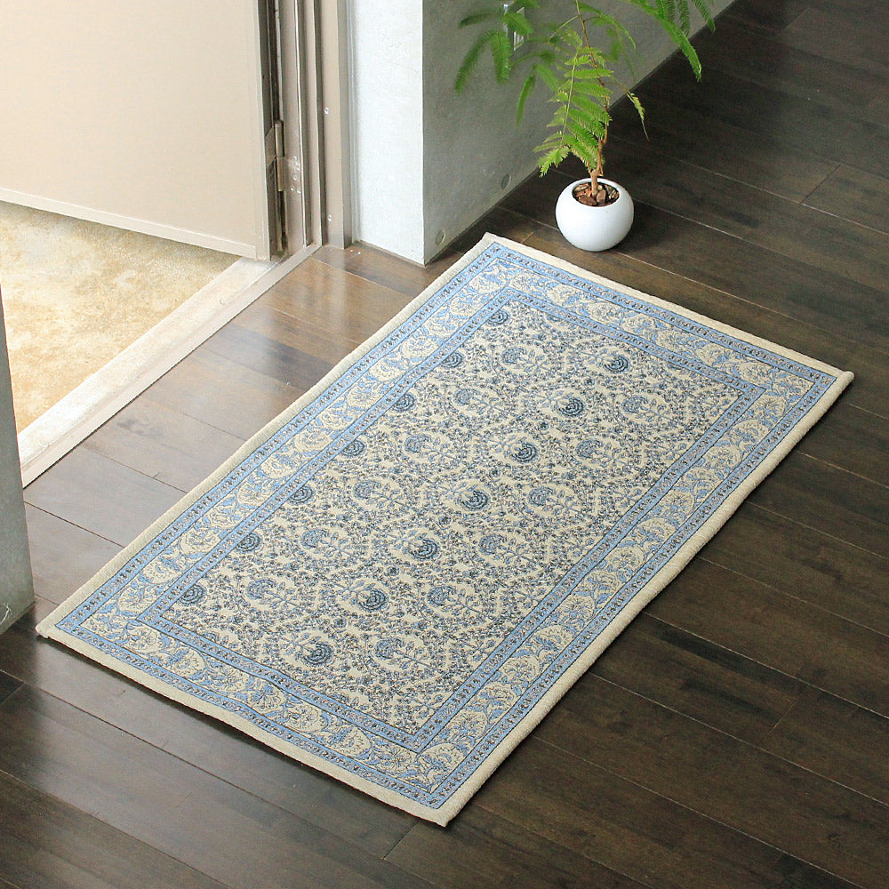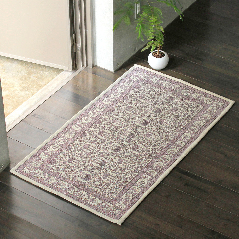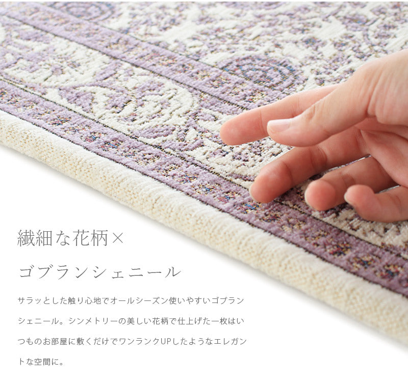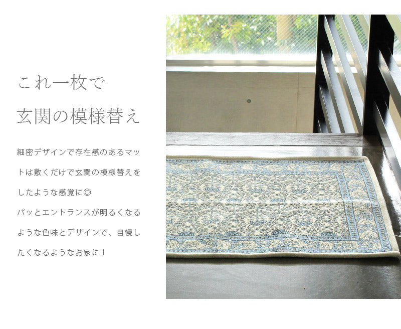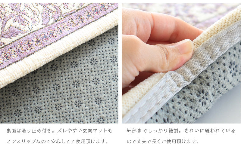 短毛でさらっとした肌ざわり。優れた通気性・吸水性でムシムシする夏場や暖房の効いた冬場でも使いやすく、年間を通して快適なゴブランシェニール。花柄を前面にあしらったデザインは高級感を漂わせ、いつもの空間をワンランクUPさせること間違いなし!どこかクラシカルでレトロな雰囲気はカジュアルはもちろんビンテージなど、どんなテイストの玄関にもアクセントとしておススメな一枚です。