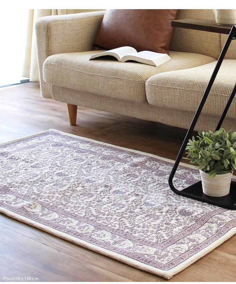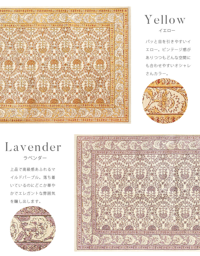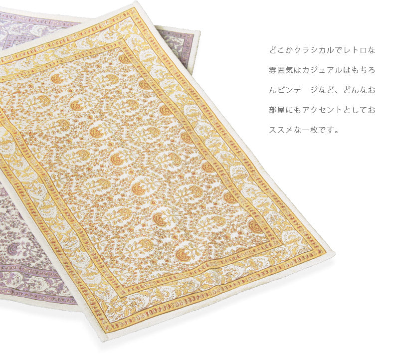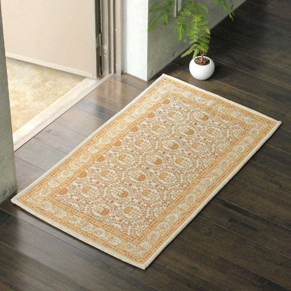 短毛でさらっとした肌ざわり。優れた通気性・吸水性でムシムシする夏場や暖房の効いた冬場でも使いやすく、年間を通して快適なゴブランシェニール。花柄を前面にあしらったデザインは高級感を漂わせ、いつもの空間をワンランクUPさせること間違いなし!どこかクラシカルでレトロな雰囲気はカジュアルはもちろんビンテージなど、どんなテイストの玄関にもアクセントとしておススメな一枚です。