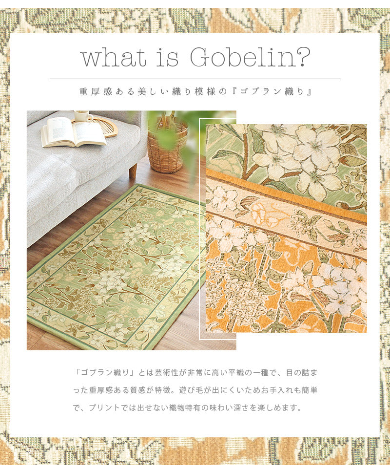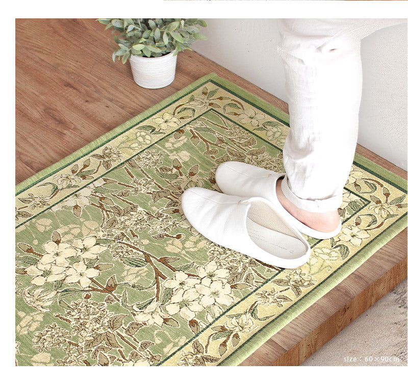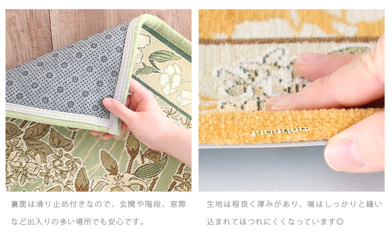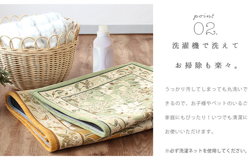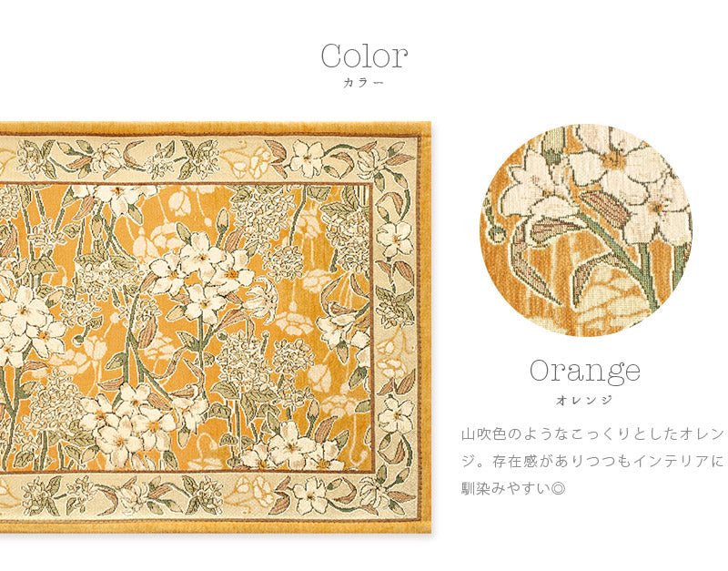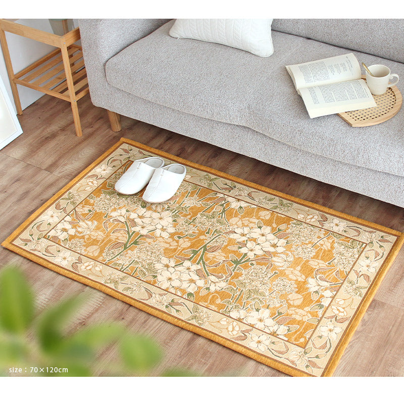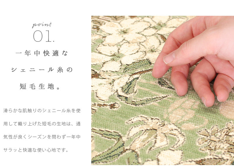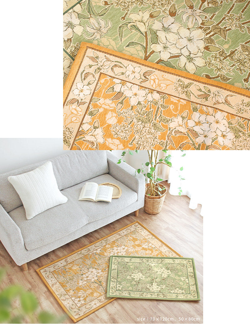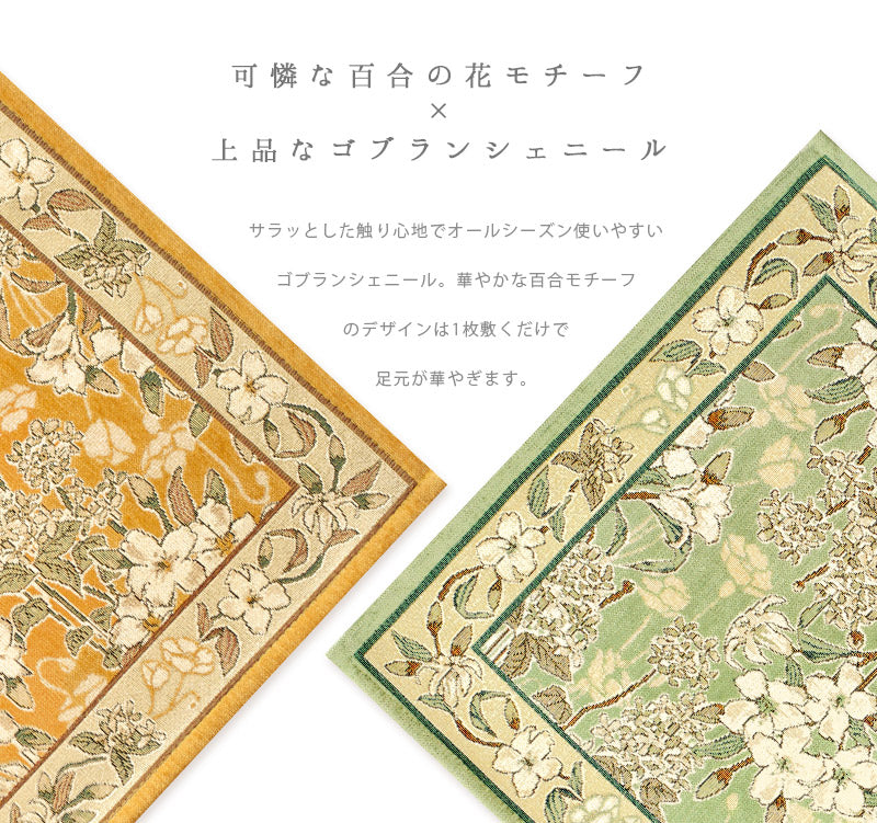滑らかな肌触りのシェニール糸を使用して織り上げた短毛の生地は、通気性が良くシーズンを問わず一年中サラッと快適な使い心地です。可憐な百合の花をモチーフに仕上げた一枚は敷くだけでお部屋が華やぎます。更に洗濯機OKなので、うっかり汚してしまってもご家庭で丸洗いできていつでも清潔◎(必ず洗濯ネットをご使用ください。)お部屋のアクセントになり、こなれ感の出せる一枚です。