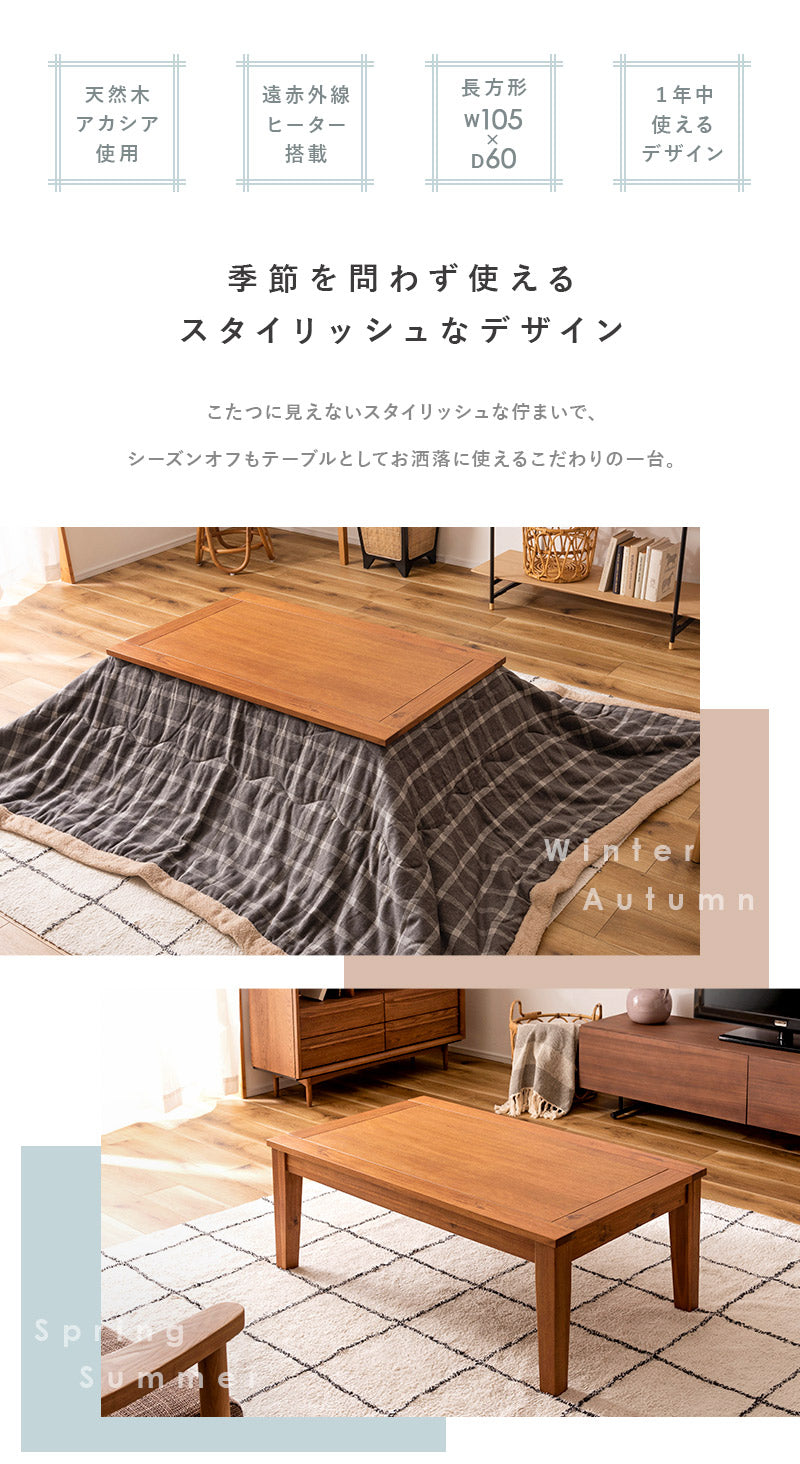 こたつに見えないスタイリッシュな佇まいで、シーズンオフもテーブルとしてお洒落に使えるこだわりの一台。天然アカシア材を使用し、深みのある美しい木目が楽しめます。1人でも2人でも使いやすい幅105cmの長方形タイプで、食事や仕事、勉強などマルチに使える便利なサイズ感♪ こたつとして使わないときは天板を固定できたり、内側のヒーターが見えづらい構造だったりと、テーブルとしての使いやすさにもこだわりました。また、こたつはエアコンなどの他の暖房器具に比べ電気使用量が少なくとっても省エネ!冬の節電対策にぴったりで、空気ではなく身体を直接暖める遠赤外線の石英管ヒーターがじんわりと芯まで暖めてくれます。