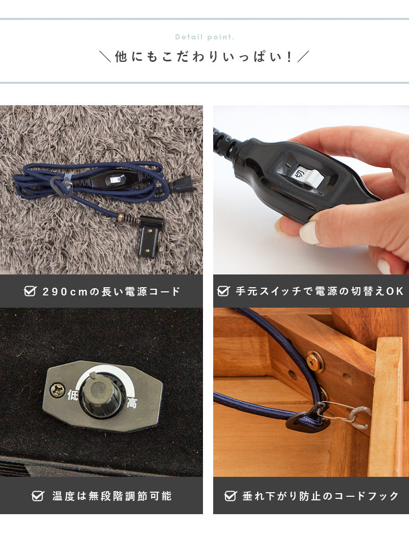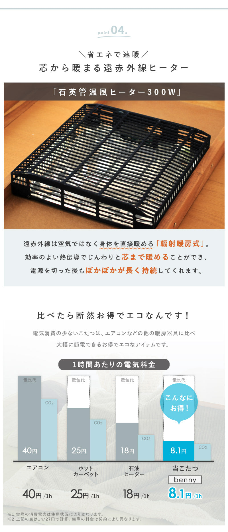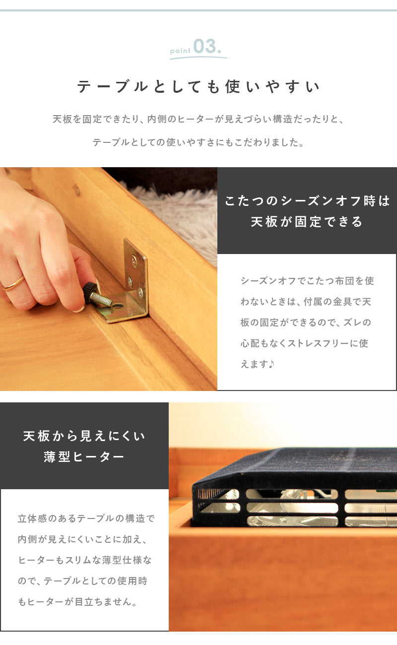 | お手入れ方法 | ●300W石英管ハーフヒーター ●天板固定ネジ付き ●メーカー1年保証 ●組立式(組立時間約10分) ※こたつテーブル単体販売となります。 こたつ布団は別売です。 |
