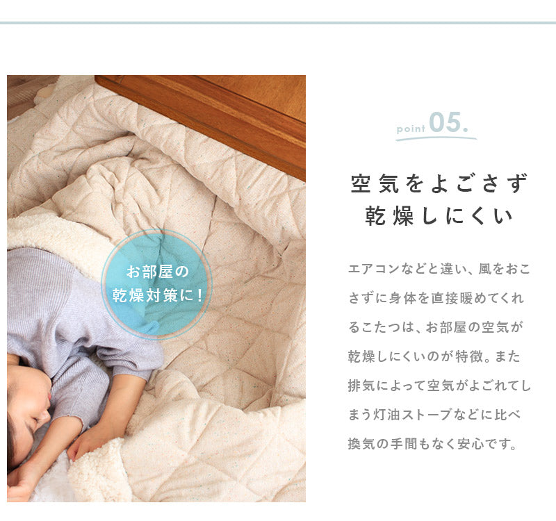こたつの遠赤外線は空気ではなく身体を直接暖める「輻射暖房式」。効率のよい熱伝導でじんわりと芯まで暖めることができ、電源を切った後もぽかぽかが長く持続してくれます。