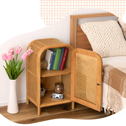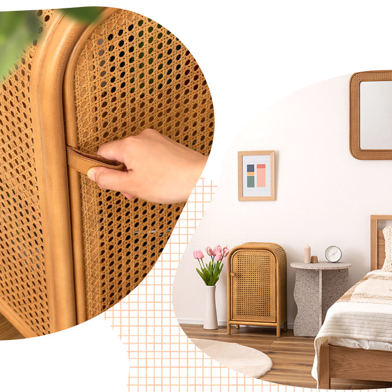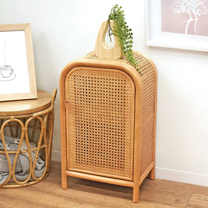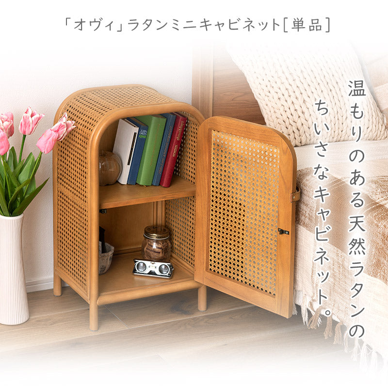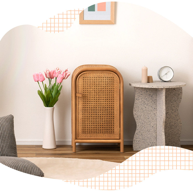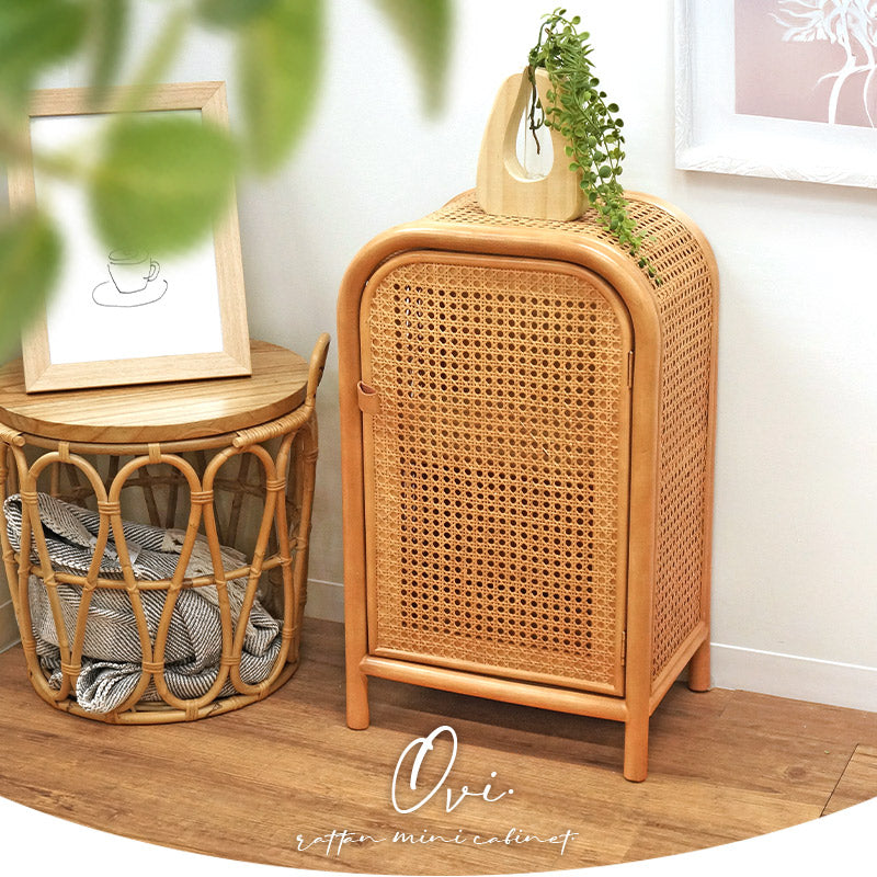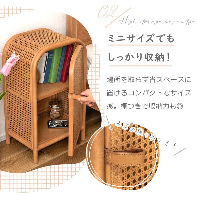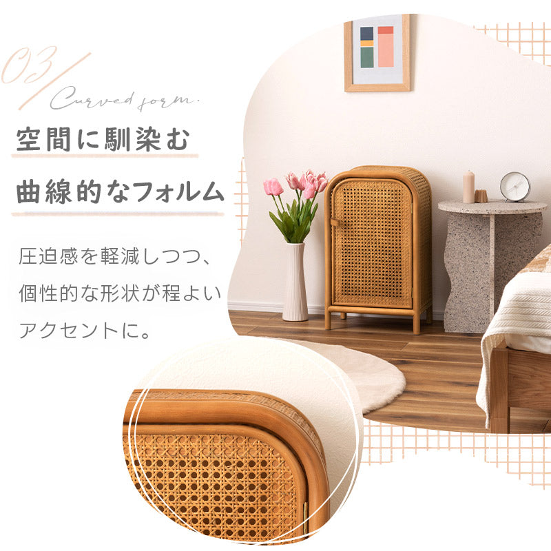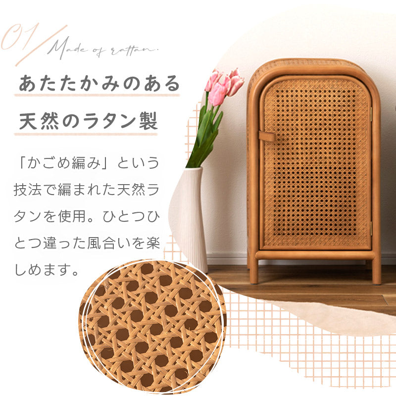 「かごめ編み」という技法で編まれた天然ラタンを使用。ひとつひとつ違った風合いが味わい深く、じっくり使って育てて経年変化を楽しめる素材です。場所を取らず省スペースに置けるコンパクトなサイズ感で、棚つきだから収納力もばっちりです◎空間に馴染む曲線的なフォルムは圧迫感を軽減しつつ、個性的な形状が程よいアクセントに。床との接地面が少ないので埃も溜まりにくくお掃除もしやすい♪組立不要の完成品なので届いてすぐにお使いいただけます。