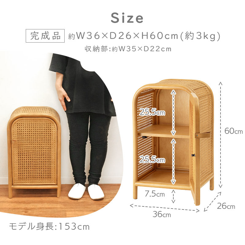 | サイズ | 約W36×D26×H60(重さ約3kg) 収納部:約W35×D22cm 耐荷重:約5kg(収納部) |