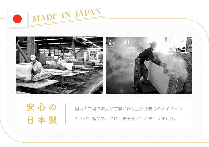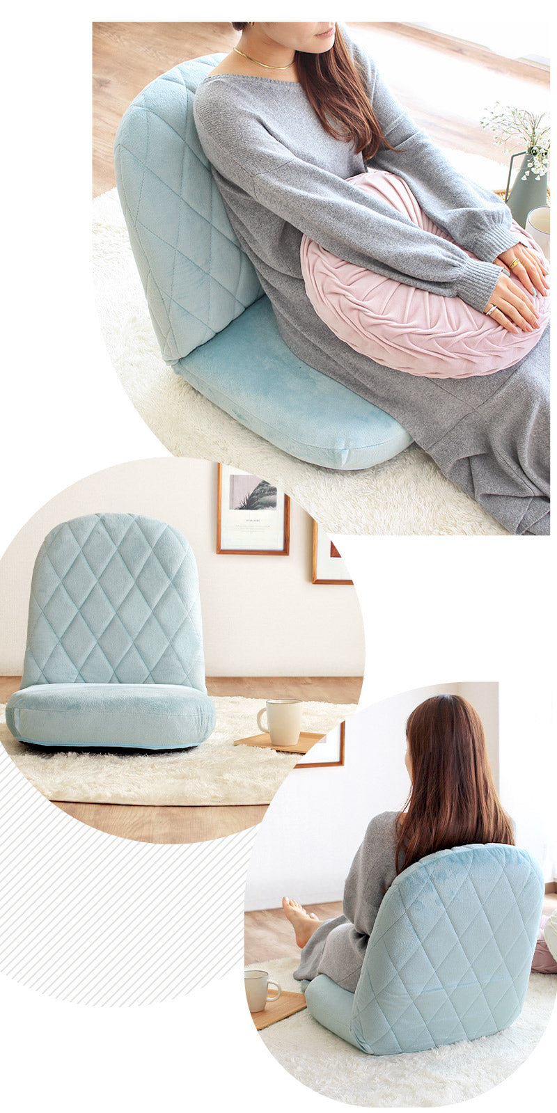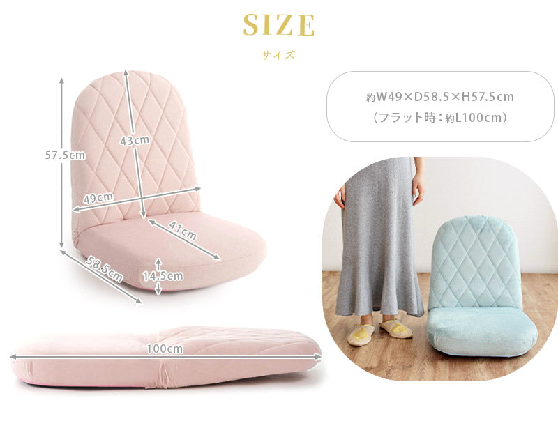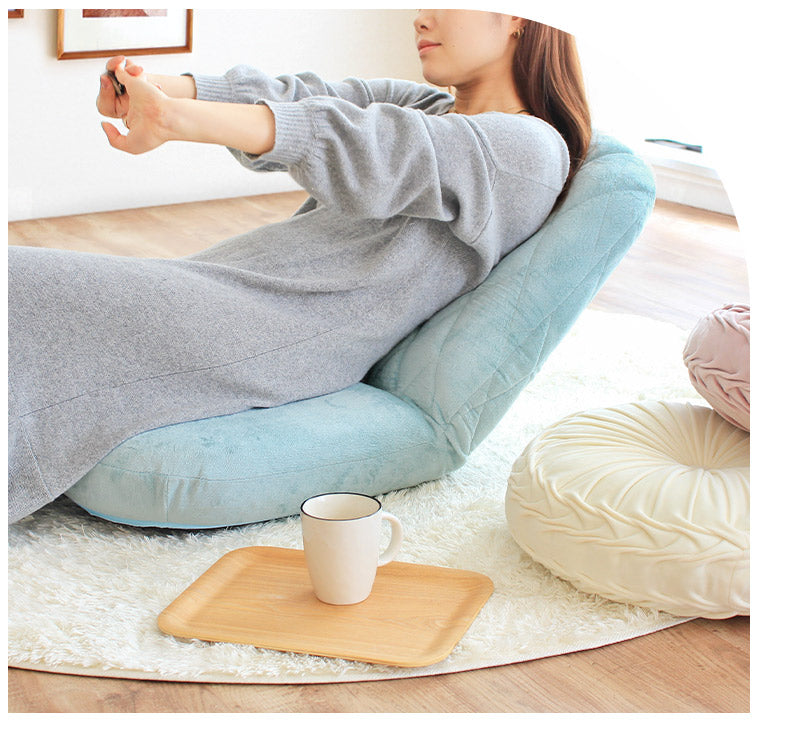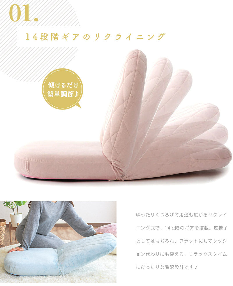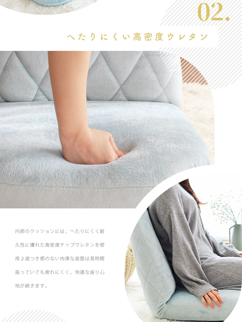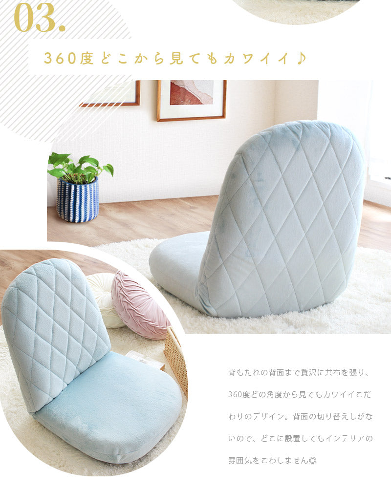 ゆったりくつろげて用途も広がるリクライニング式で、14段階のギアを搭載。座椅子としてはもちろん、フラットにしてクッション代わりにも使える、リラックスタイムにぴったりな贅沢設計です♪内部のクッションには、へたりにくく耐久性に優れた高密度チップウレタンを使用♪底つき感のない肉厚な座面は長時間座っていても疲れにくく、快適な座り心地が続きます。背もたれの背面まで贅沢に共布を張り、360度どの角度から見てもカワイイこだわりのデザイン。背面の切り替えしがないので、どこに設置してもインテリアの雰囲気をこわしません◎