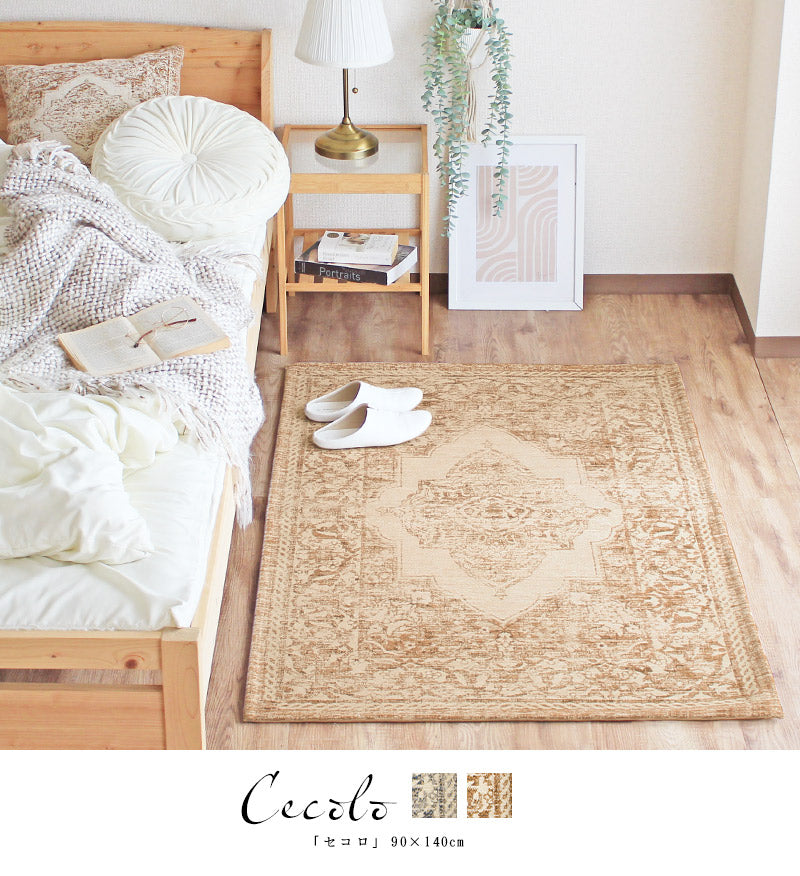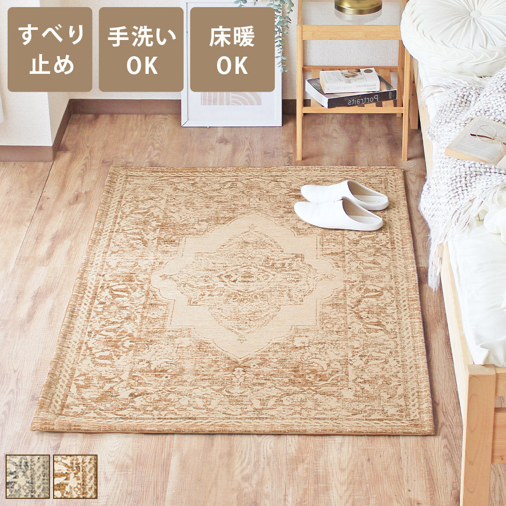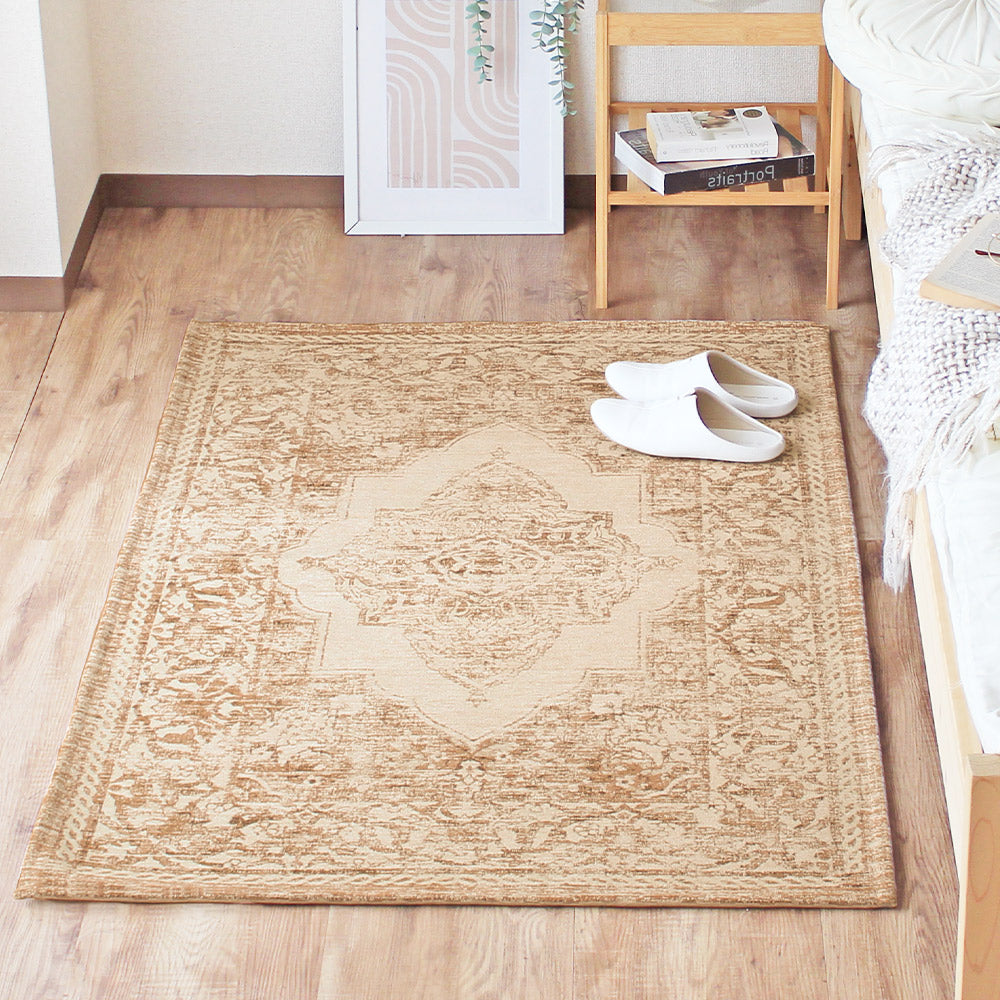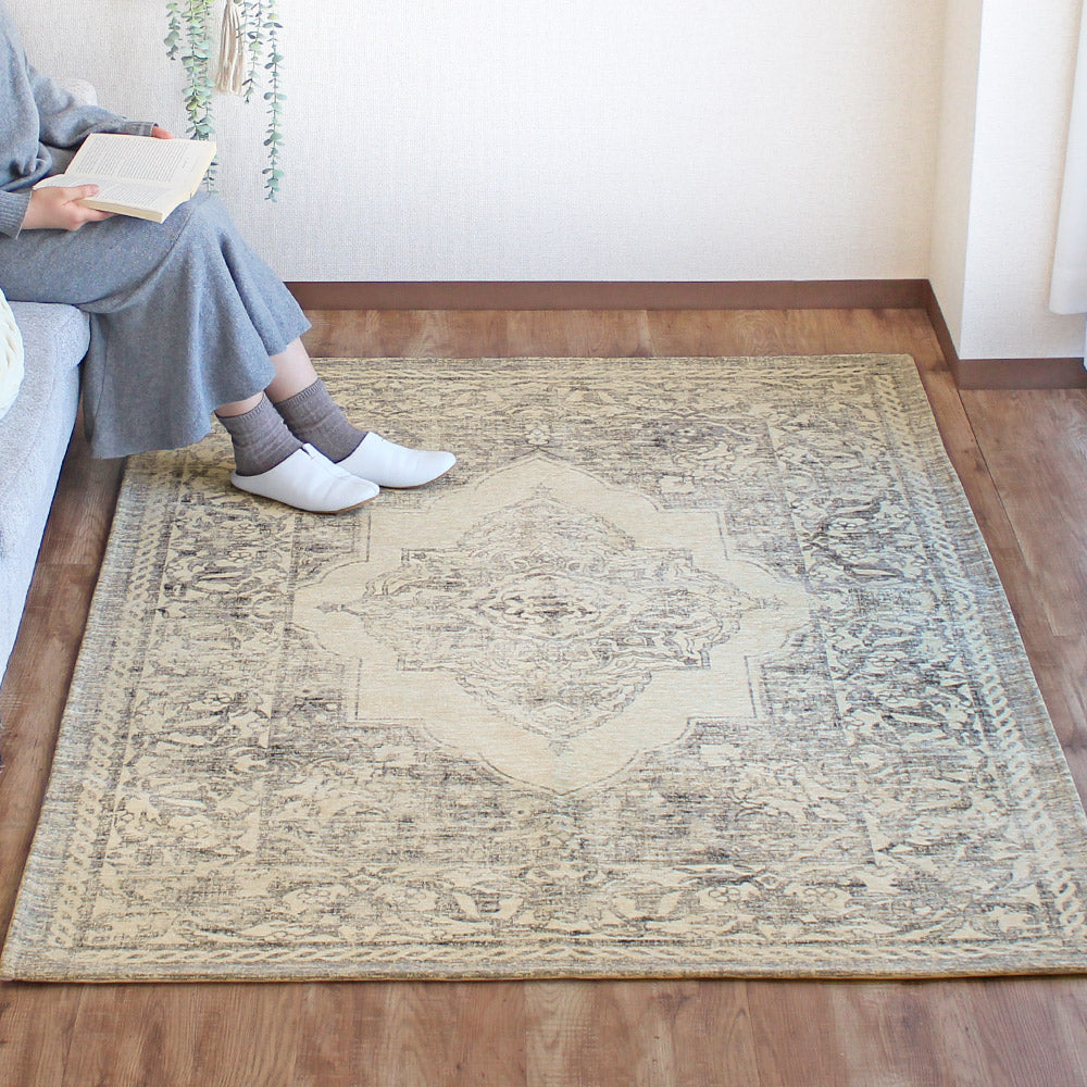 繊細な織り模様で、長い年月を大切に使い込まれたようなかすれ文様と中心のメダリオンが魅力的。シャビーシックを演出してくれるアンティーク調のハーフラグ。滑らかな肌触りのシェニール糸を使用して織り上げた短毛の生地は、通気性が良くシーズンを問わず一年中サラッと快適な使い心地です。更に手洗いOKなので、うっかり汚してしまってもご家庭で丸洗いできていつでも清潔◎お部屋全体の印象が華やぎ、こなれ感の出せる一枚です。