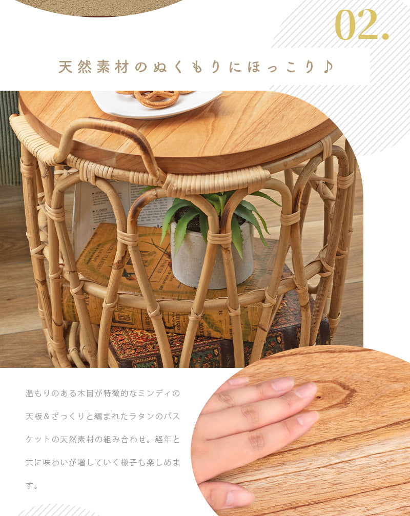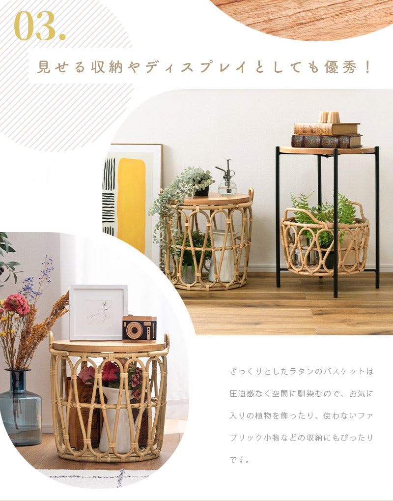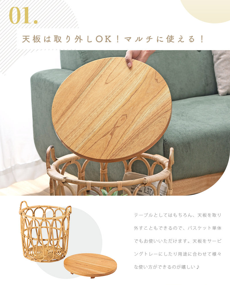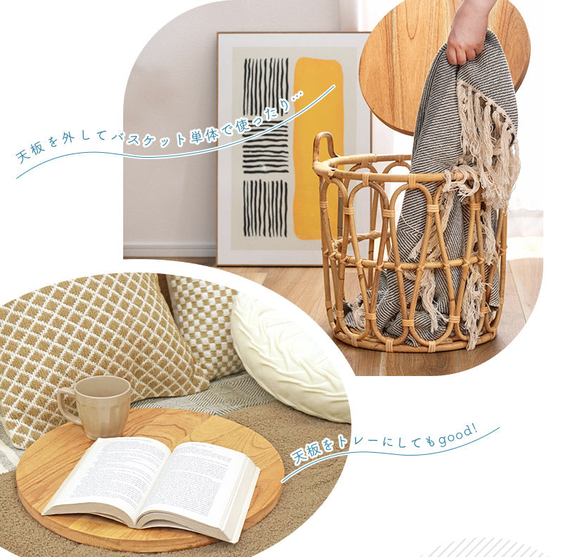 温もりのある木目が特徴的なミンディの天板×ラタンで編まれたバスケットのあたたかみがある天然素材同士の組み合わせ。経年と共に味わいが増していく様子も楽しめます。テーブルとしてはもちろん、天板を取り外すこともできるので、バスケット単体でもお使いいただけます。天板をサービングトレーにしたり用途に合わせて様々な使い方ができるのが嬉しい♪ざっくりとしたラタンのバスケットは圧迫感なく空間に馴染むので、お気に入りの植物を飾ったり、使わないファブリック小物などの収納にもぴったりです。ラクラク運べる重さであつかいやすいのも◎