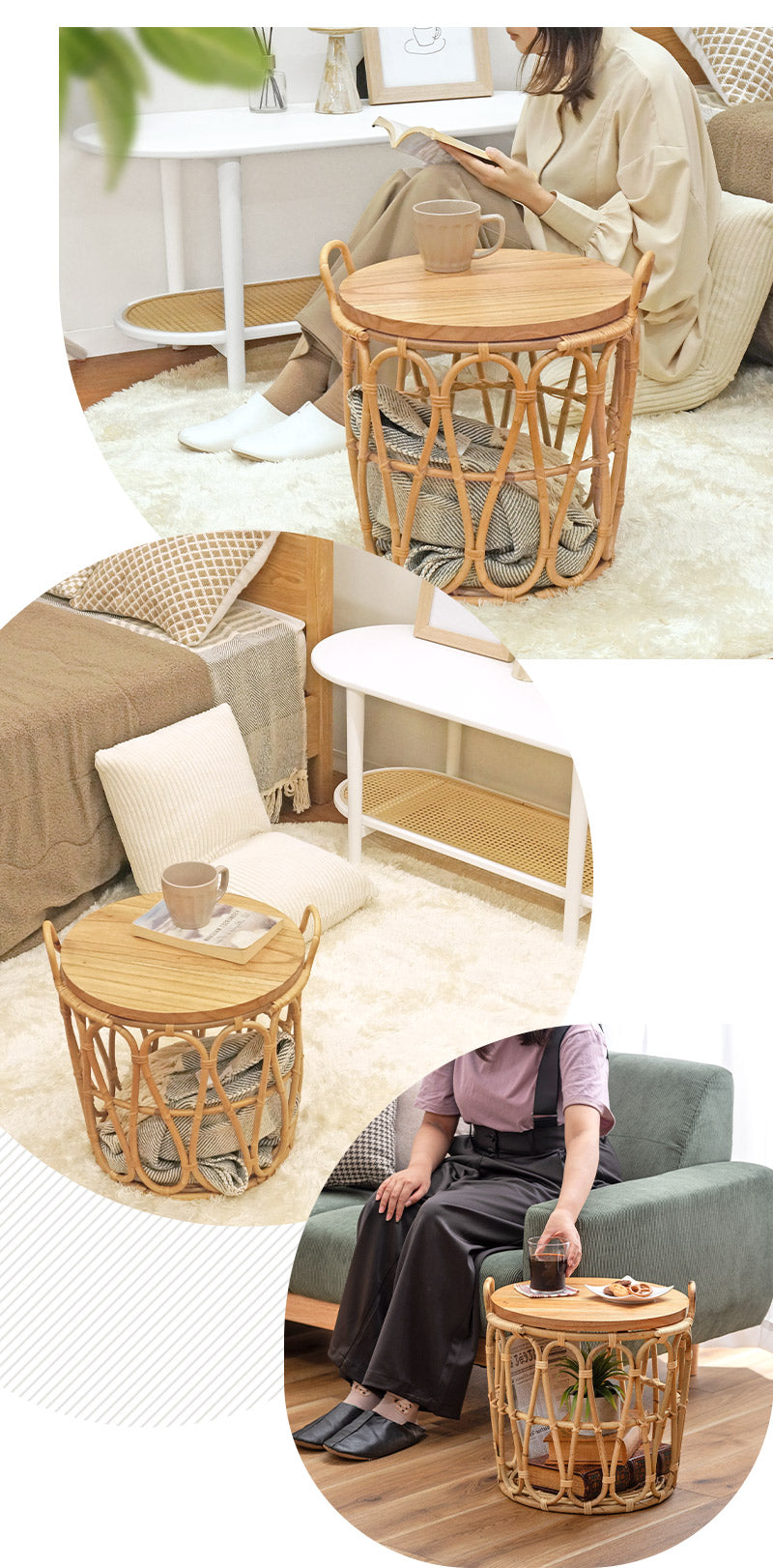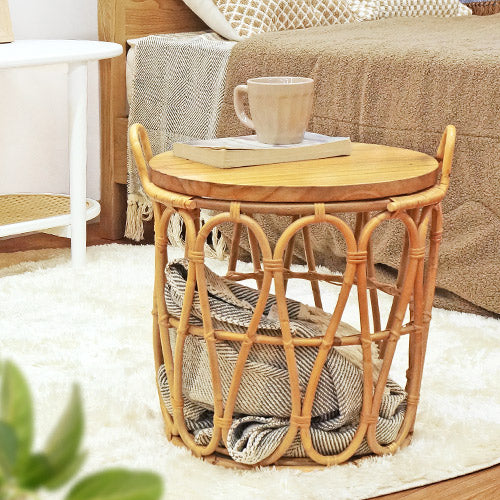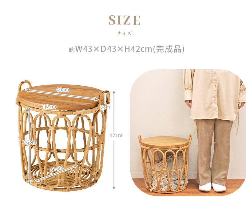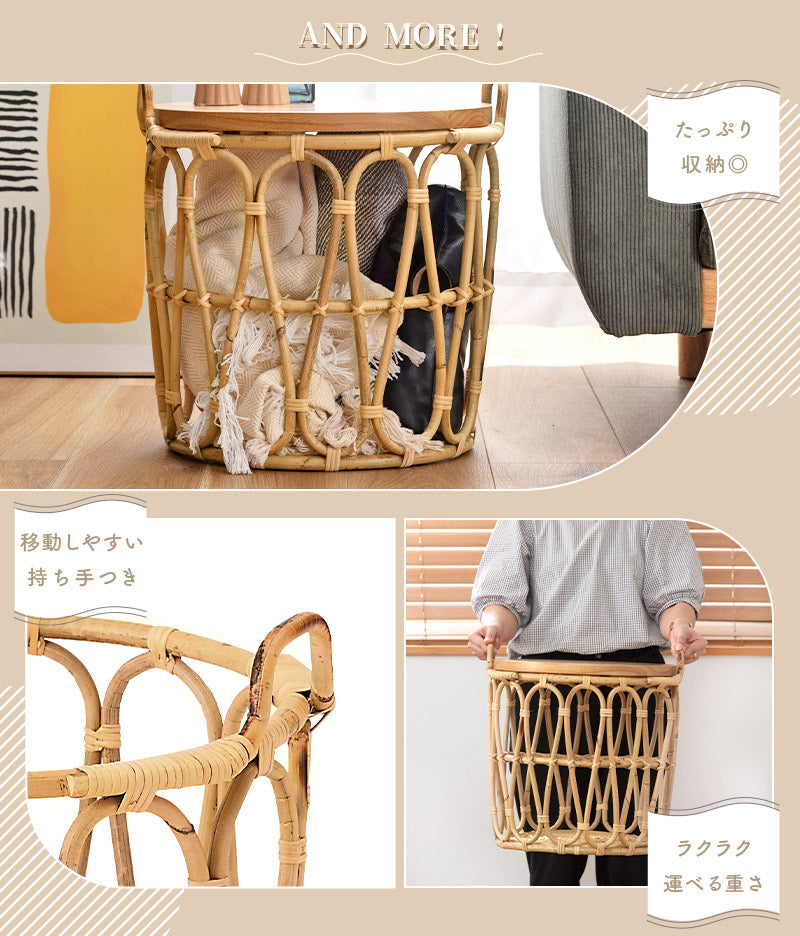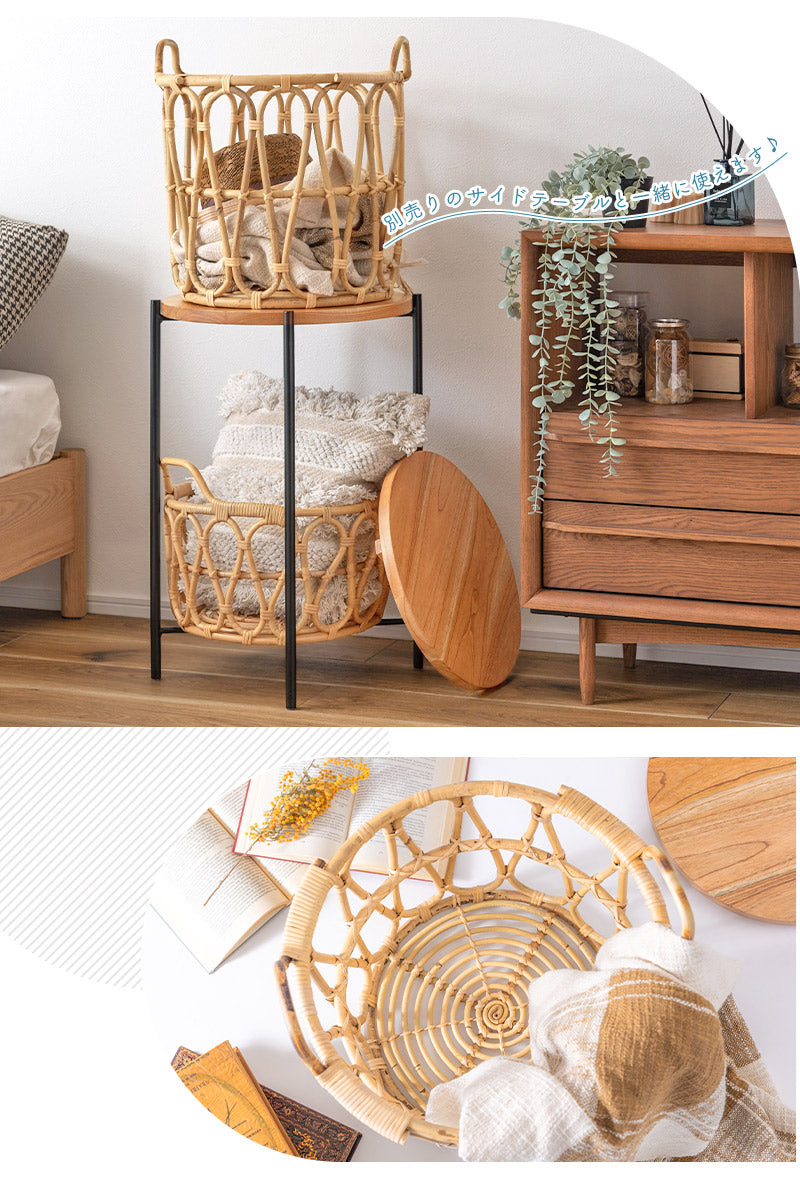 温もりのある木目が特徴的なミンディの天板×ラタンで編まれたバスケットのあたたかみがある天然素材同士の組み合わせ。経年と共に味わいが増していく様子も楽しめます。テーブルとしてはもちろん、天板を取り外すこともできるので、バスケット単体でもお使いいただけます。天板をサービングトレーにしたり用途に合わせて様々な使い方ができるのが嬉しい♪ざっくりとしたラタンのバスケットは圧迫感なく空間に馴染むので、お気に入りの植物を飾ったり、使わないファブリック小物などの収納にもぴったりです。ラクラク運べる重さであつかいやすいのも◎