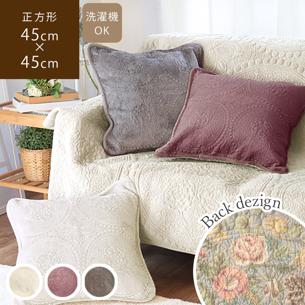 上品なパープルとグレー・アイボリーの色からお選びいただけるエレガントなクッションカバー。表面には細かいキルトの刺繍が施されお部屋に飾るだけで、一気にラグジュアリーな雰囲気をアップさせます。