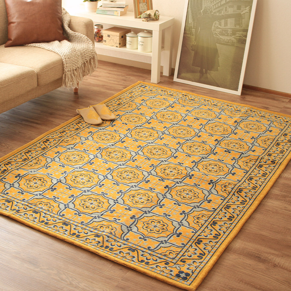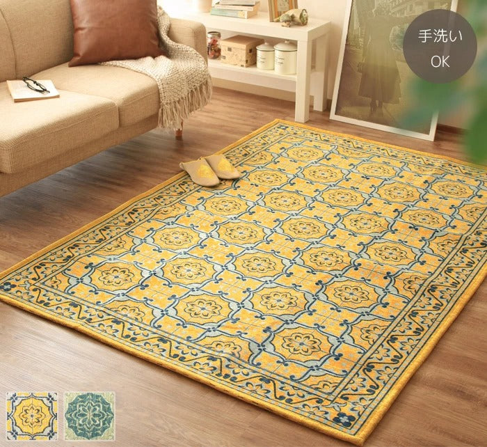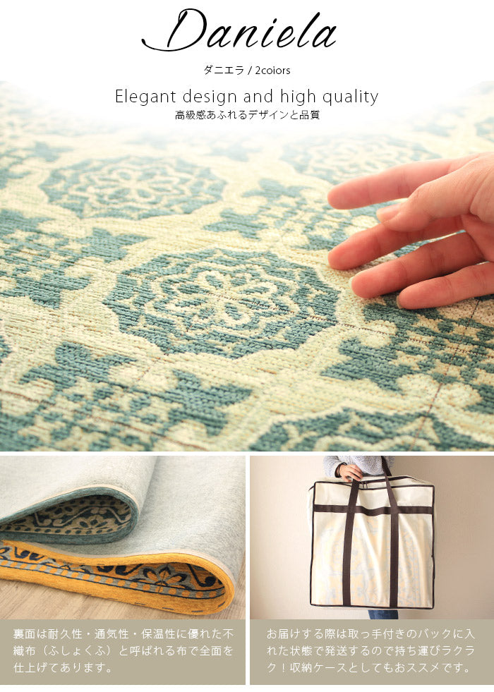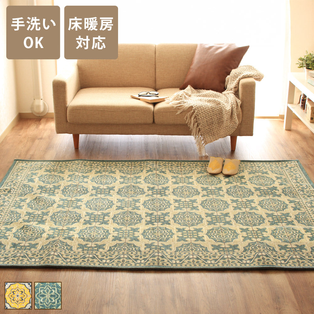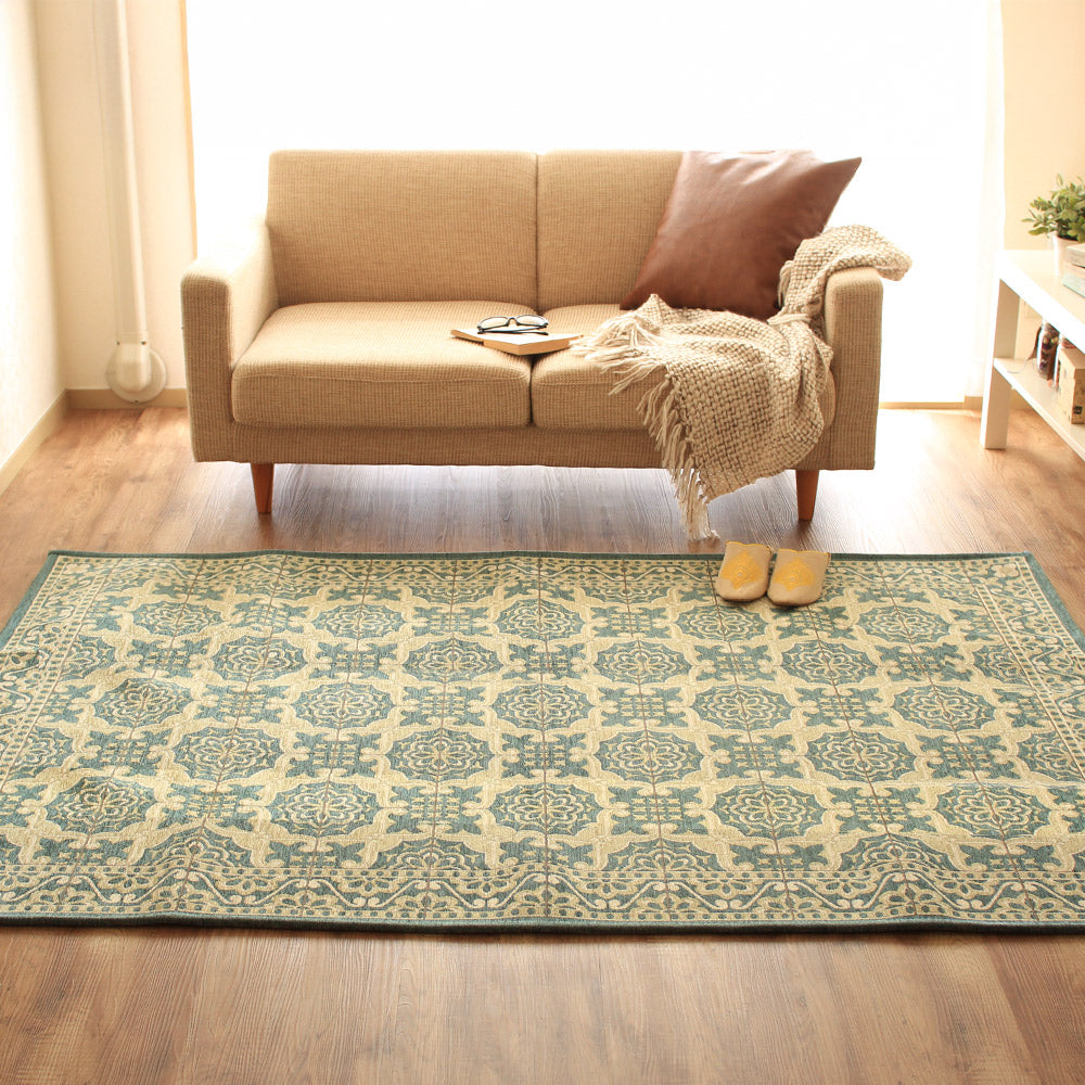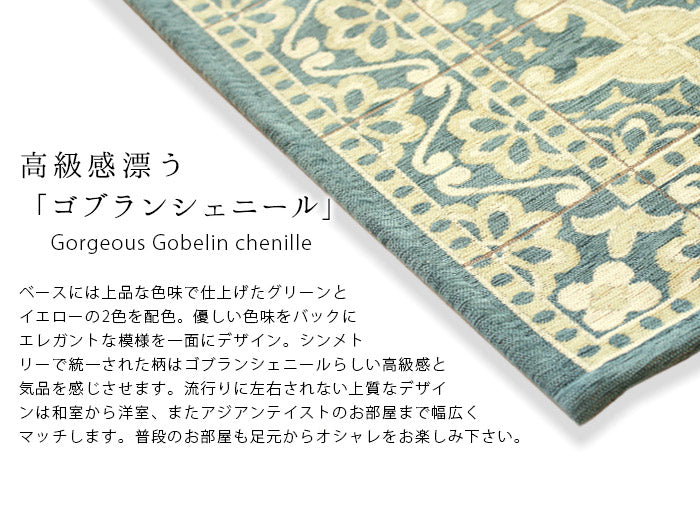 ベースには上品な色味で仕上げたグリーンとイエローの2色を配色。優しい色味をバックに エレガントな模様を一面にデザイン。シンメトリーで統一された柄はゴブランシェニールらしい高級感と気品を感じさせます。流行りに左右されない上質なデザインは和室から洋室、またアジアンテイストのお部屋まで幅広くマッチします。普段のお部屋も足元からオシャレをお楽しみ下さい。