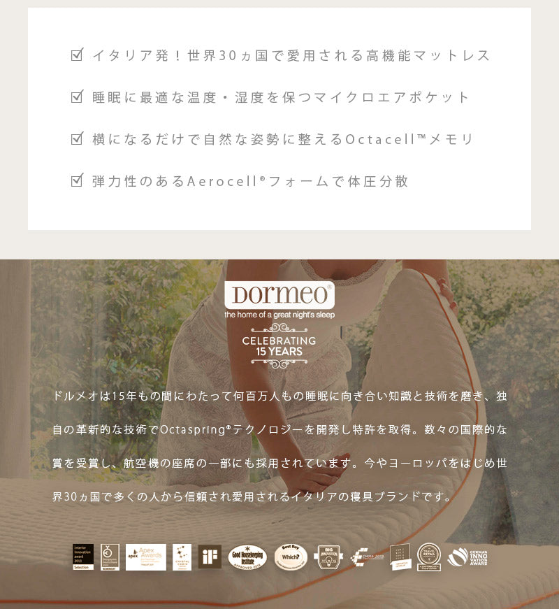 ドルメオは15年もの間にわたって何百万人もの睡眠に向き合い知識と技術を磨き、独自の革新的な技術でOctaspring®テクノロジーを開発し特許を取得。数々の国際的な賞を受賞し、航空機の座席の一部にも採用されています。今やヨーロッパをはじめ世界30ヵ国で多くの人から信頼され愛用されるイタリアの寝具ブランドです。