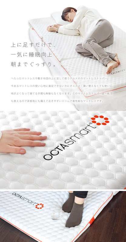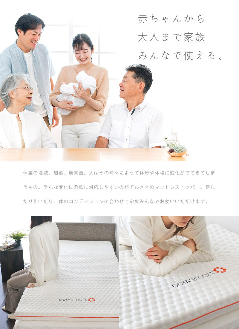 へたったマットレスや敷き布団の上に足して使うドルメオのマットレストッパー。今あるマットレスの使い心地に満足できない方にオススメ!買い替えなくても使い心地がよくなって捨てる手間も無駄もなくなります。このマットレストッパーは一枚でも使えるので来客用にも備えておきやすいスリムで高性能なマットレスです。仰向け、横向け、寝返り、睡眠時の体勢は一晩で様々に変化します。そのどんな姿勢をとっていても肩や腰などの一部にかかる負担を全体に分散して筋肉の緊張をやわらげて自然に眠りやすい姿勢へとサポートしてくれます。