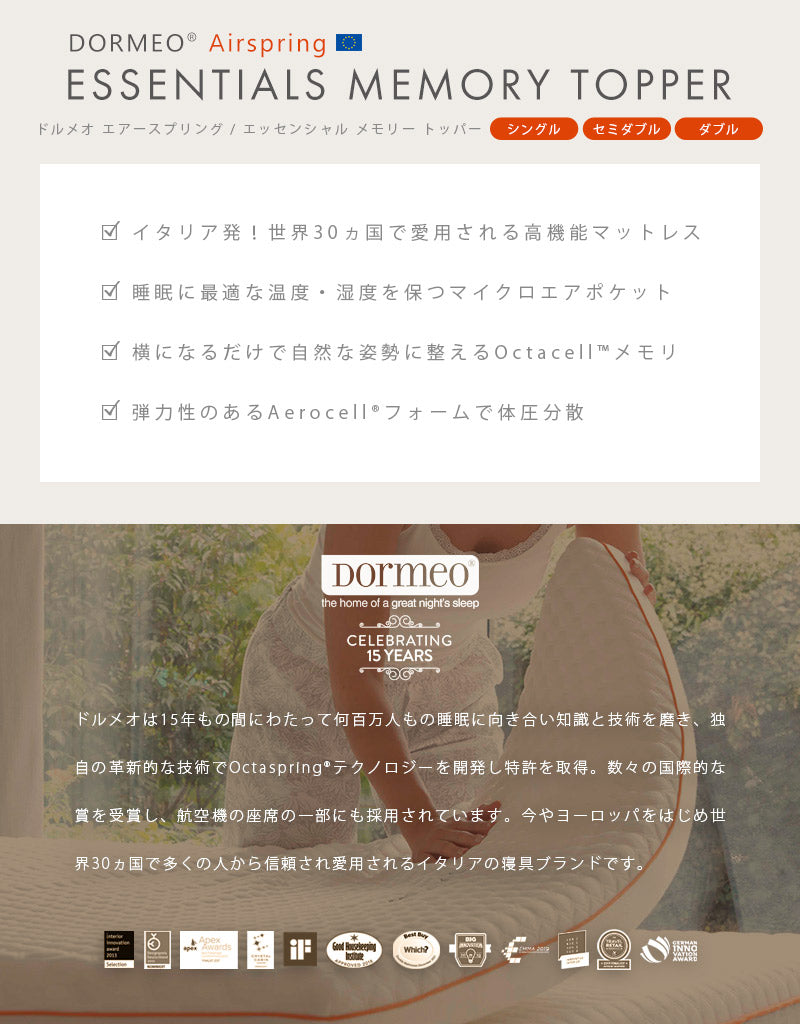 ドルメオは15年もの間にわたって何百万人もの睡眠に向き合い知識と技術を磨き、独自の革新的な技術でOctaspring®テクノロジーを開発し特許を取得。数々の国際的な賞を受賞し、航空機の座席の一部にも採用されています。今やヨーロッパをはじめ世界30ヵ国で多くの人から信頼され愛用されるイタリアの寝具ブランドです。
