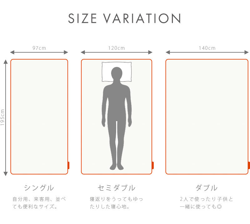 | サイズ | シングル:約97×195cm セミダブル:約120×195cm ダブル:約140×195cm |