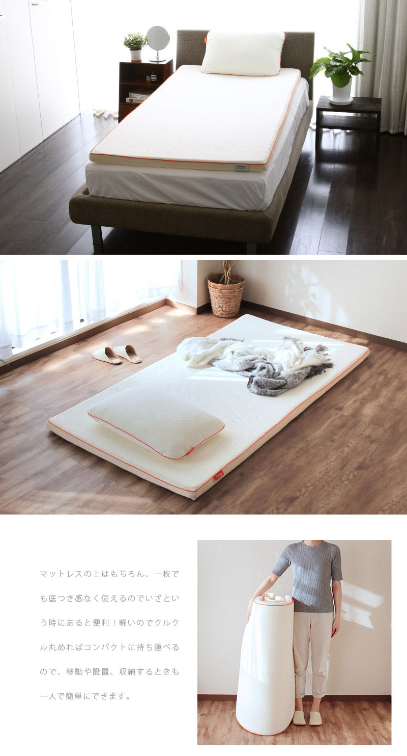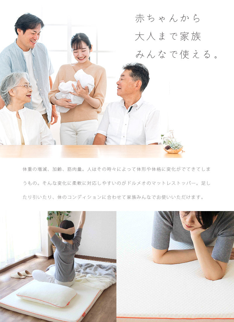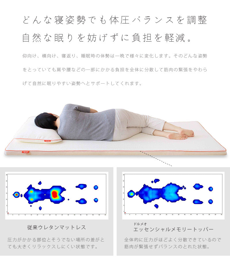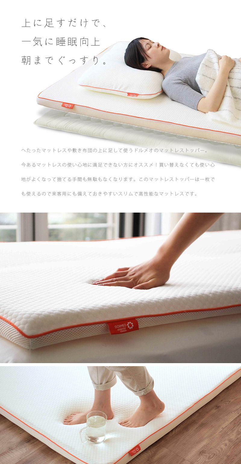 へたったマットレスや敷き布団の上に足して使うドルメオのマットレストッパー。今あるマットレスの使い心地に満足できない方にオススメ!買い替えなくても使い心地がよくなって捨てる手間も無駄もなくなります。このマットレストッパーは一枚でも使えるので来客用にも備えておきやすいスリムで高性能なマットレスです。仰向け、横向け、寝返り、睡眠時の体勢は一晩で様々に変化します。そのどんな姿勢をとっていても肩や腰などの一部にかかる負担を全体に分散して筋肉の緊張をやわらげて自然に眠りやすい姿勢へとサポートしてくれます。