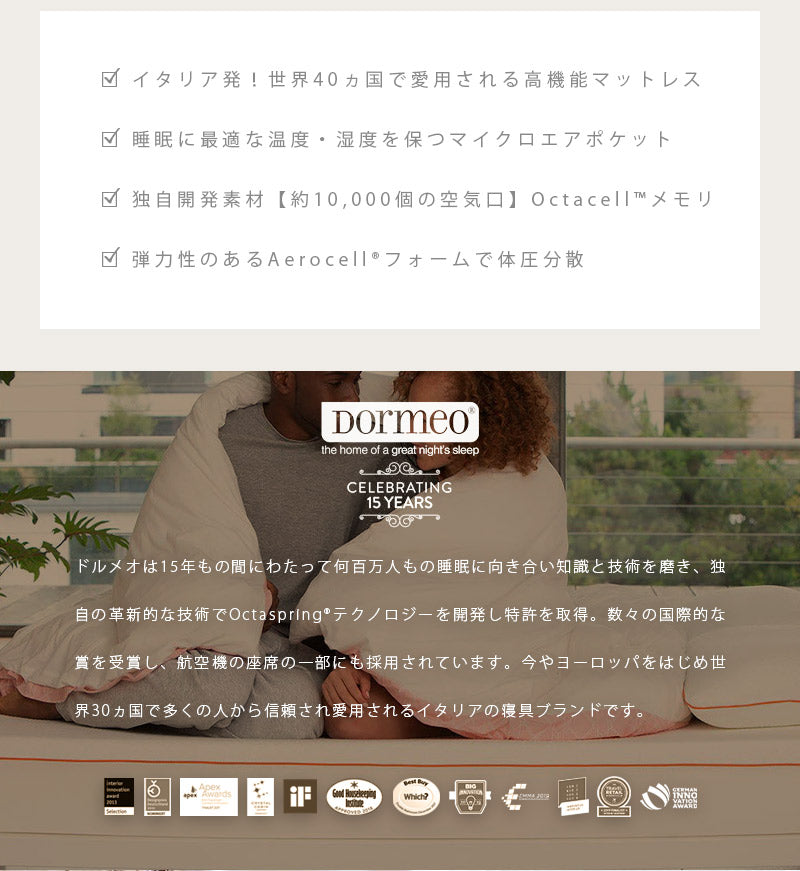 ドルメオは15年もの間にわたって何百万人もの睡眠に向き合い知識と技術を磨き、独自の革新的な技術でOctaspring®テクノロジーを開発し特許を取得。数々の国際的な賞を受賞し、航空機の座席の一部にも採用されています。今やヨーロッパをはじめ世界30ヵ国で多くの人から信頼され愛用されるイタリアの寝具ブランドです。