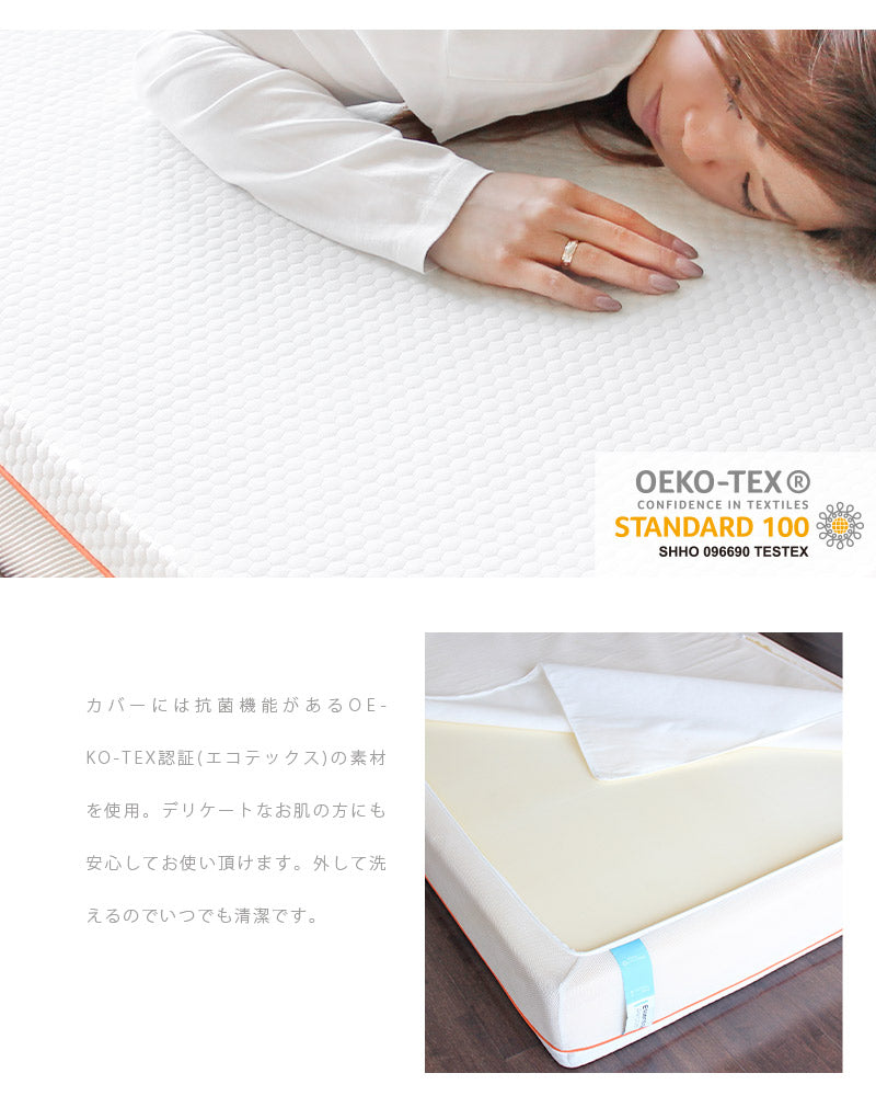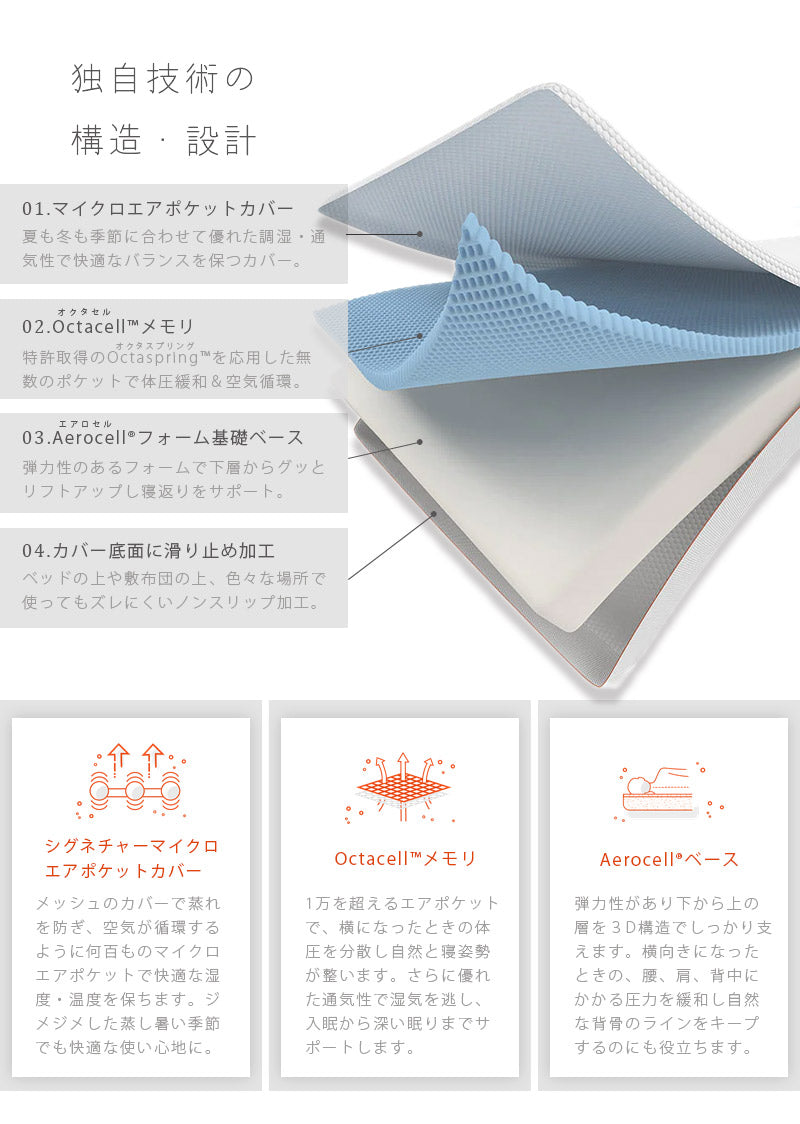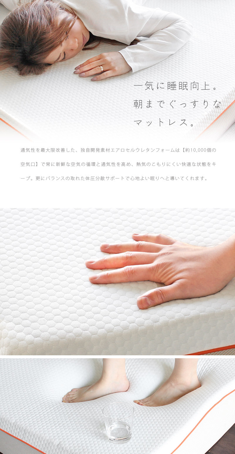 通気性を最大限改善した、独自開発素材エアロセルウレタンフォームは【約10,000個の空気口】で常に新鮮な空気の循環と通気性を高め、熱気のこもりにくい快適な状態をキープ。更にバランスの取れた体圧分散サポートで心地よい眠りへと導いてくれます。底つき感なく睡眠中の体をしっかりと支えてくれるので、横になった瞬間から寝心地の良さを実感いただけます。仰向け、横向け、寝返り、睡眠時の体勢は一晩で様々に変化します。そのどんな姿勢をとっていても肩や腰などの一部にかかる負担を全体に分散して筋肉の緊張をやわらげて自然に眠りやすい姿勢へとサポートしてくれます。