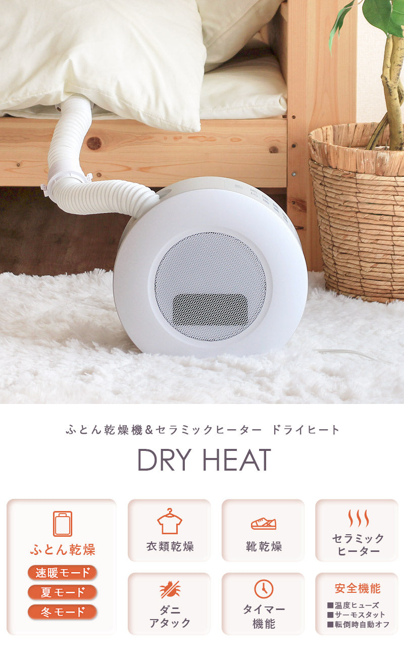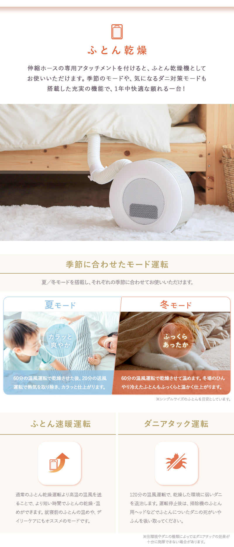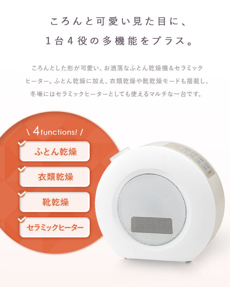 ころんとした形が可愛い、お洒落なふとん乾燥機&セラミックヒーター。ふとん乾燥機に見えない愛らしい見た目に、ふとん乾燥・衣類乾燥・靴乾燥モードを搭載し、冬場にはセラミックヒーターとしても使えるマルチな一台です。ふとん乾燥には夏/冬モードを搭載し、夏はカラッと爽やかに、冬はふっくら温かく一年中快適♪気になるダニ対策モードも搭載し、乾燥した環境に弱いダニ退治もできて寝具の衛生面が気になる方も安心です。冬場は冷えた足元を暖めるセラミックヒーターとしても使えて、衣類の乾燥やくつ乾燥に使えるアタッチメントも付属するので、これ一台で日常の「あったらいいな」をすべて叶えてくれる頼れるアイテムです。