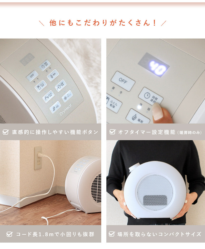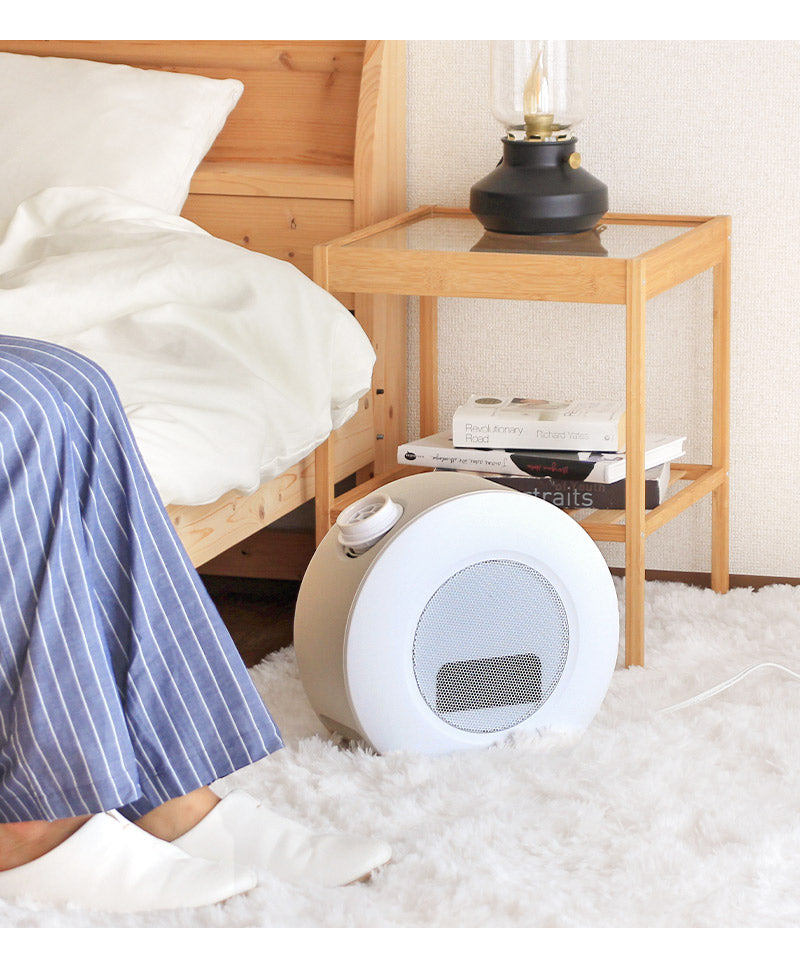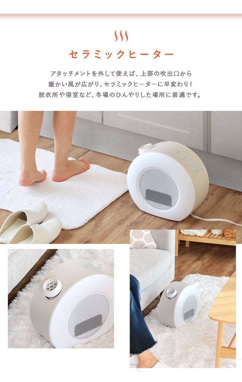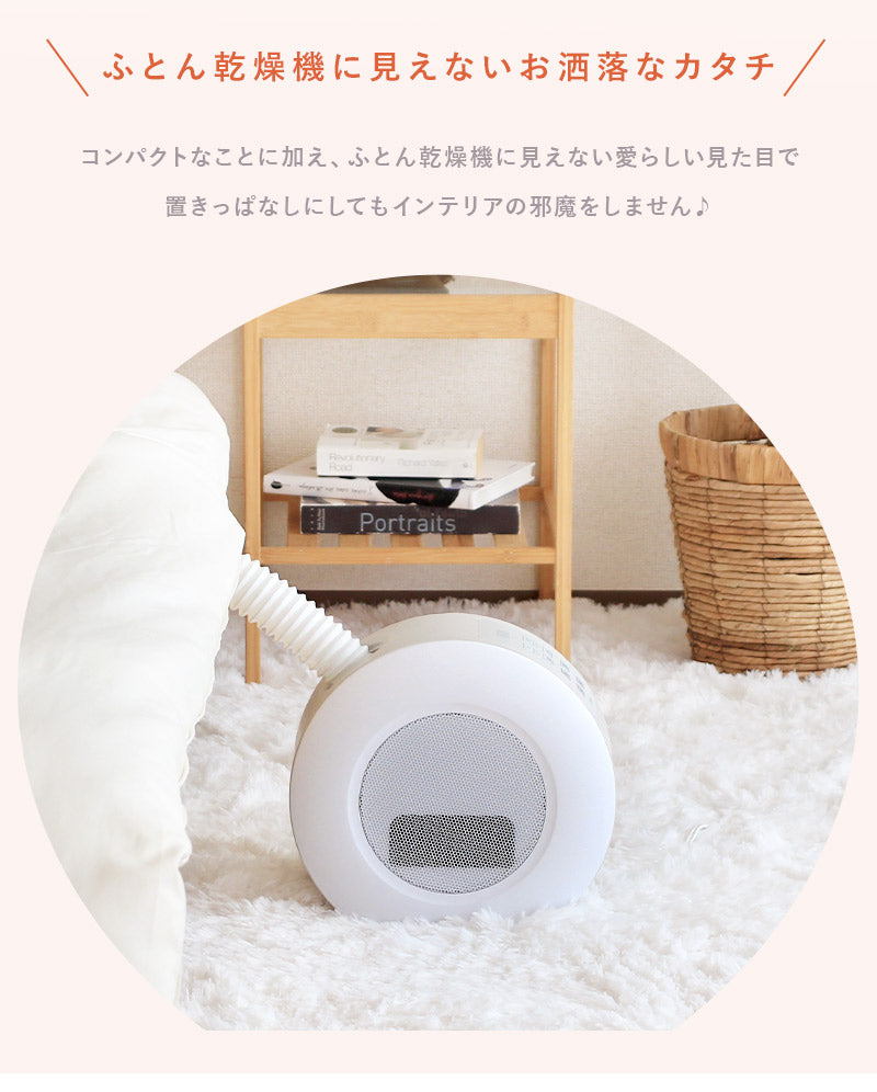 ころんとした形が可愛い、お洒落なふとん乾燥機&セラミックヒーター。ふとん乾燥機に見えない愛らしい見た目に、ふとん乾燥・衣類乾燥・靴乾燥モードを搭載し、冬場にはセラミックヒーターとしても使えるマルチな一台です。ふとん乾燥には夏/冬モードを搭載し、夏はカラッと爽やかに、冬はふっくら温かく一年中快適♪気になるダニ対策モードも搭載し、乾燥した環境に弱いダニ退治もできて寝具の衛生面が気になる方も安心です。冬場は冷えた足元を暖めるセラミックヒーターとしても使えて、衣類の乾燥やくつ乾燥に使えるアタッチメントも付属するので、これ一台で日常の「あったらいいな」をすべて叶えてくれる頼れるアイテムです。