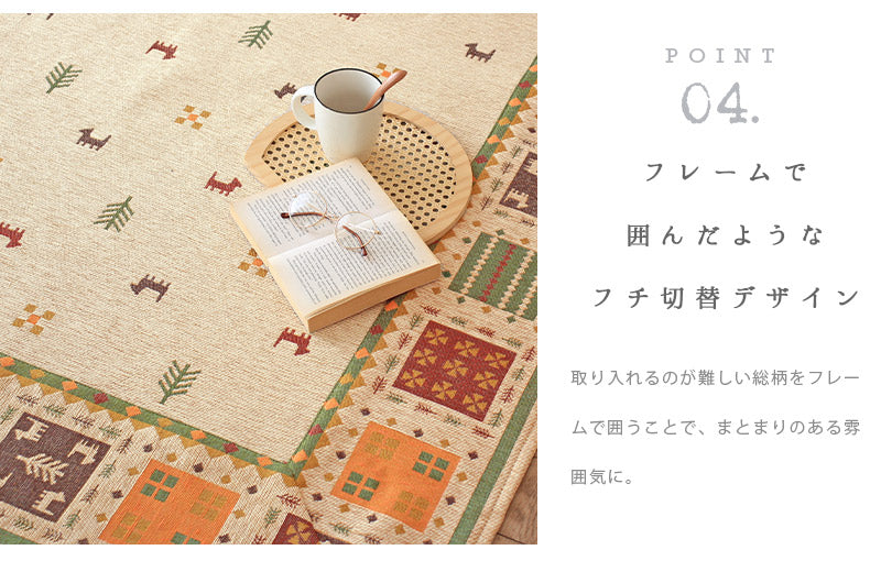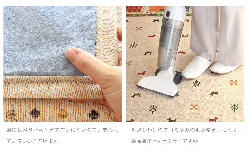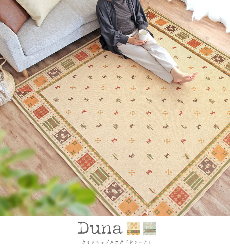 複数の色糸をつかい柄や模様を織りあげる上質な「ジャガード織り」。遊牧民による手織り絨毯「ギャッベ」をモチーフにしたあたたかみある仕上がりのラグマット。デザインはインテリアに取り入れやすく手軽に雰囲気を変えてくれます。毛足がないジャガード織なので食べこぼしや髪・ホコリなどのゴミが絡まず掃除機やコロコロがけがラクラク。汚れが気になってきたら洗濯機まかせで丸洗いOK!お手入れがめんどくさくないので普段使いにぴったりです。夏はサラリと素足でも張りつかず冬もそのまま使える生地感。シーズンごとに敷き替える必要がないので収納場所を確保したり、しまうための手間暇もかかりません。