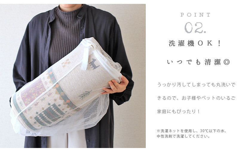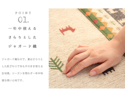 毛足がないジャガード織なので夏はサラリと素足でも張りつかず、冬もそのまま使える生地感で敷き替え不要◎