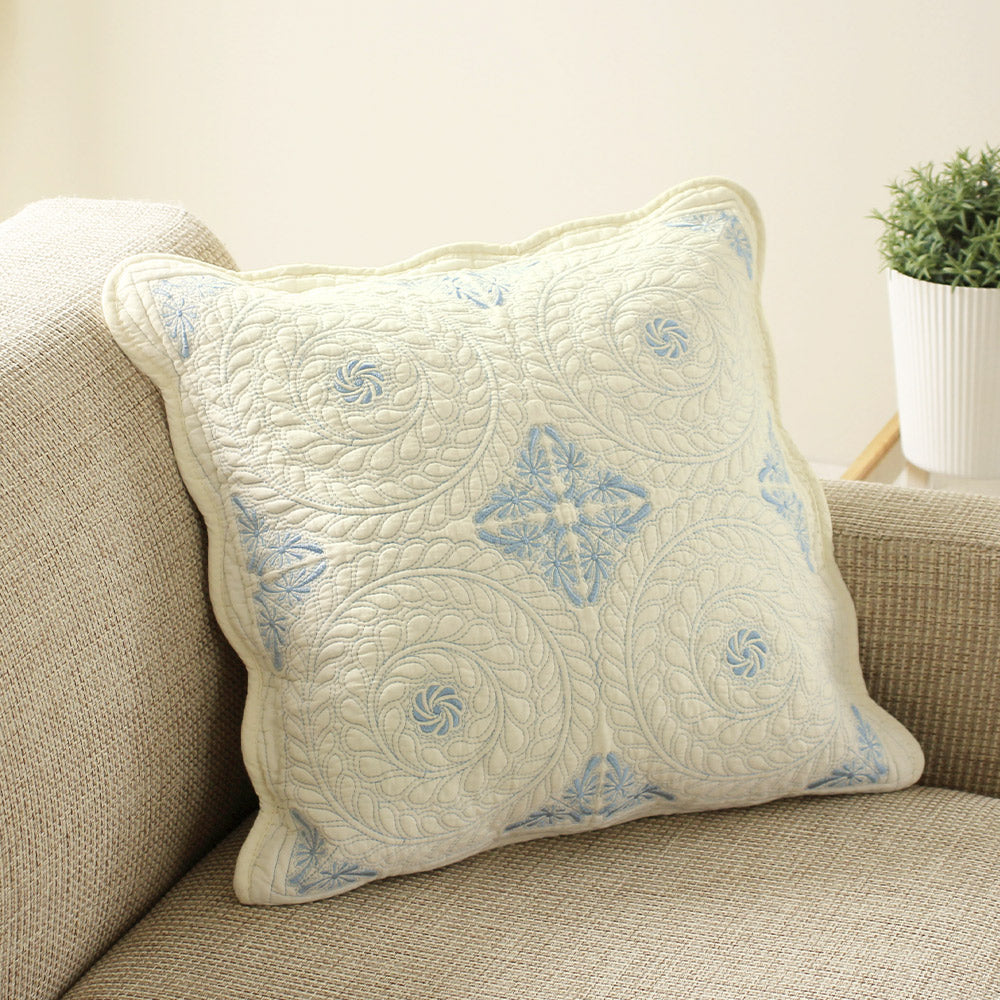 使うほどに肌に馴染むコットン素材は、通気性がよく保温性に優れているので季節を問わず気持ちよくお使いいただけます。刺繍は裏地付きでほつれにくく安心です。光沢のある刺繍糸と繊細で美しいキルティング。抜け感のある瑞々しいデザインは、インテリアと合わせやすくナチュラルなのに気品のある空間にしてくれます。クッションカバーや座布団カバーとシリーズで揃えれば統一感のあるお部屋に◎
