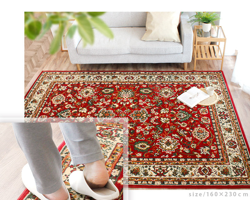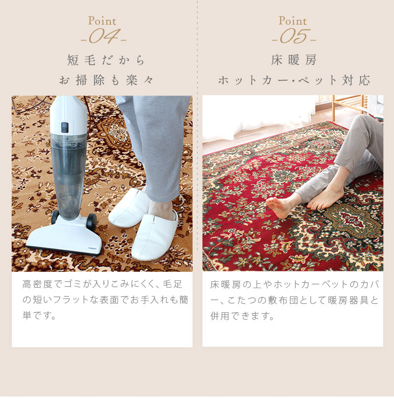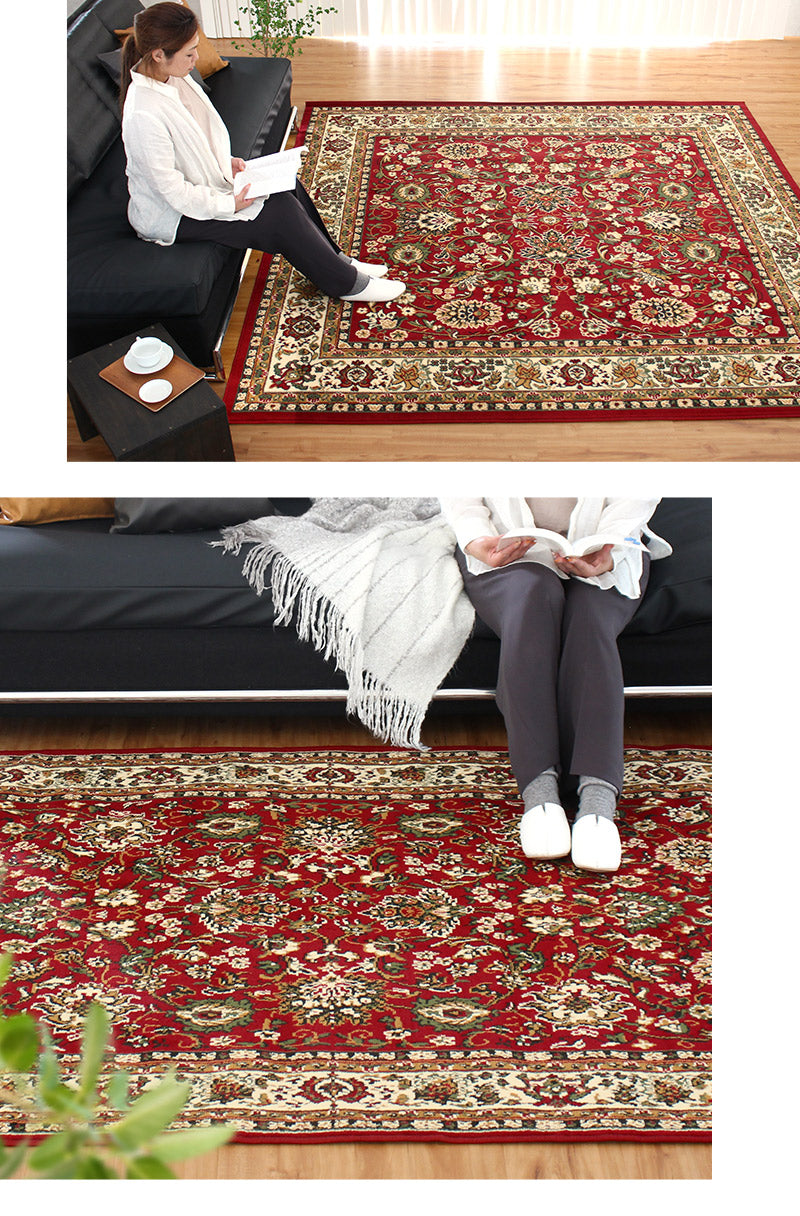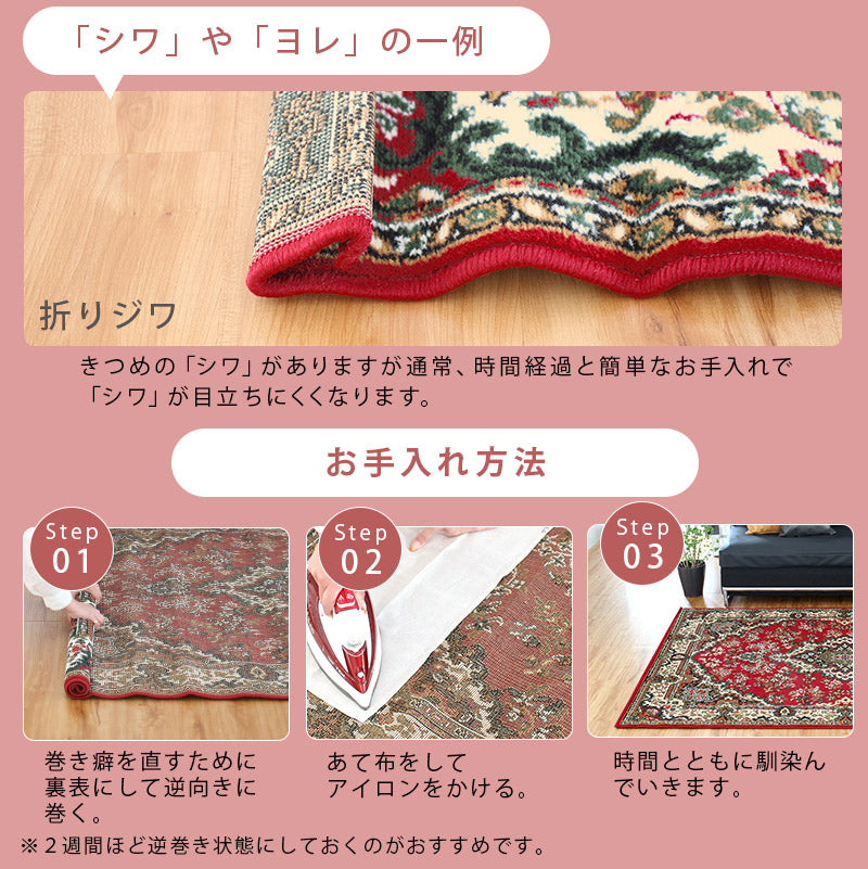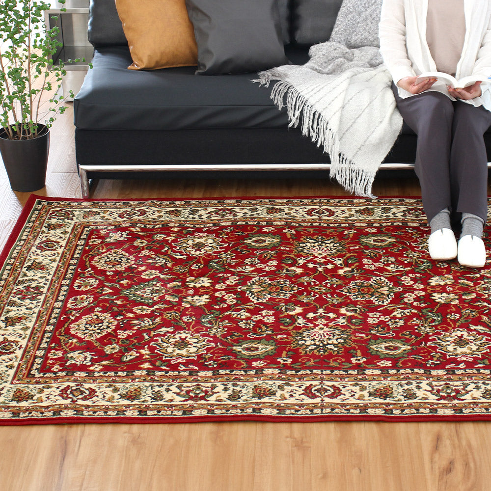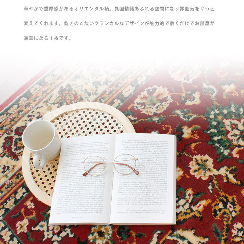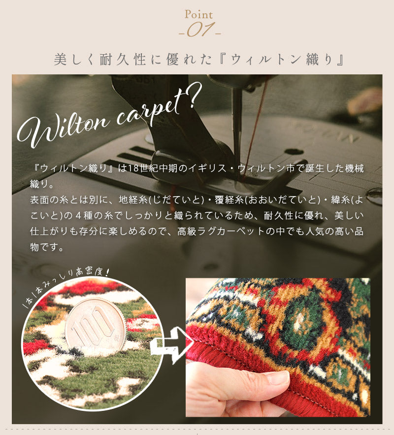 異国情緒あふれる空間になり雰囲気をぐっと変えてくれます。飽きのこないクラシカルなデザインが魅力的で敷くだけでお部屋が豪華になる1枚です。『ウィルトン織り』は18世紀中期のイギリス・ウィルトン市で誕生した機械織りで、表面の模様を作るものとは別に地経糸(じだていと)・覆経糸(おおいだていと)・緯糸(よこいと)の4種の糸でしっかりと織られているため、優れた耐久性と美しい織り模様が楽しめます。