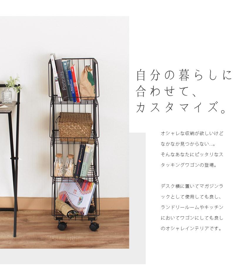 オシャレな収納が欲しいけどなかなか見つからない…。そんなあなたにピッタリなスタッキングワゴンの登場。デスク横に置いてマガジンラックとして使用しても良し、ランドリールームやキッチンにおいてワゴンにしても良しのオシャレインテリアです。オープンラックだけどワイヤーデザインなので圧迫感がなくスタイリッシュ。タオルやTシャツをポンと入れるだけでもなんだかお店のようにオシャレに見えちゃいます。見せる収納にピッタリだから、しまい込まずに普段使いするアイテムをどんどんしまって便利に使えちゃいます◎