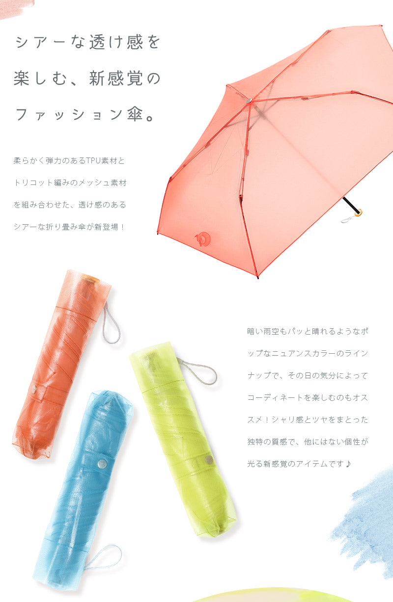 柔らかく弾力のあるTPU素材とトリコット編みのメッシュ素材を組み合わせた、透け感のあるシアーな折り畳み傘♪