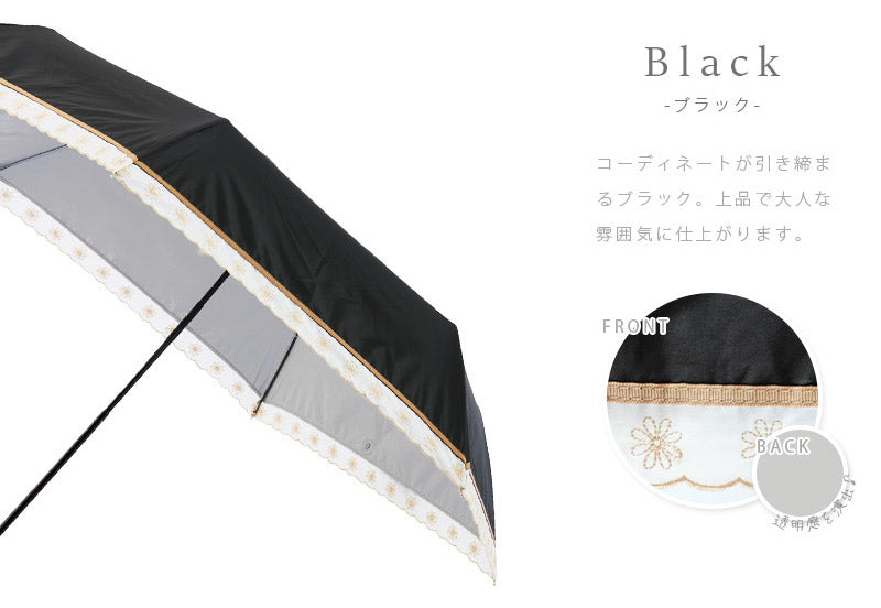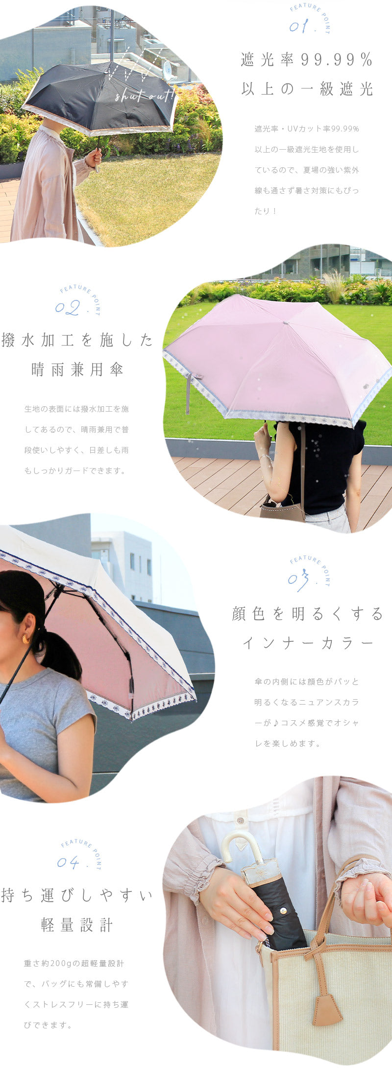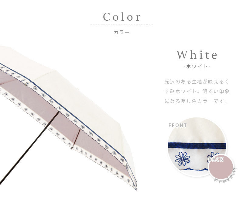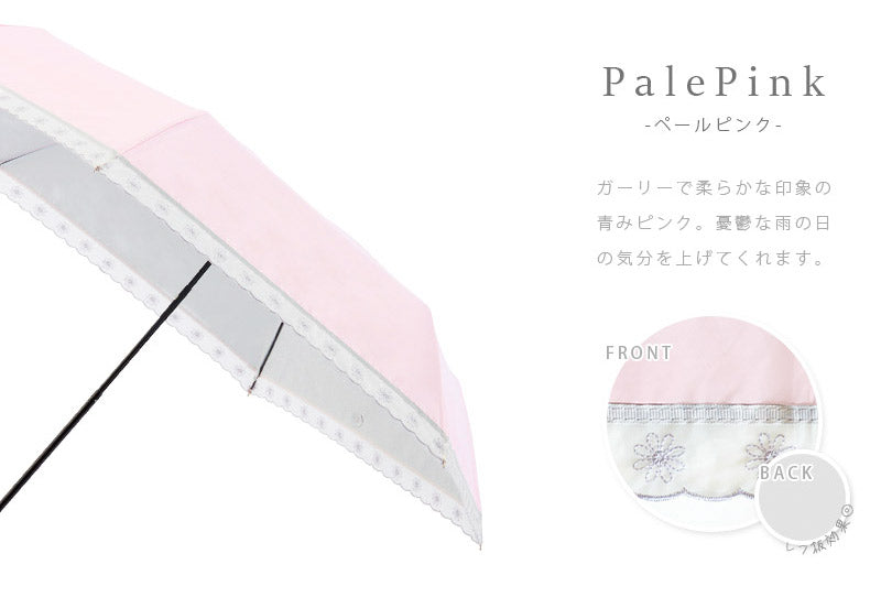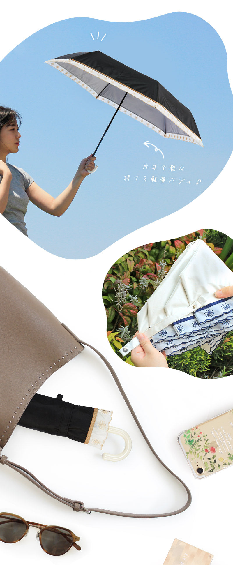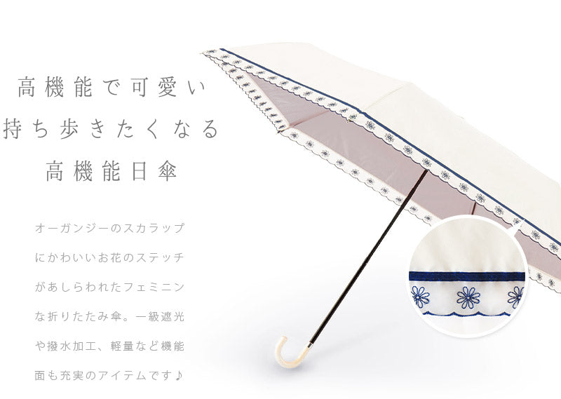オーガンジーのスカラップにかわいいお花のステッチがあしらわれたフェミニンな折りたたみ傘。遮光率・UVカット率99.99%以上の一級遮光生地を使用しているので、夏場の強い紫外線も通さず暑さ対策にもぴったり!生地の表面には撥水加工を施してあるので、晴雨兼用で普段使いしやすく、日差しも雨もしっかりガードできます。傘の内側は顔色がパッと明るくなる柔らかなカラーで、コスメ感覚でオシャレを楽しめる♪重さ約200gの軽量設計で、バッグにも常備しやすくストレスフリーに持ち運びもできて、可愛いだけじゃない機能面も充実のアイテムです。