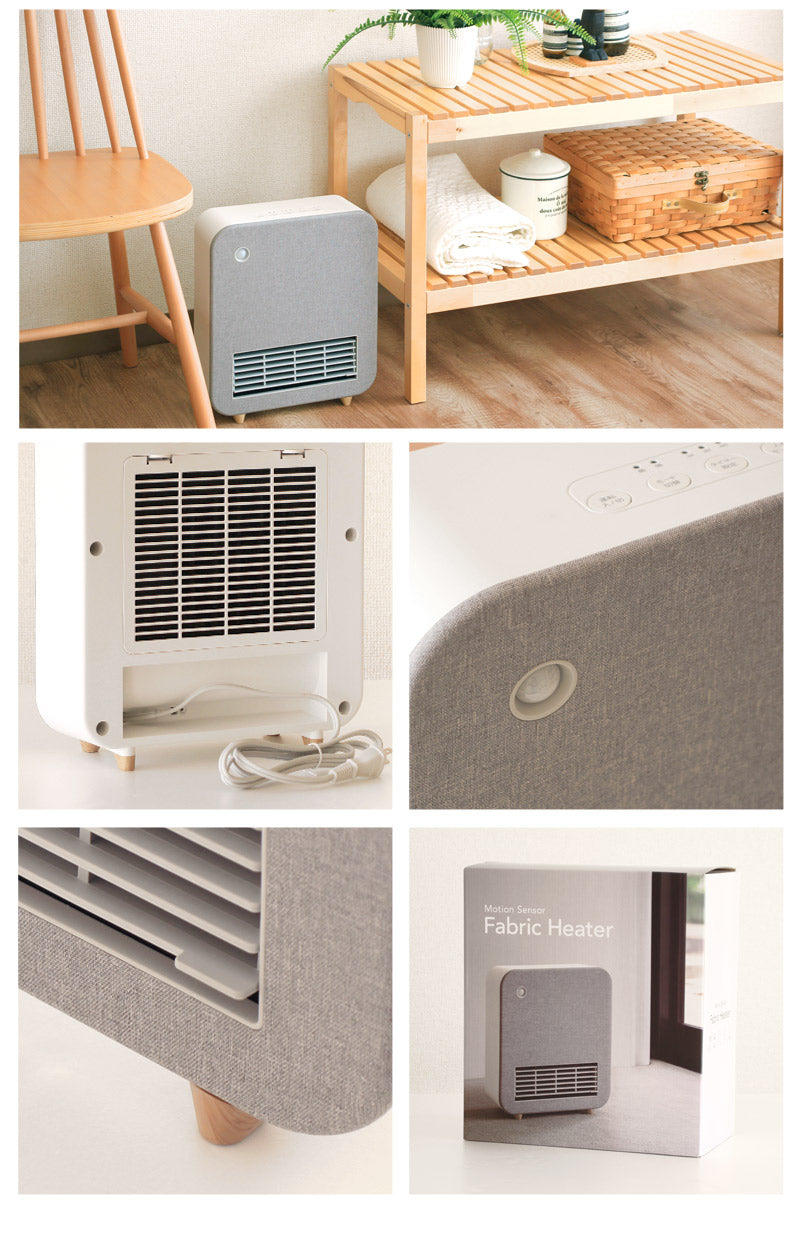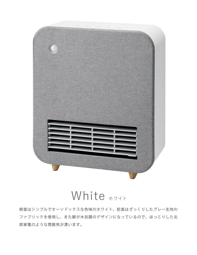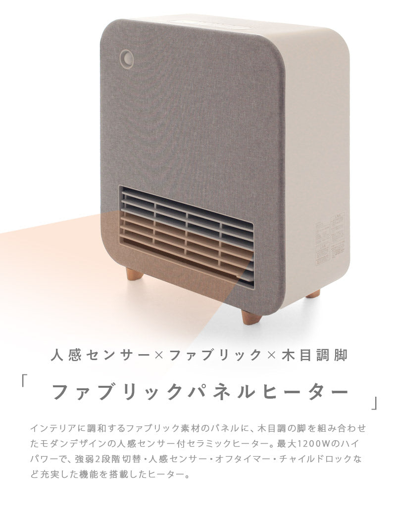 インテリアに調和するファブリック素材のパネルに、木目調の脚を組み合わせたモダンデザインの人感センサー付セラミックヒーター。最大1200Wのハイパワーで、強弱2段階切替・人感センサー・オフタイマー・チャイルドロックなど充実した機能を搭載したヒーター。