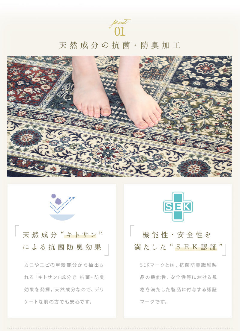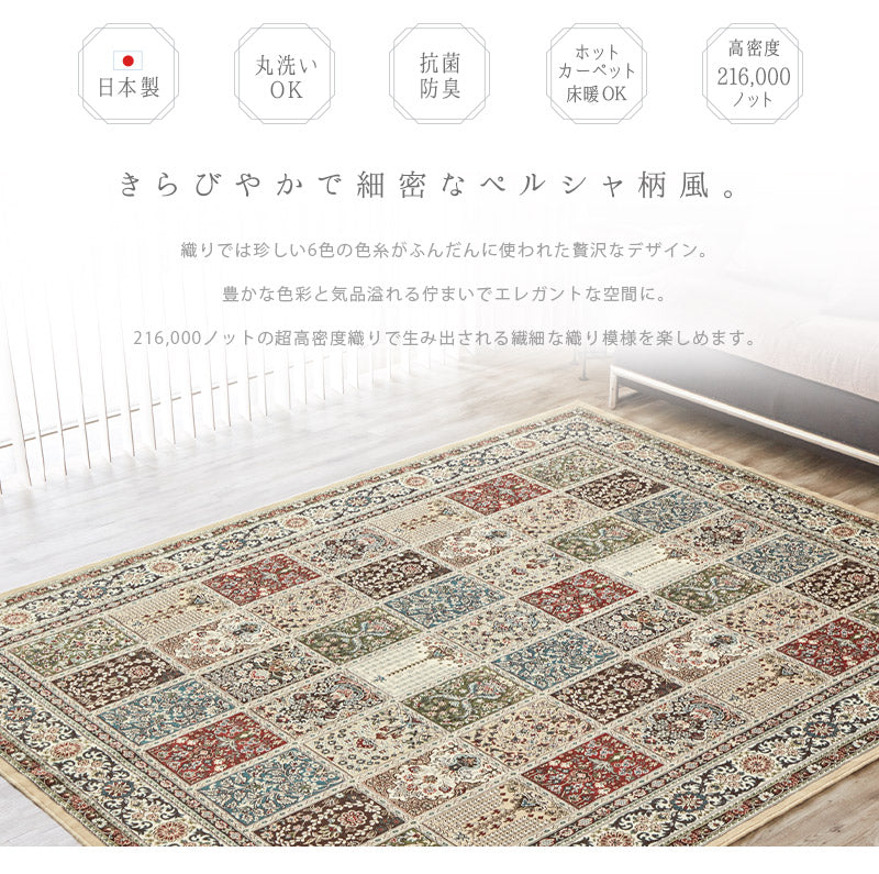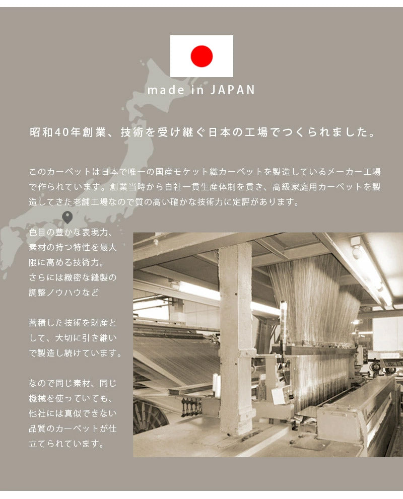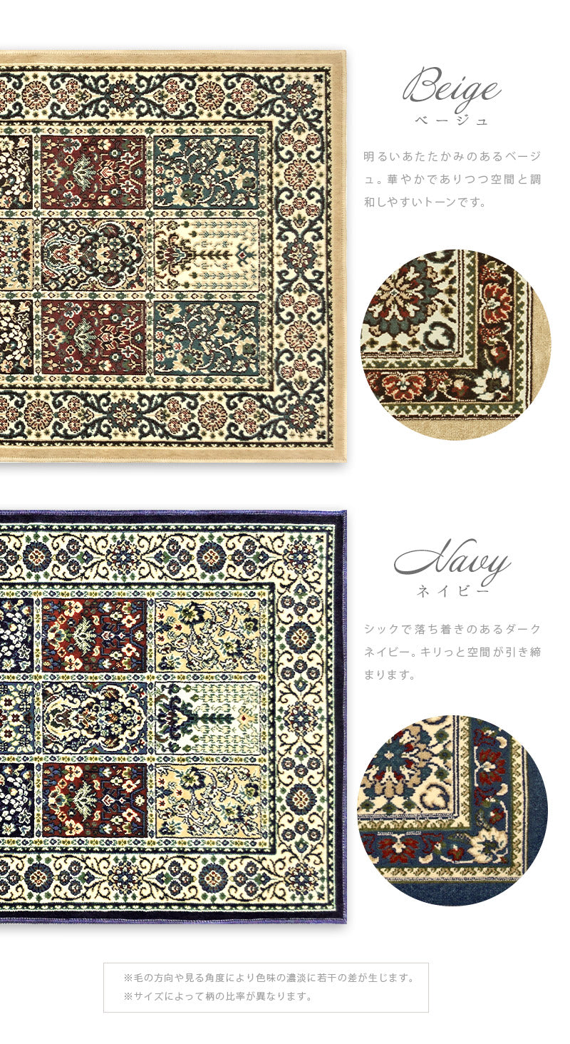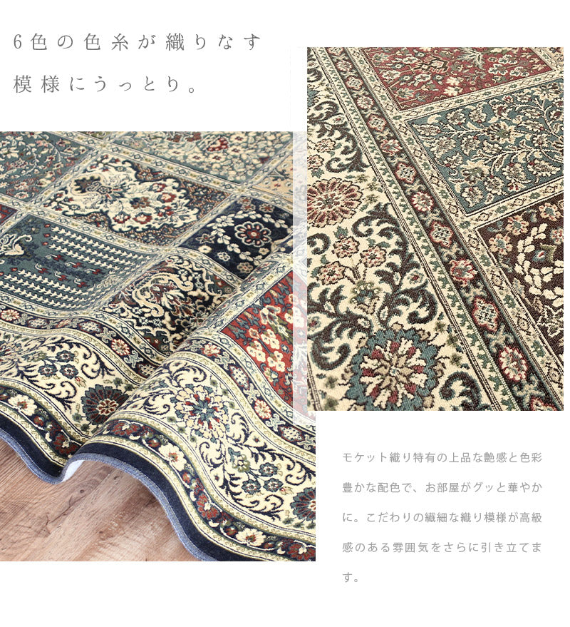 日本国内の老舗メーカーで丁寧につくられた織りでは珍しい6色の色糸がふんだんに使われた豪華絢爛なデザイン。こだわりの繊細な織り模様が高級感のある雰囲気をさらに引き立てます。モケット織りのラグマットは高密度かつ毛足の短いパイルの滑らかな断面で触り心地がよく、丈夫で耐久性がありつつ軽量で柔らかいので扱いやすいのが特徴の高級ラグです。密度があって毛足が短いとゴミが入り込みにくく汚れに強いのでお手入れ簡単◎サラサラなパイルはへたりにくく夏場の蒸し暑い時期も肌に張り付かず、冬は冷たい床をしっかりカバーしてくれるのでオールシーズン快適にお使いいただけます。また天然素材を使用した抗菌防臭加工を施し、デリケートなお肌の方でも安心です。
