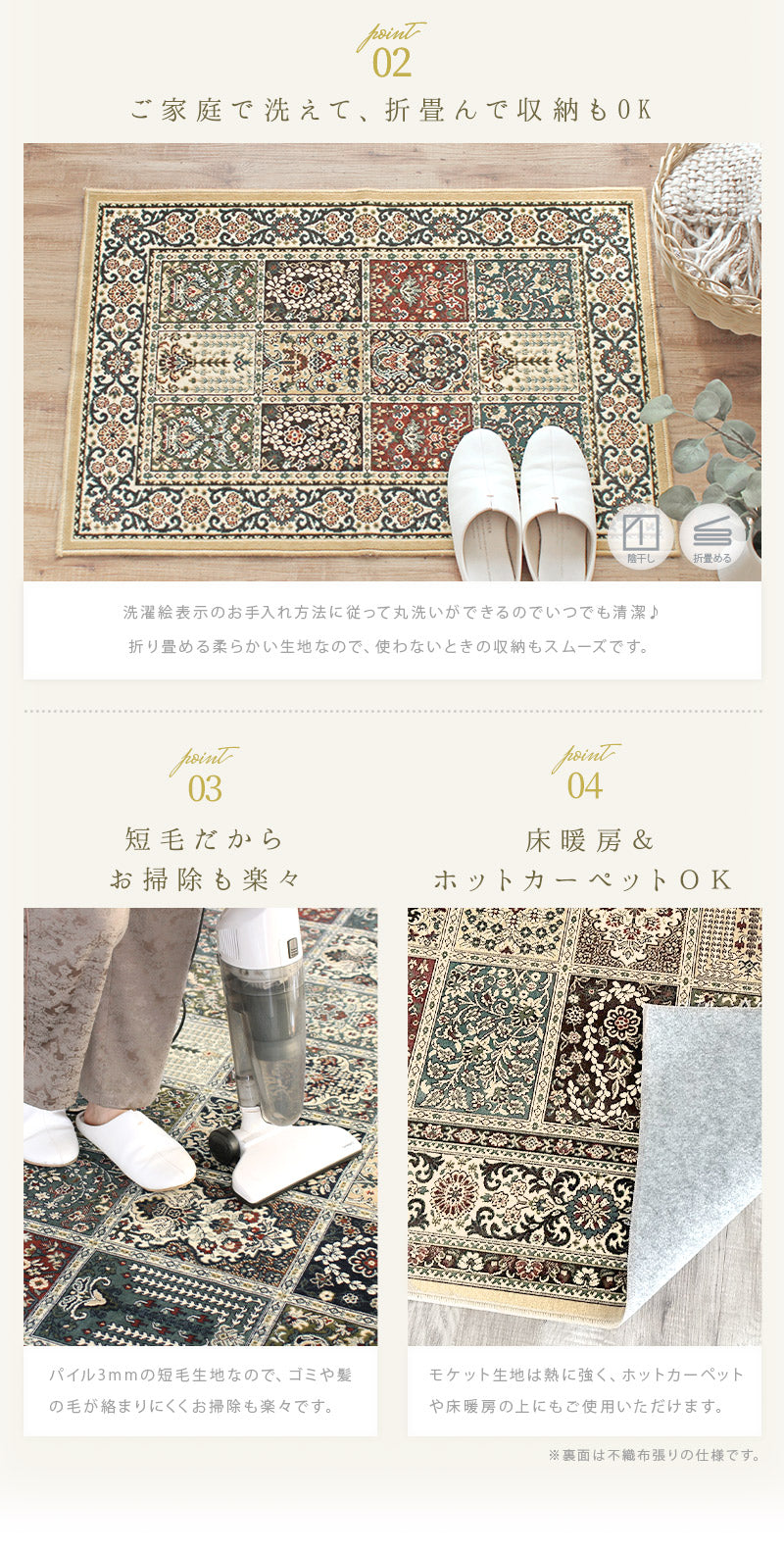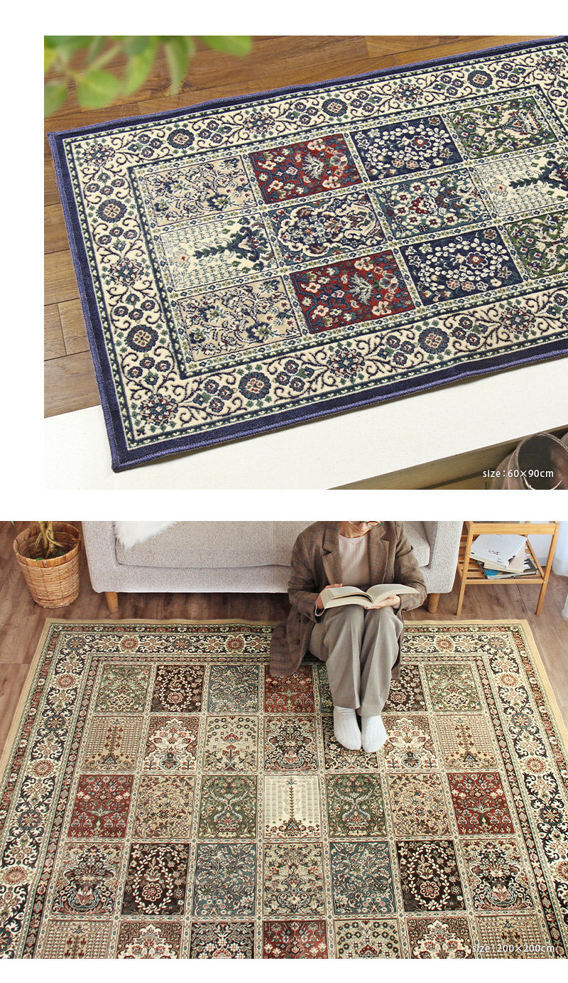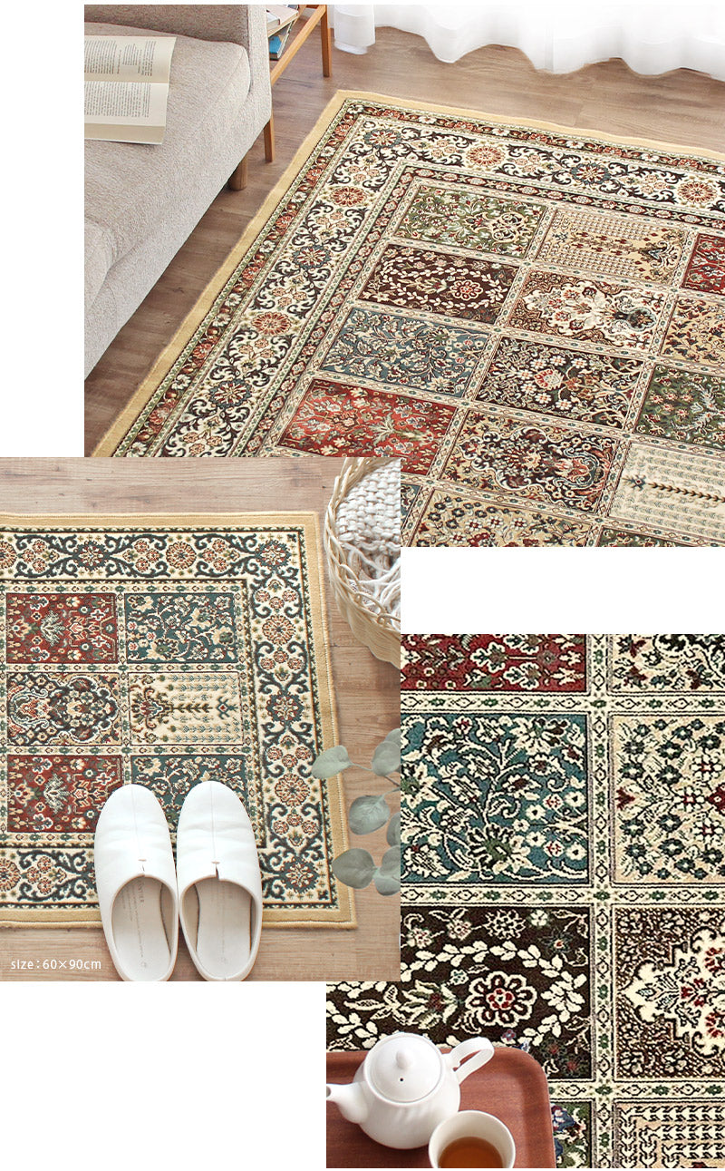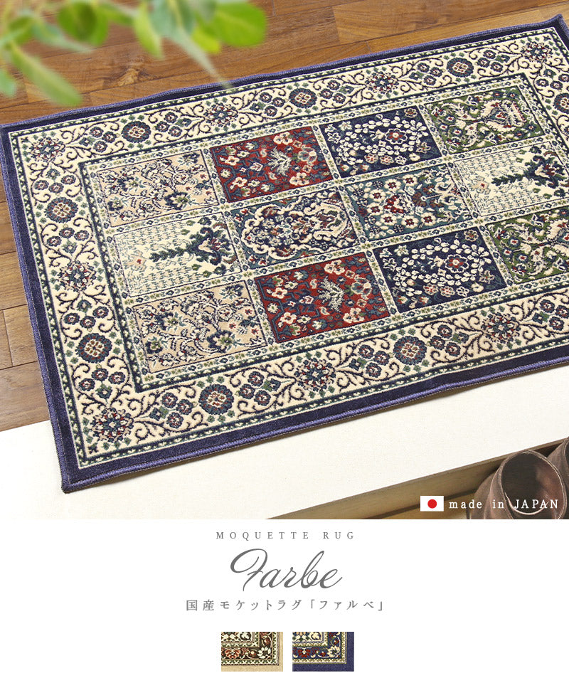 日本国内の老舗メーカーで丁寧につくられた織りでは珍しい6色の色糸がふんだんに使われた豪華絢爛なデザイン。こだわりの繊細な織り模様が高級感のある雰囲気をさらに引き立てます。モケット織りのラグマットは高密度かつ毛足の短いパイルの滑らかな断面で触り心地がよく、丈夫で耐久性がありつつ軽量で柔らかいので扱いやすいのが特徴の高級ラグです。密度があって毛足が短いとゴミが入り込みにくく汚れに強いのでお手入れ簡単◎サラサラなパイルはへたりにくく夏場の蒸し暑い時期も肌に張り付かず、冬は冷たい床をしっかりカバーしてくれるのでオールシーズン快適にお使いいただけます。また天然素材を使用した抗菌防臭加工を施し、デリケートなお肌の方でも安心です。