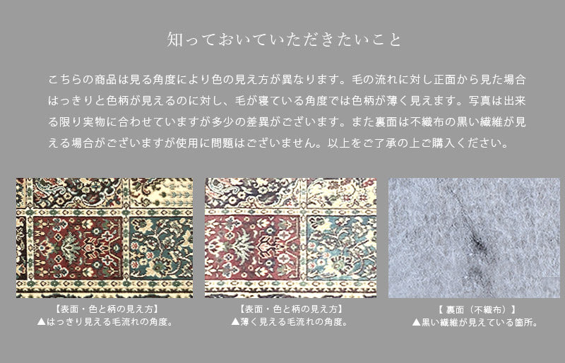 | 注意事項 | 毛の方向や見る角度により色味の濃淡に若干の差が生じます。 サイズによって柄の比率が異なります。 |