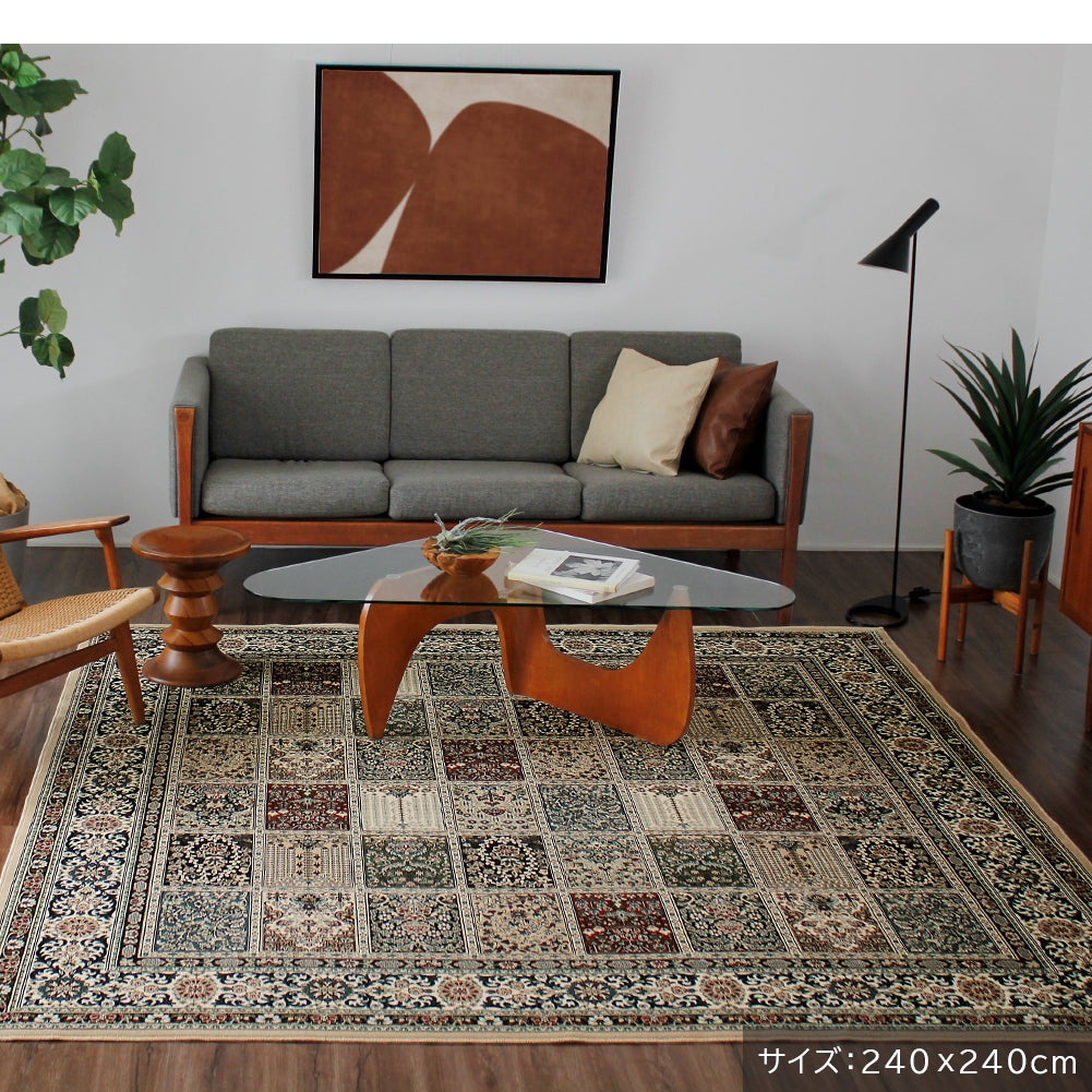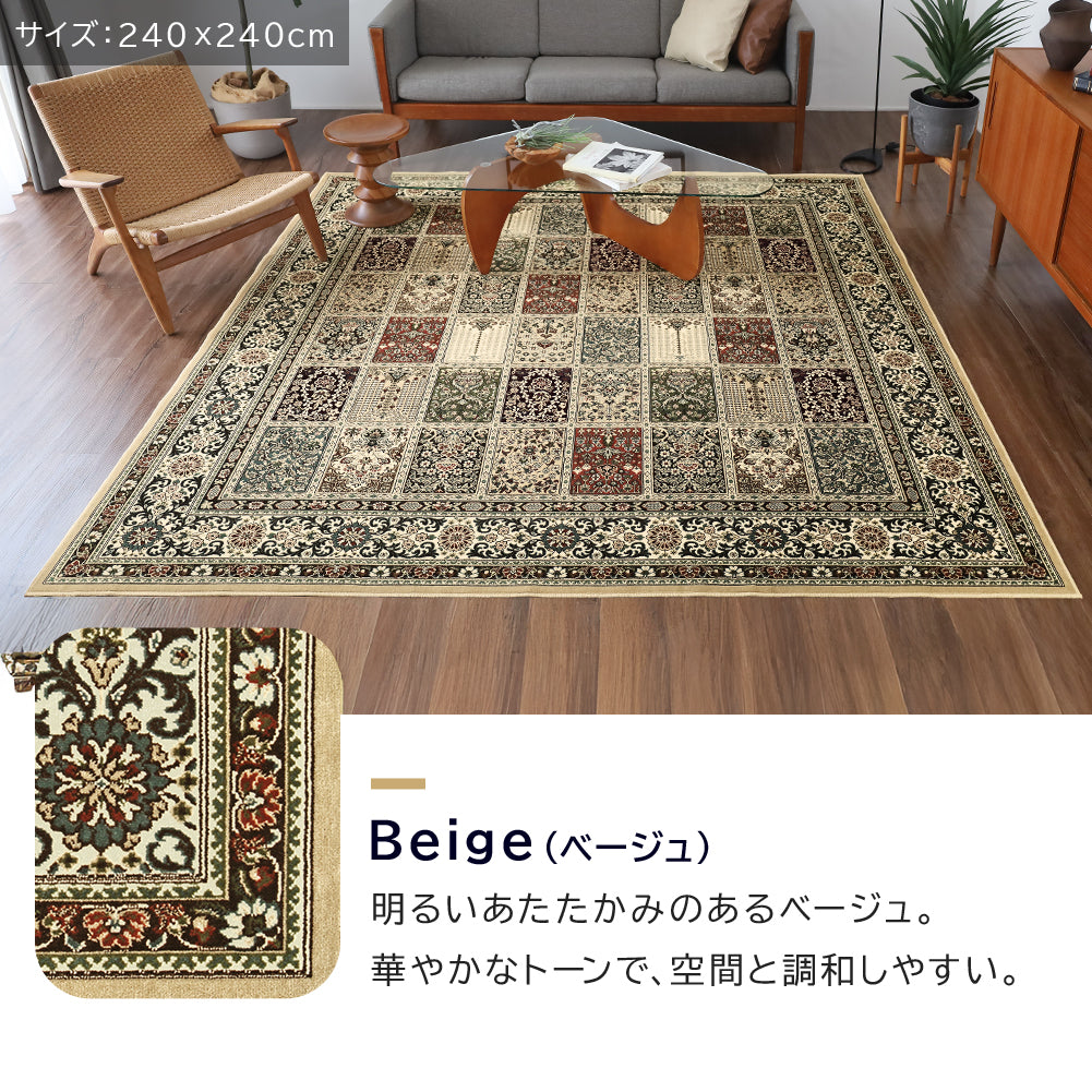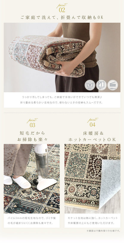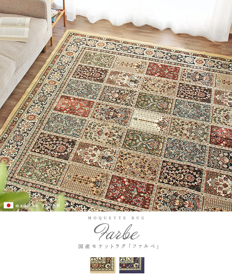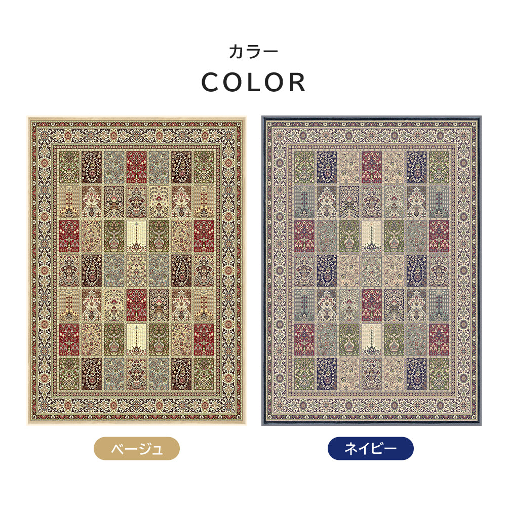 日本国内の老舗メーカーで丁寧につくられた織りでは珍しい6色の色糸がふんだんに使われた豪華絢爛なデザイン。こだわりの繊細な織り模様が高級感のある雰囲気をさらに引き立てます。モケット織りのラグマットは高密度かつ毛足の短いパイルの滑らかな断面で触り心地がよく、丈夫で耐久性がありつつ軽量で柔らかいので扱いやすいのが特徴の高級ラグです。密度があって毛足が短いとゴミが入り込みにくく汚れに強いのでお手入れ簡単◎サラサラなパイルはへたりにくく夏場の蒸し暑い時期も肌に張り付かず、冬は冷たい床をしっかりカバーしてくれるのでオールシーズン快適にお使いいただけます。また、抗菌防臭加工を施し、デリケートなお肌の方でも安心です。