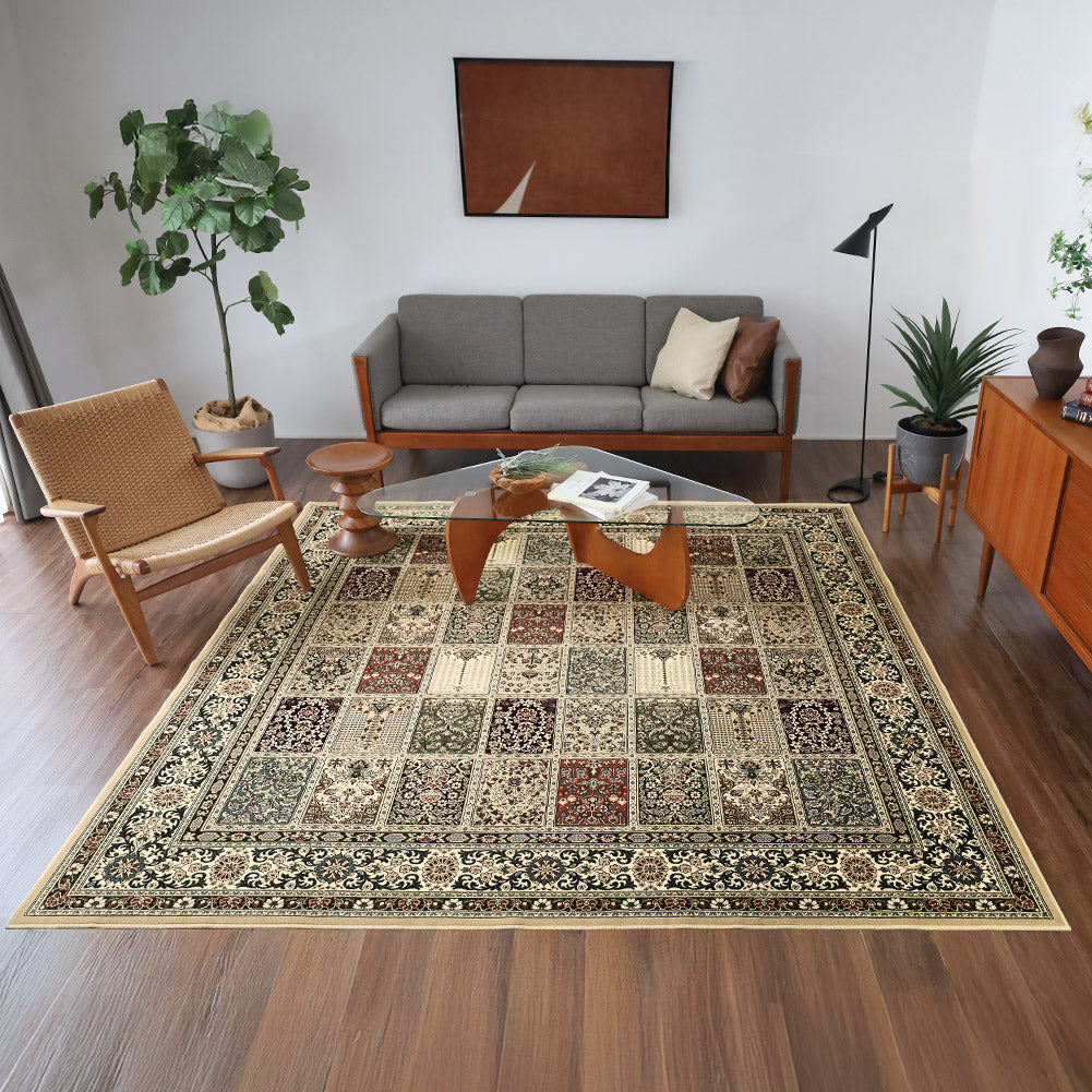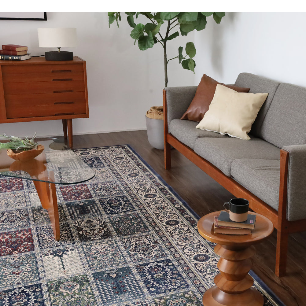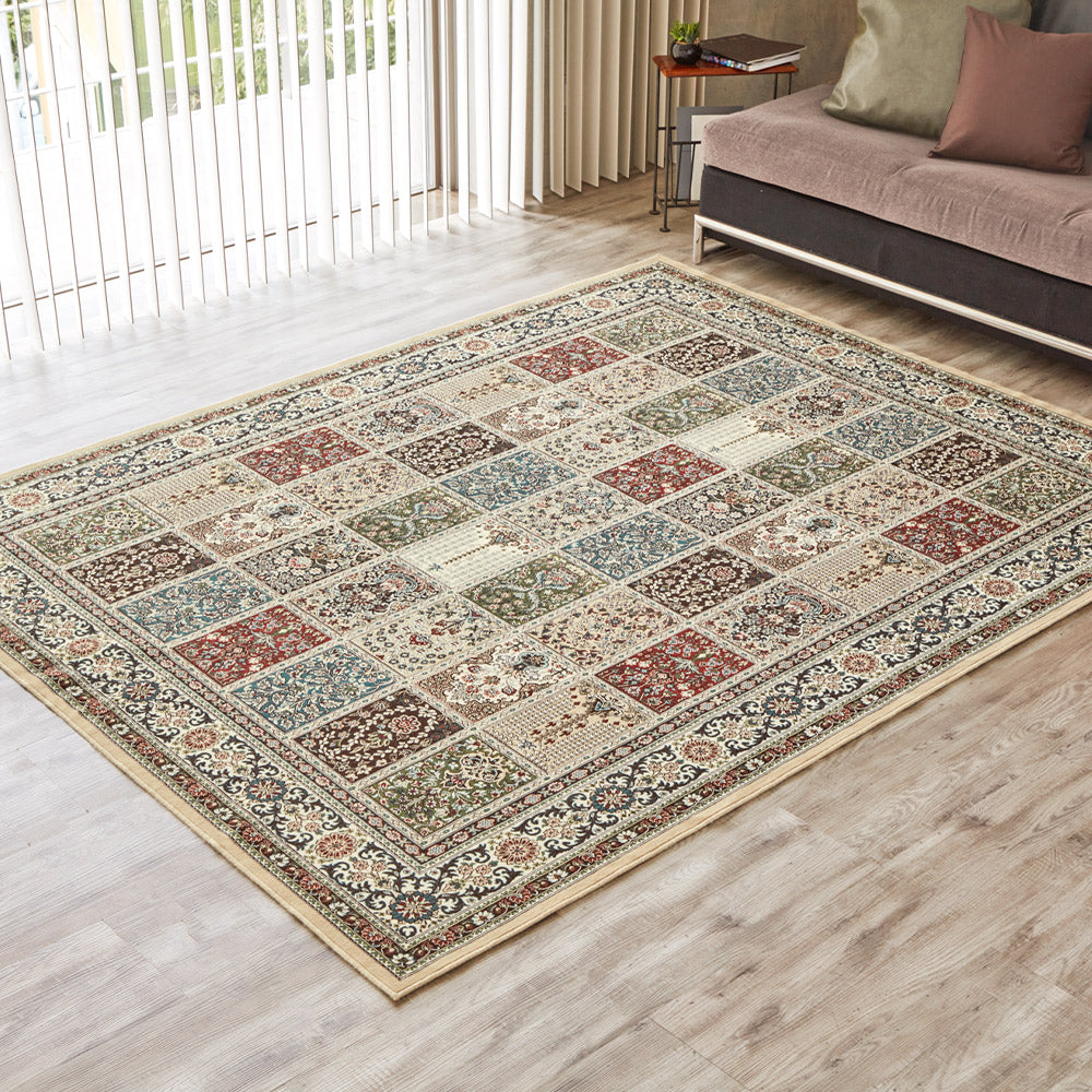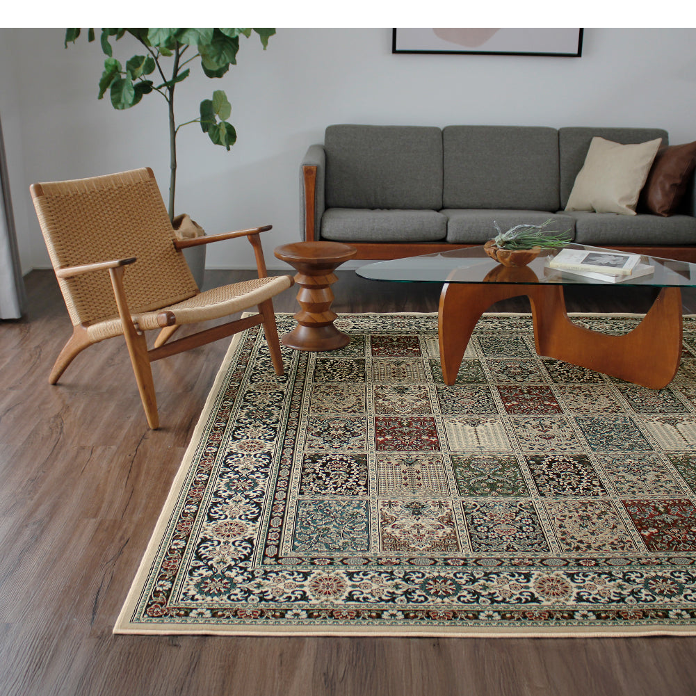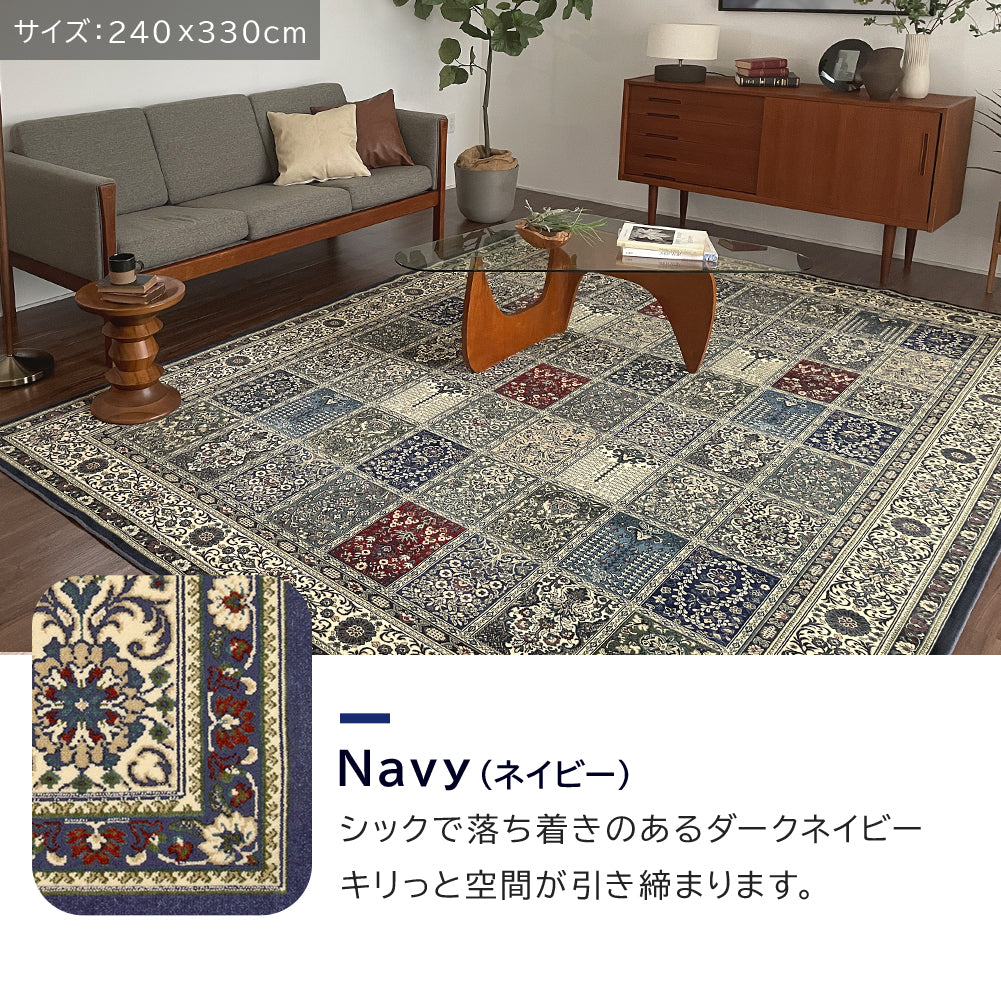 日本国内の老舗メーカーで丁寧につくられた織りでは珍しい6色の色糸がふんだんに使われた豪華絢爛なデザイン。こだわりの繊細な織り模様が高級感のある雰囲気をさらに引き立てます。モケット織りのラグマットは高密度かつ毛足の短いパイルの滑らかな断面で触り心地がよく、丈夫で耐久性がありつつ軽量で柔らかいので扱いやすいのが特徴の高級ラグです。密度があって毛足が短いとゴミが入り込みにくく汚れに強いのでお手入れ簡単◎サラサラなパイルはへたりにくく夏場の蒸し暑い時期も肌に張り付かず、冬は冷たい床をしっかりカバーしてくれるのでオールシーズン快適にお使いいただけます。また、抗菌防臭加工を施し、デリケートなお肌の方でも安心です。