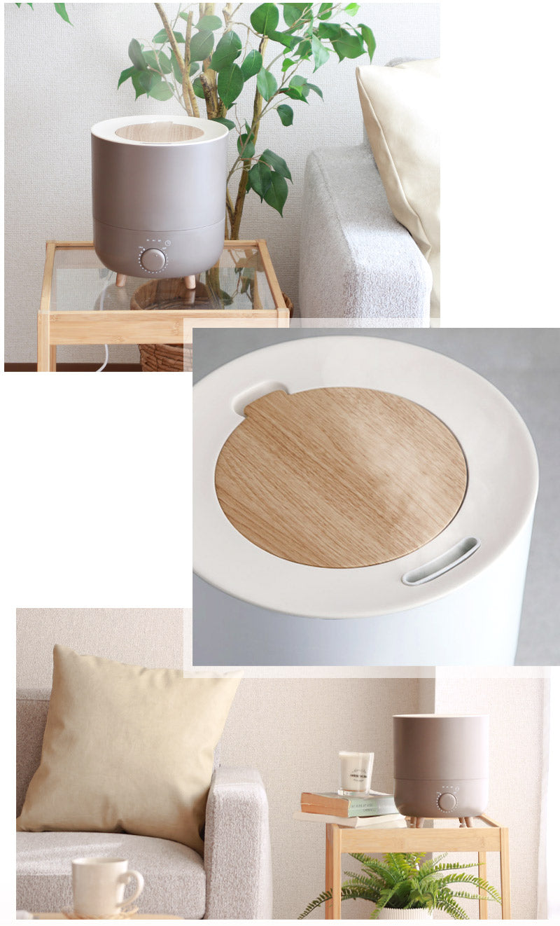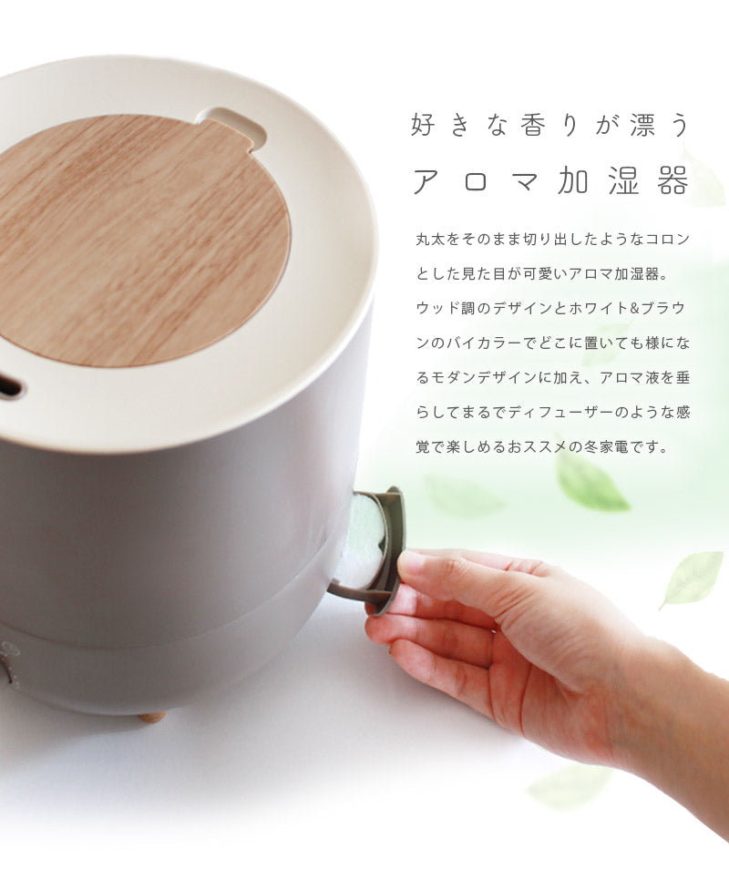 丸太をそのまま切り出したようなコロンとした見た目が可愛いアロマ加湿器。ウッド調の蓋と脚にホワイト&ブラウンのバイカラーでどこに置いても様になるモダンデザイン◎インテリアに合うのでリビングなど目につく場所で使っても気になりません。稼働音の静かな超音波式なので寝室や赤ちゃんのお昼寝タイムの加湿にぴったり。専用のアロマパッドにお手持ちのアロマ液を垂らせば、まるでディフューザーのような感覚で楽しめるおススメの冬家電です。
