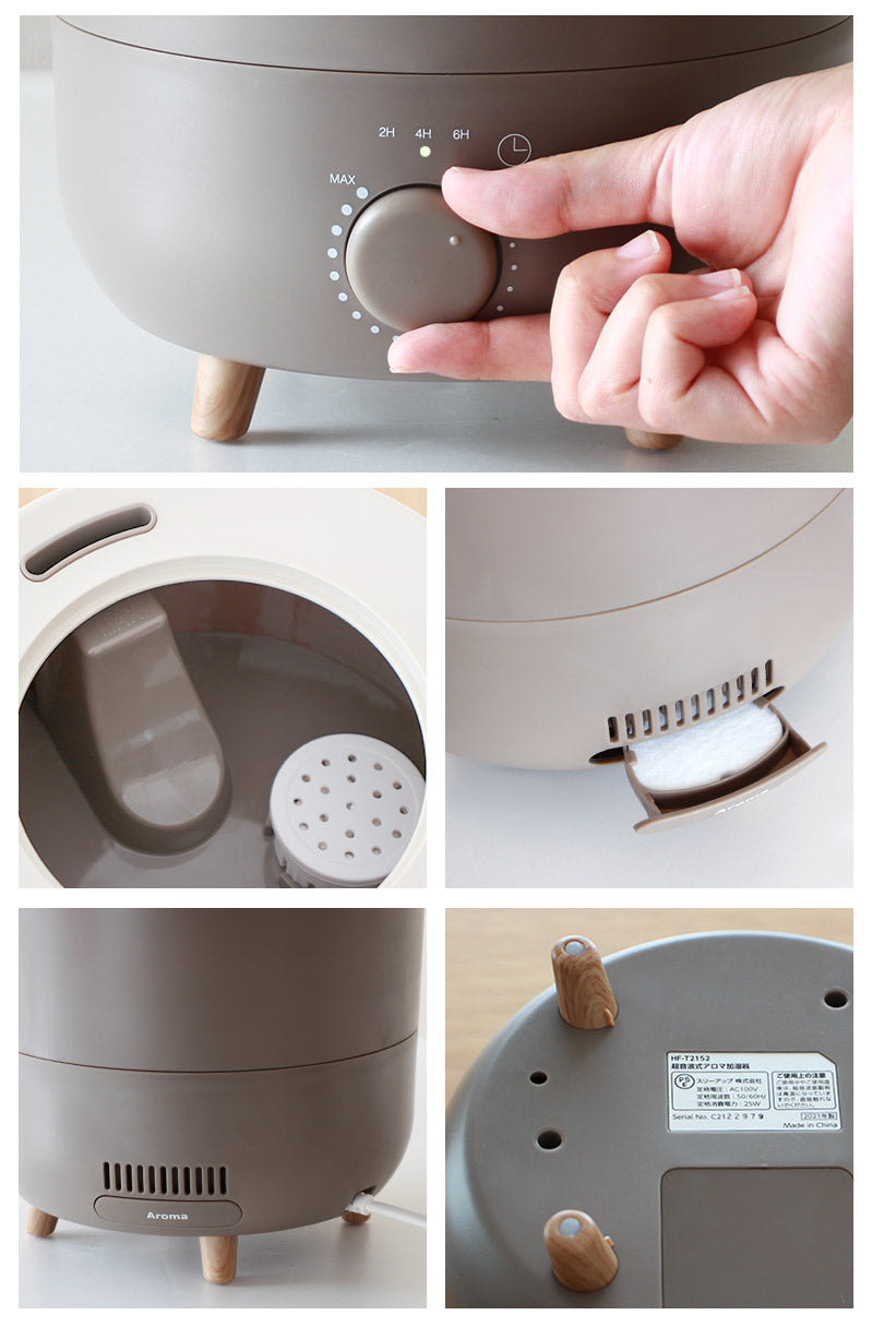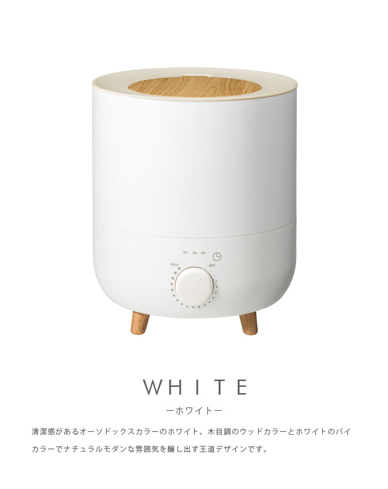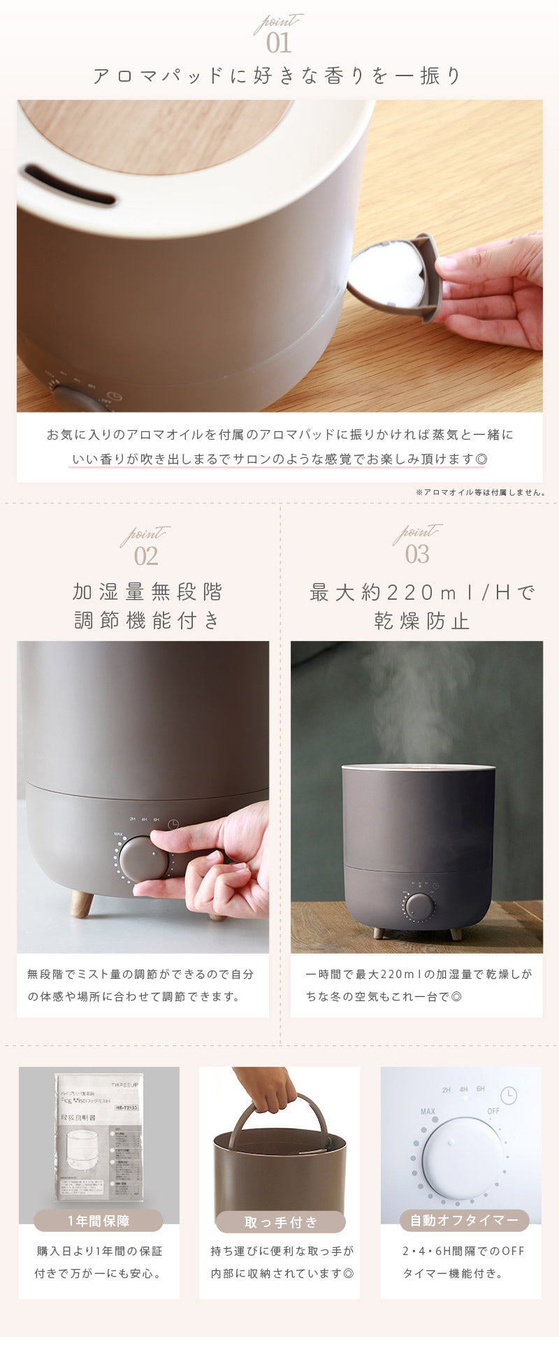| 備考 | ●たっぷり大容量タンク2L ●ミスト量無段階調節 ●2h/4h/6hオフタイマー ●アロマが楽しめる専用パッド付き ※アロマオイルは付属しません |