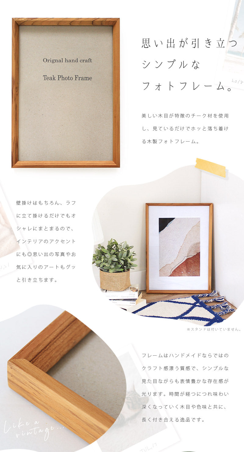 美しい木目が特徴のチーク材を使用し、見ているだけでホッと落ち着ける木製フォトフレームです。壁掛けはもちろん、ラフに立て掛けるだけでもオシャレにまとまるので、インテリアのアクセントにもぴったり◎思い出の写真やお気に入りのアートもグッと引き立ちます。フレームはハンドメイドならではのクラフト感漂う質感で、シンプルな見た目ながらも表情豊かな存在感が光ります。時間が経つにつれ味わい深くなっていく木目や色味と共に、長く付き合える逸品です。