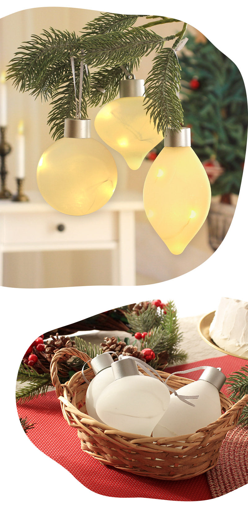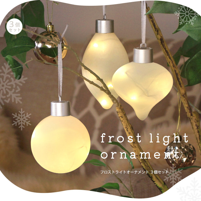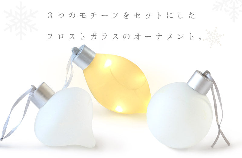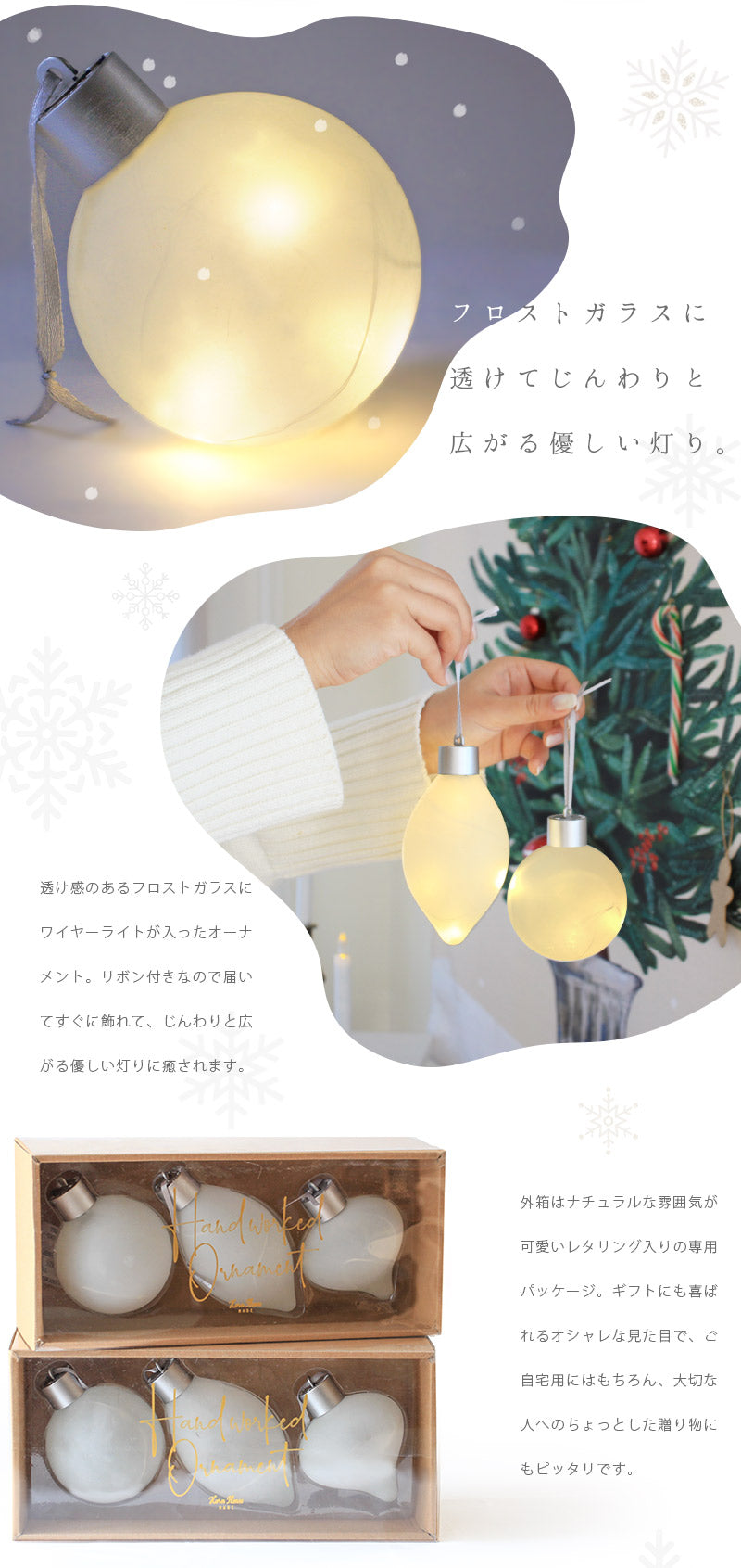 透け感のあるフロストガラスにワイヤーライトが入ったオーナメント。リボン付きなので届いてすぐに飾れて、じんわりと広がる優しい灯りに癒されます♪それぞれモチーフの異なる3つのオーナメントがセットになっており、外箱はナチュラルな雰囲気が可愛いレタリング入りの専用パッケージ。ギフトにも喜ばれるオシャレな見た目で、ご自宅用にはもちろん、大切な人へのちょっとした贈り物にもピッタリです。