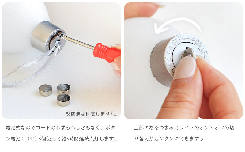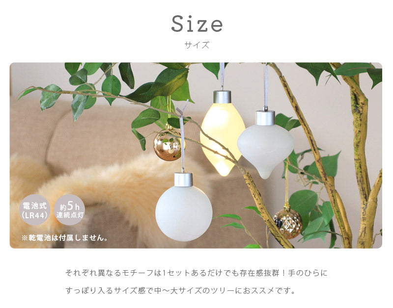| 備考 | ●電池式(LR44×3個使用)※電池は付属しません。 ●オーナメント1つにつき電池3つ使用。 ●約5時間連続点灯(ライトの光が徐々に弱くなります) |