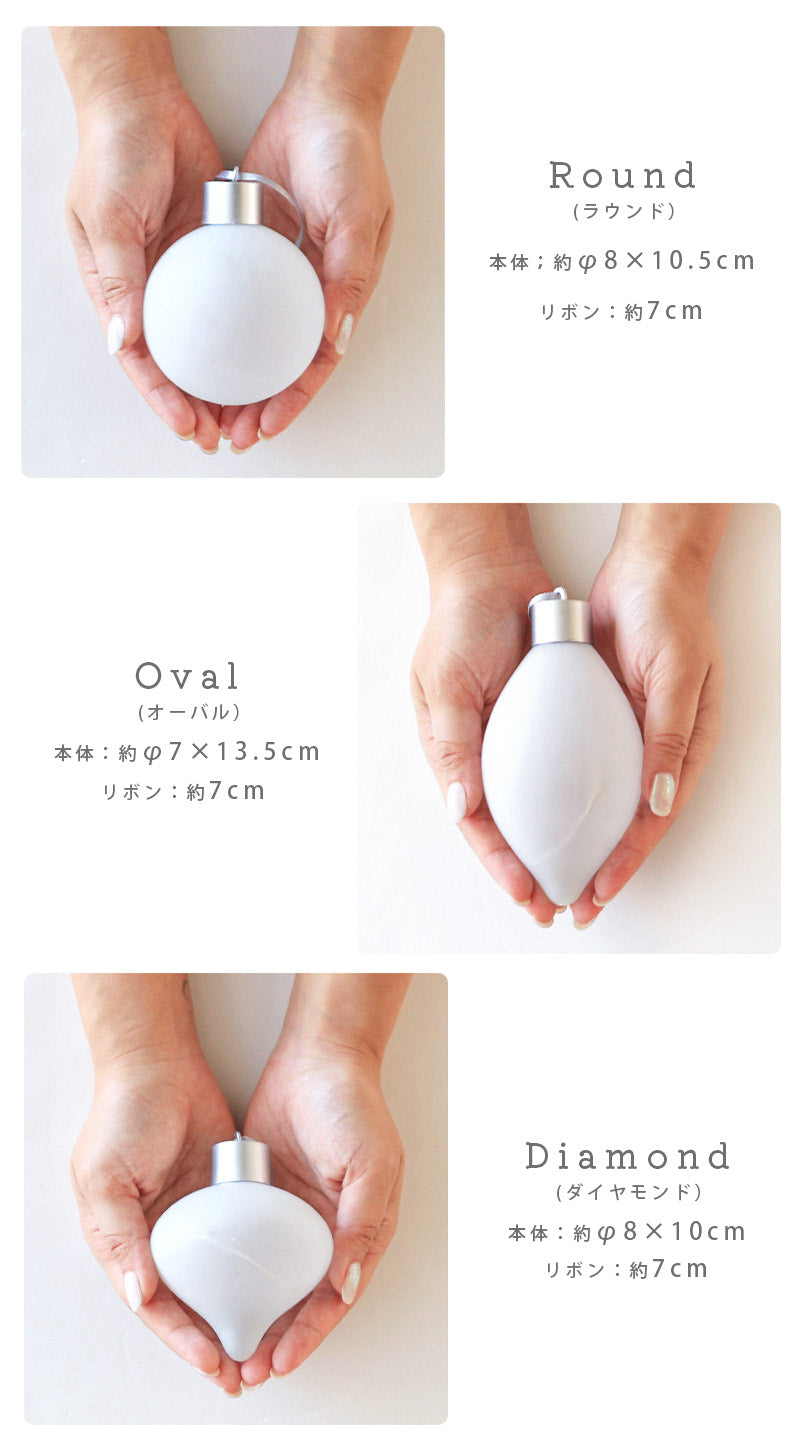 | サイズ | ラウンド:φ8×H10.5cm オーバル:φ7×H13.5cm ダイヤモンド:φ8×H10cm リボン:各約7cm |