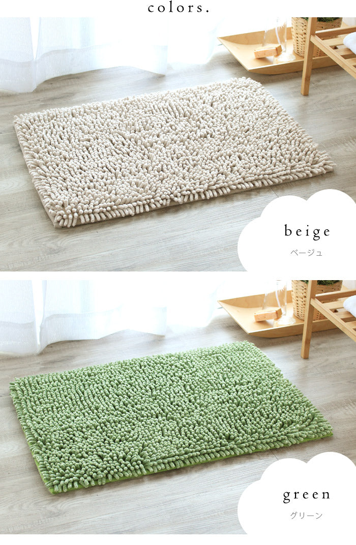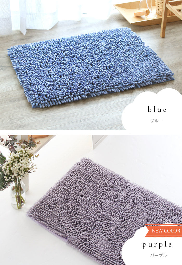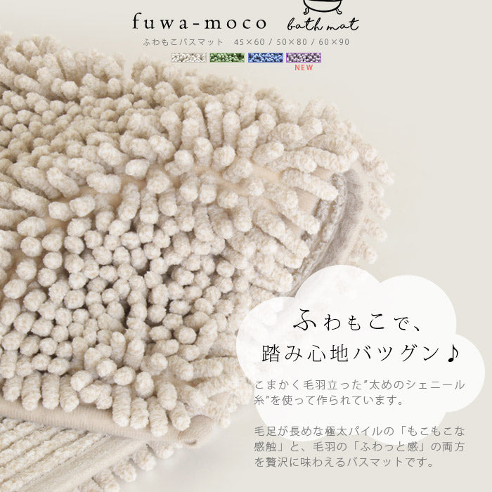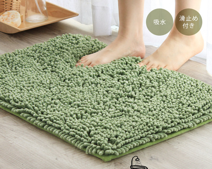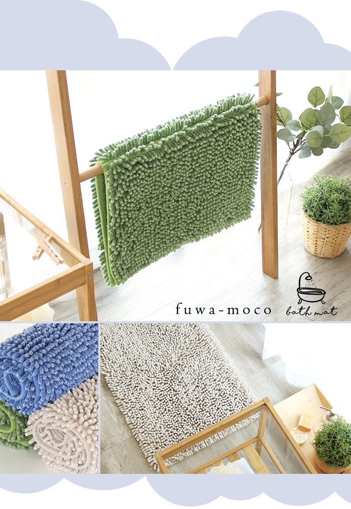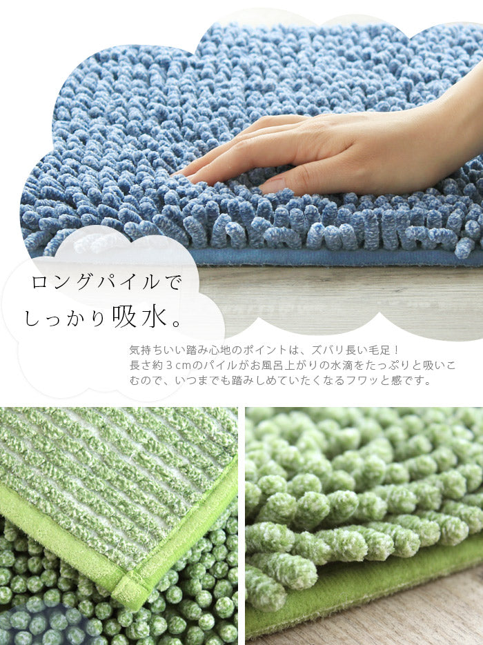 気持ちいい踏み心地のポイントは、ズバリ長い毛足!長さ約3cmのパイルがお風呂上がりの水滴をたっぷりと吸いこむので、いつまでも踏みしめていたくなるフワッと感です。さらに、このバスマットは細かく毛羽立った”太めのシェニール糸”を使って作られているので、毛足が長めな極太パイルの「もこもこな感触」と毛羽の「ふわっと感」の両方を贅沢に味わえます。