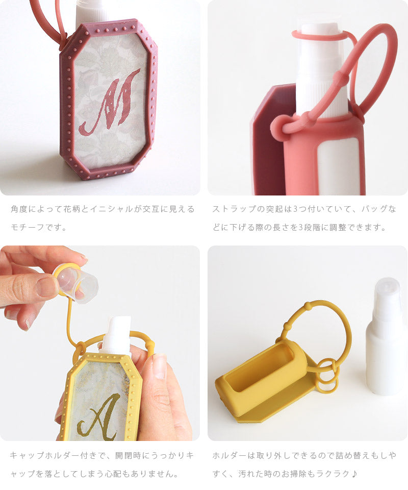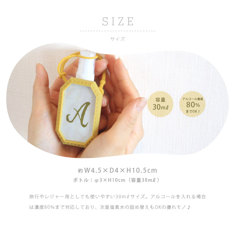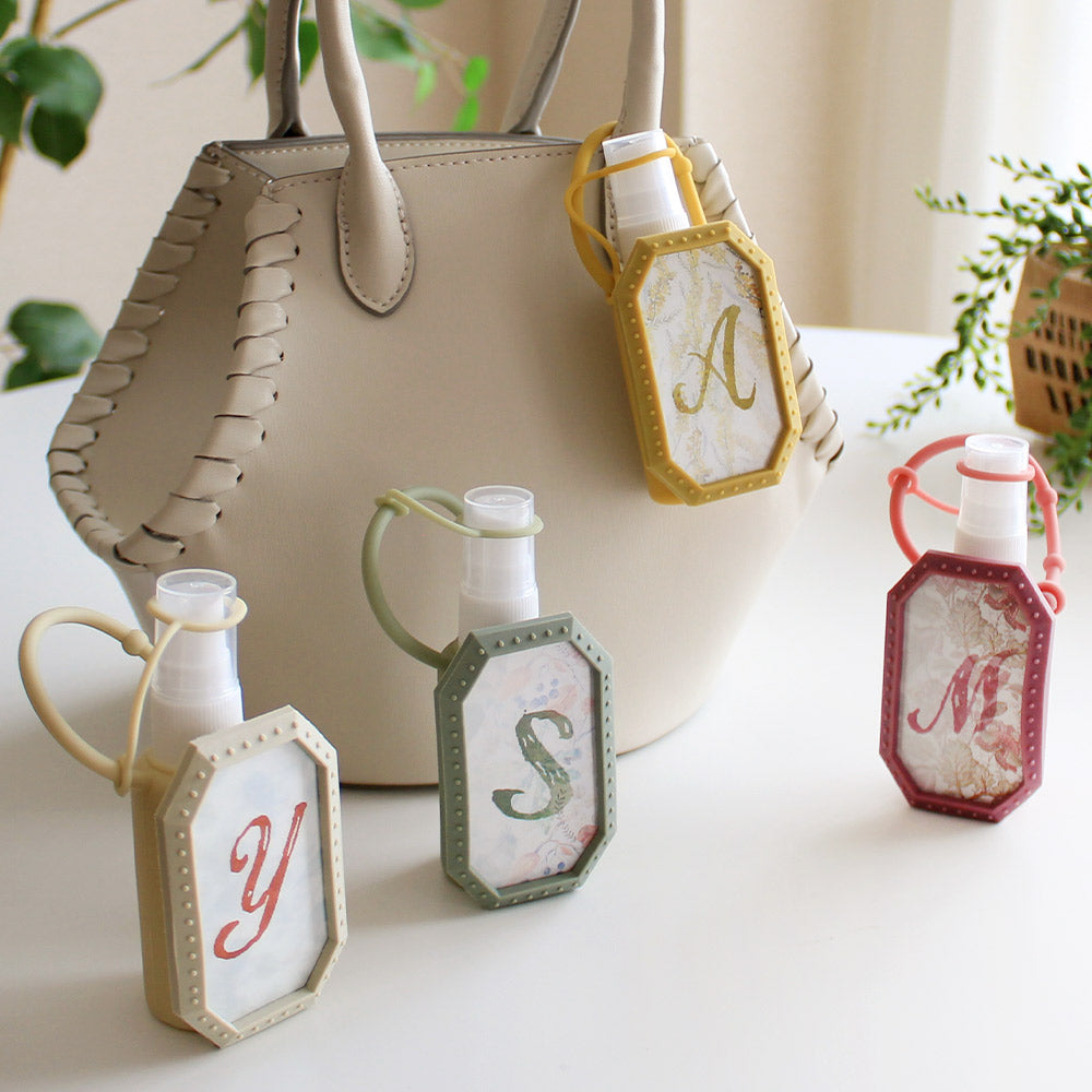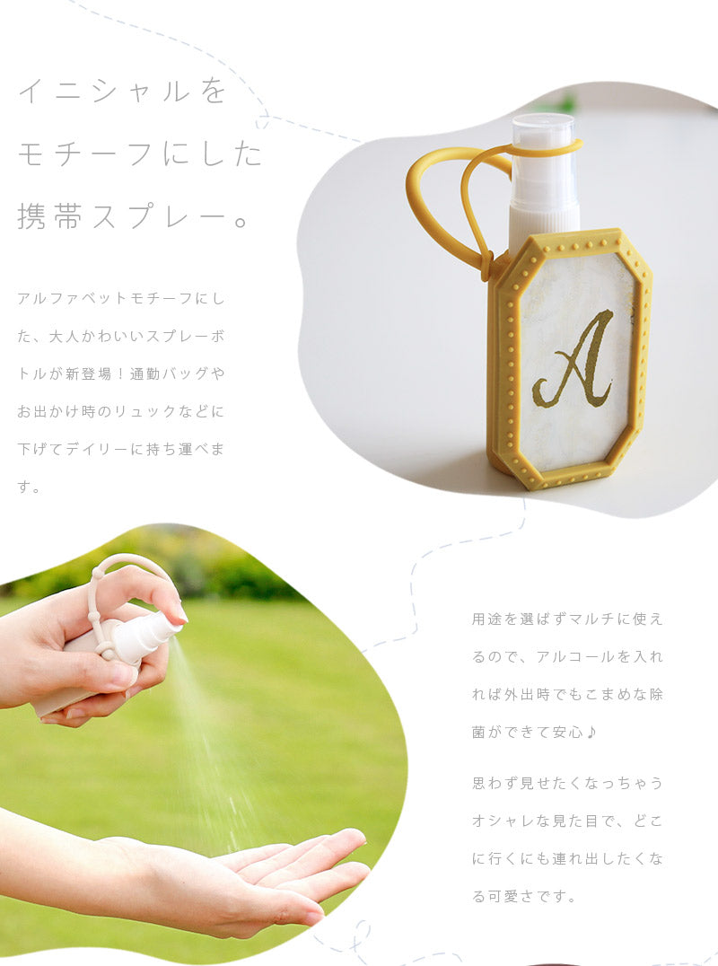 アルファベットモチーフにした、大人かわいいスプレーボトルが新登場!通勤バッグやお出かけ時のリュックなどに下げてデイリーに持ち運べます。アルコール消毒液を入れれば外出時でもこまめな除菌ができて、手の消毒はもちろん、マスクや外食時のテーブルなど、いつでもシュッと吹きかけて除菌できちゃう♪