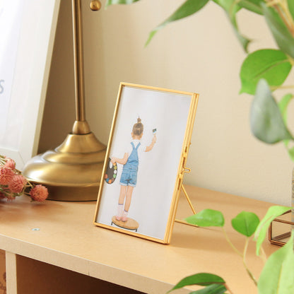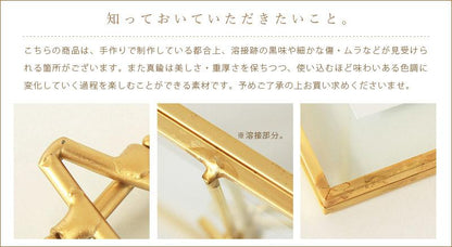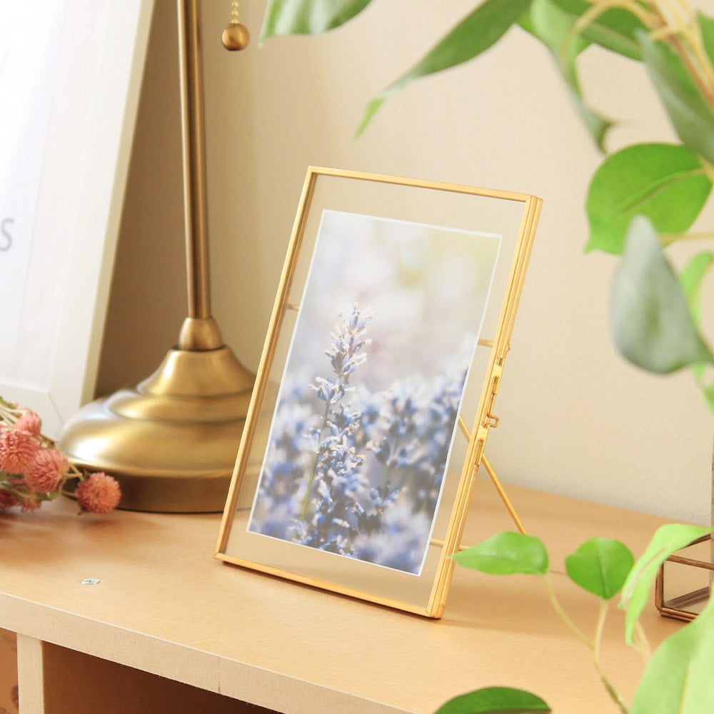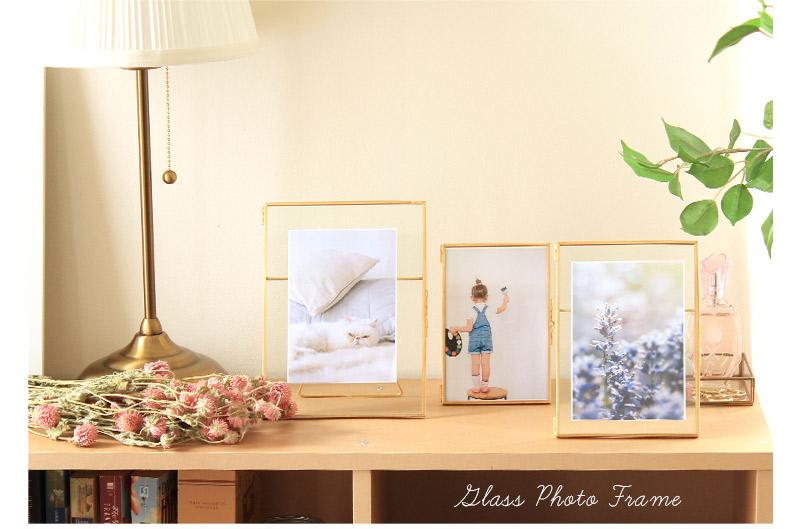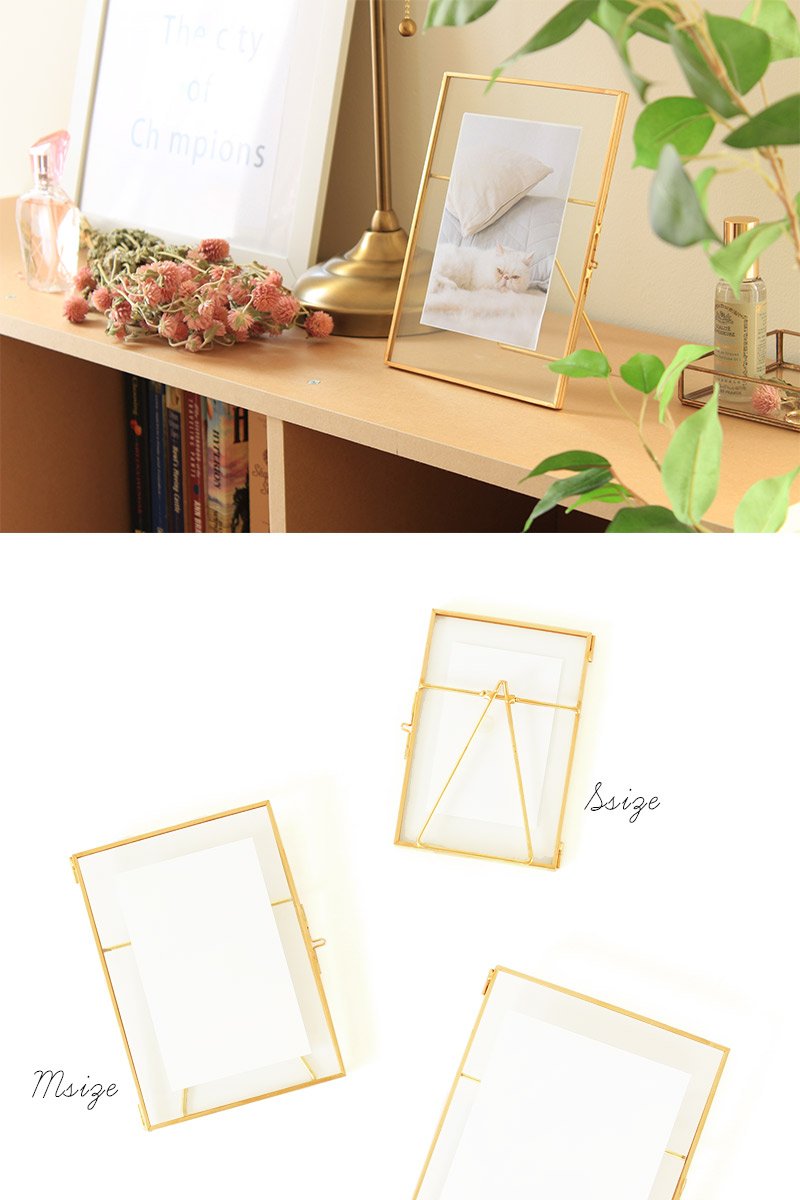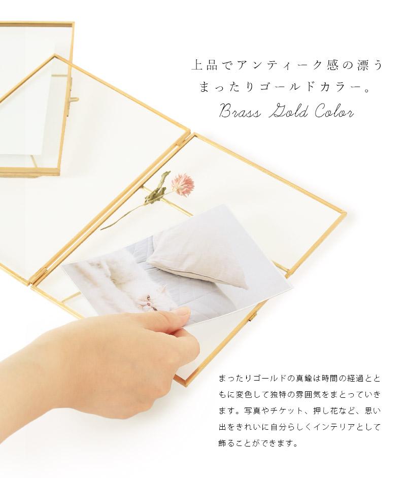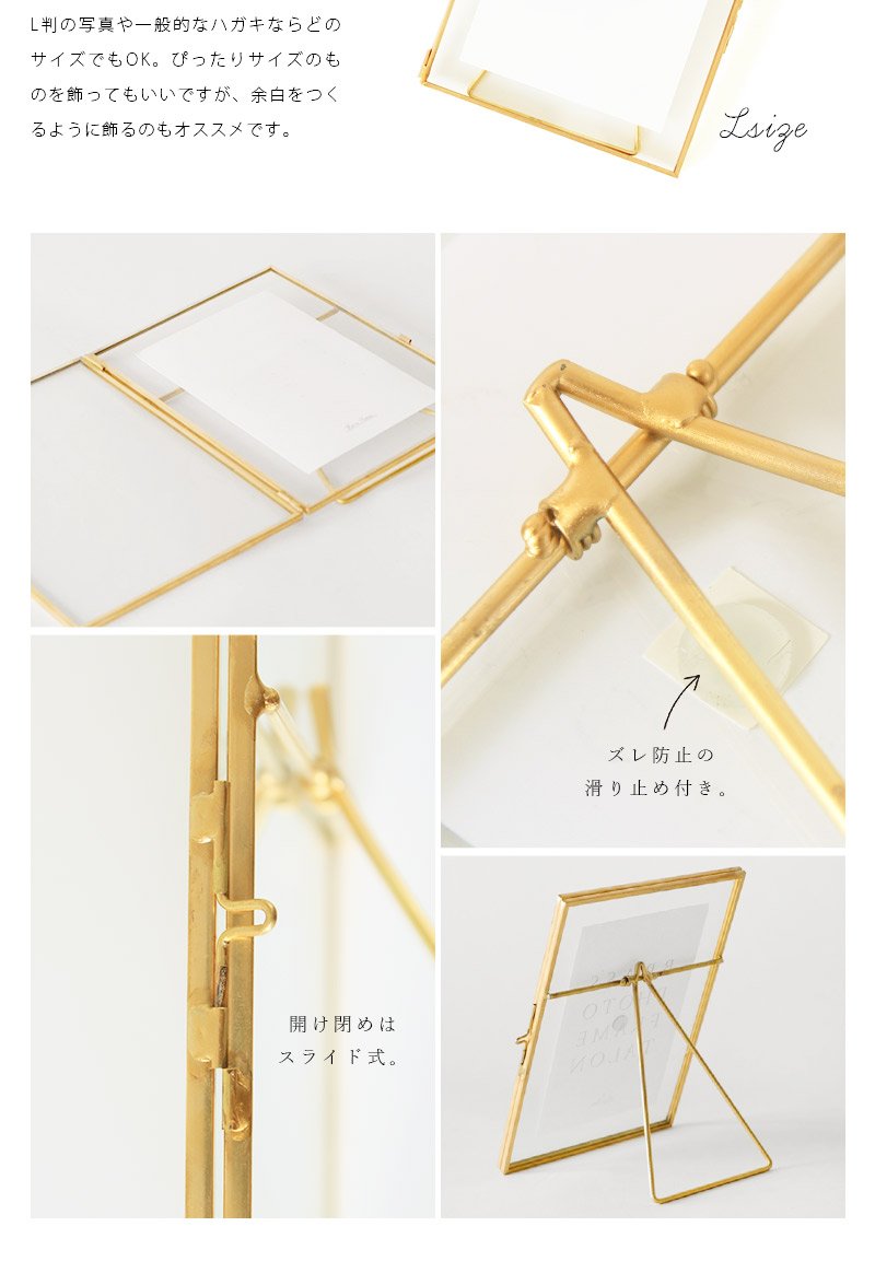 まったりゴールドの真鍮は時間の経過とともに変色して独特の雰囲気をまとっていきます。写真やチケット、押し花など、思い出をきれいに自分らしくインテリアとして飾ることができます。L判の写真や一般的なハガキならどのサイズでもOK。ぴったりサイズのものを飾ってもいいですが、余白をつくるように飾るのもオススメです。