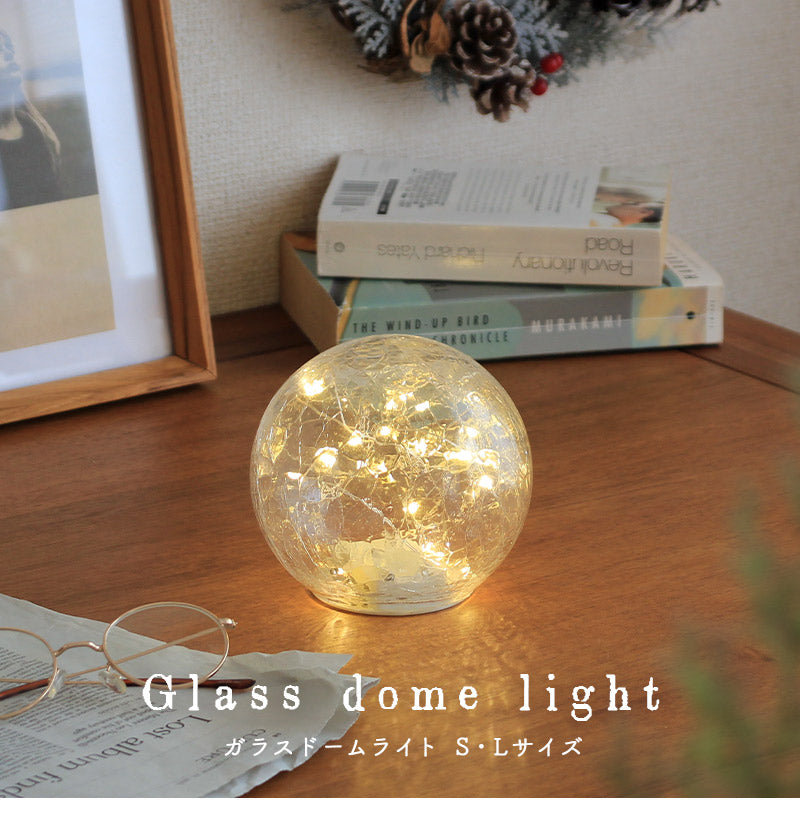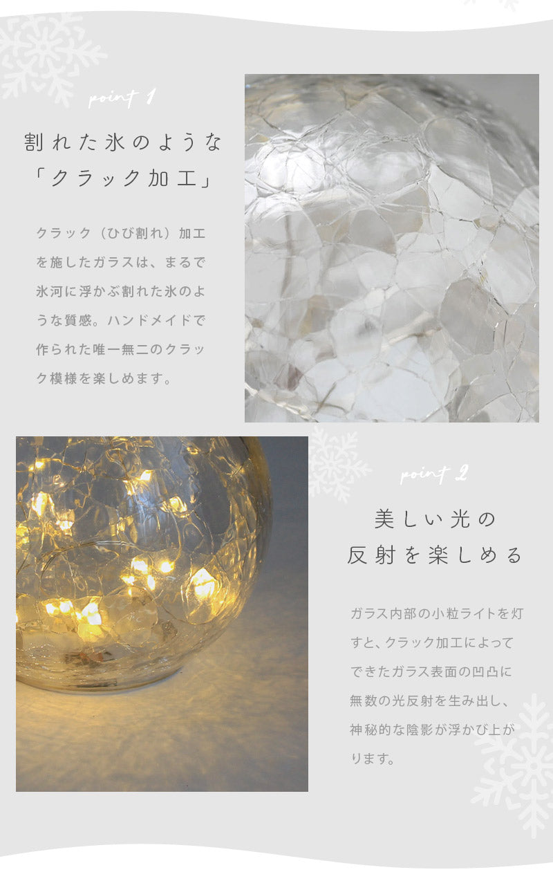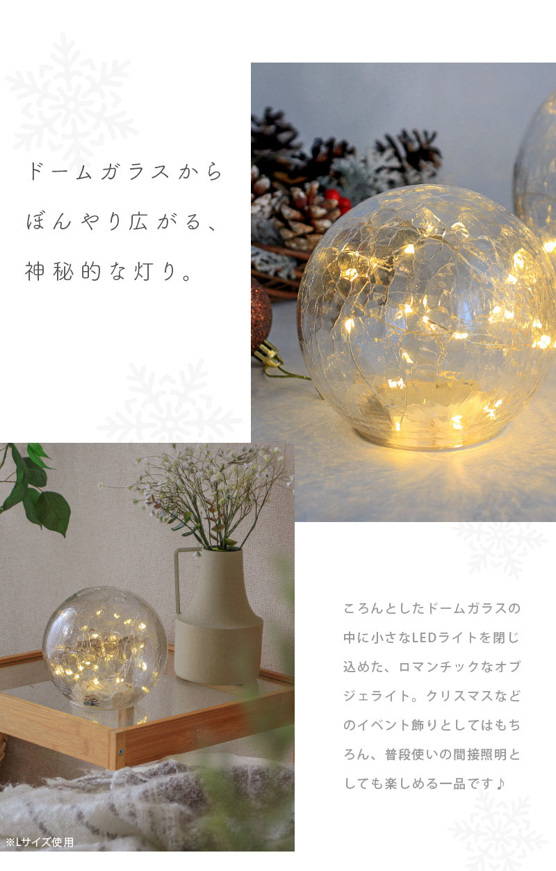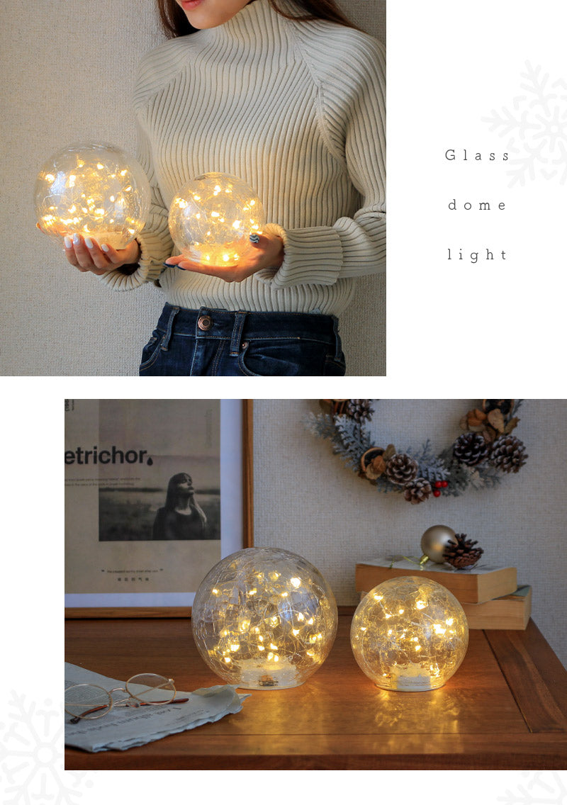 ころんとしたドームガラスの中に小さなLEDライトを閉じ込めた、ロマンチックなオブジェライト。クリスマスなどのイベント飾りとしてはもちろん、普段使いの間接照明としても楽しめる一品です♪クラック(ひび割れ)加工を施したガラスは、まるで氷河に浮かぶ割れた氷のような質感。ハンドメイドで作られた唯一無二のクラック模様を楽しめます。ガラス内部の小粒ライトを灯すと、クラック加工によってできたガラス表面の凹凸に無数の光反射を生み出し、神秘的な陰影が浮かび上がります。お届けの際はレタリングデザインのお洒落なパッケージに入っているので、大切な人へ贈るギフトにもぴったりです♪